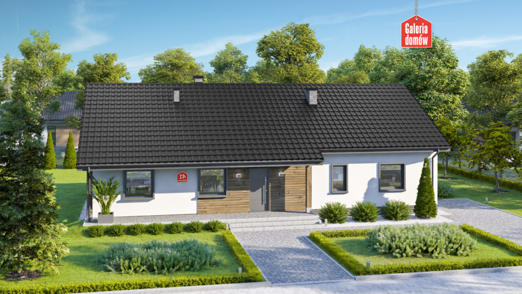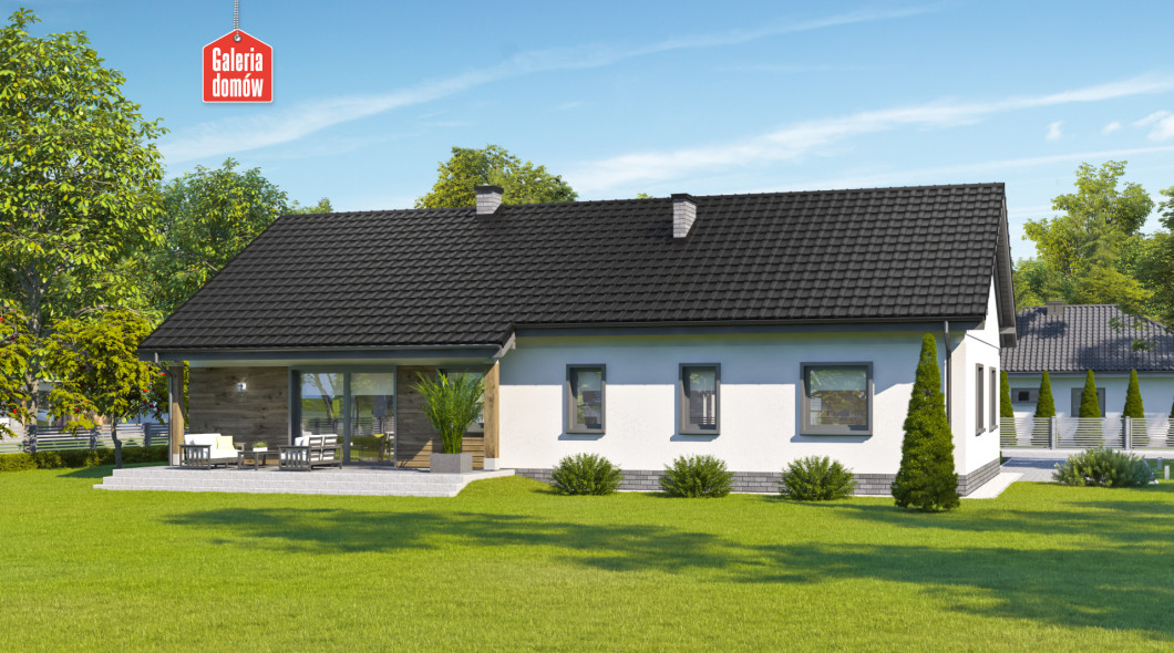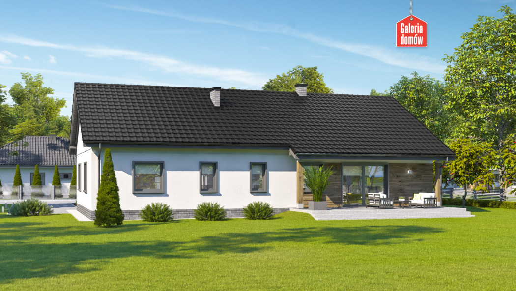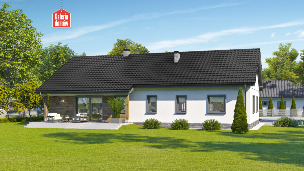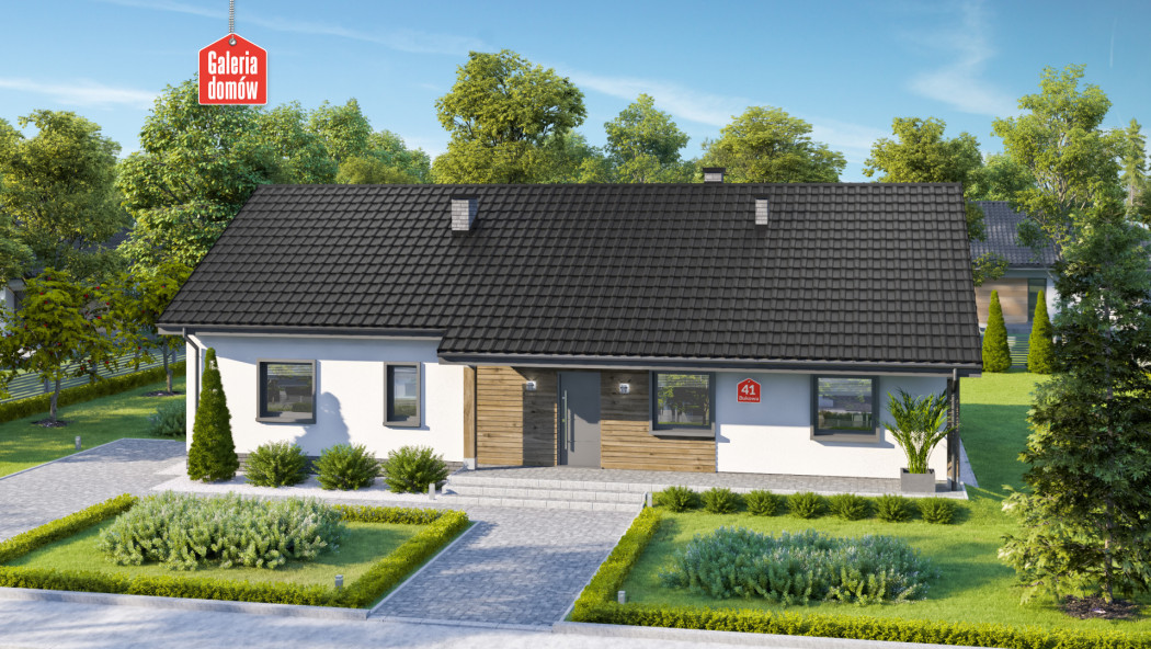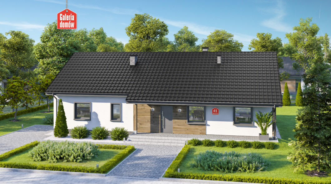Projekt Dom przy Bukowej 41 to dom parterowy, zaprojektowany w technologii murowanej. Dla minimalizacji kosztów zrezygnowano w nim z garażu. Kalenica główna ustawiona jest równolegle do drogi. Układ funkcjonalny jest bogaty i ergonomicznie zaprojektowany. Część nocną tworzą 3 sypialnie, w tym jedna z prywatną łazienką i garderobą. Dodatkowo projekt przewiduje 2 łazienki, gabinet oraz garderobę. Słoneczny livingroom tworzy otwarta kuchnia oraz przestronny salon. Sprawną komunikację z zieloną częścią ogrodu zapewniają szerokie drzwi tarasowe. Kuchnia jest oddzielona od pokoju dziennego barową ladą, co czyni z niej autonomiczną wygodną przestrzeń do pracy. Projekt został zaprojektowany zgodnie z warunkami technicznymi WT 2021. Nowoczesny projekt dużego domu o prostej i oszczędnej konstrukcji. Doskonała propozycja dla wszystkich doceniających otwarty charakter parterowych domów.