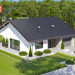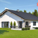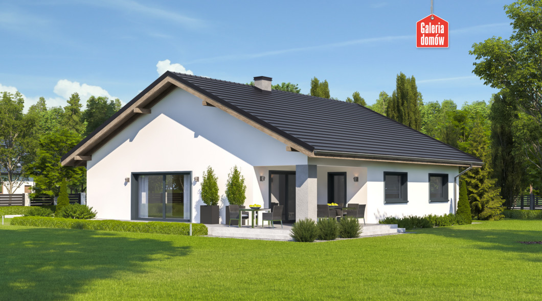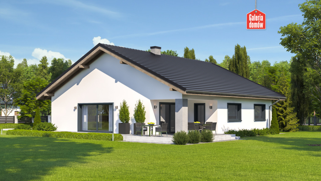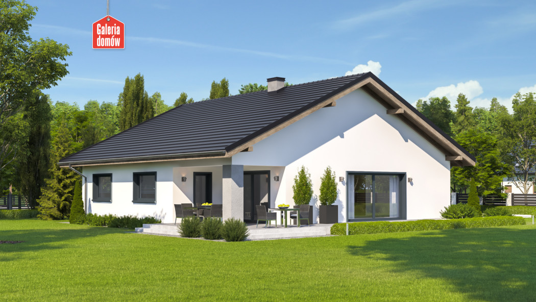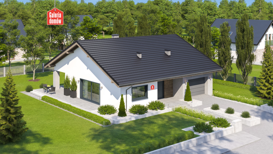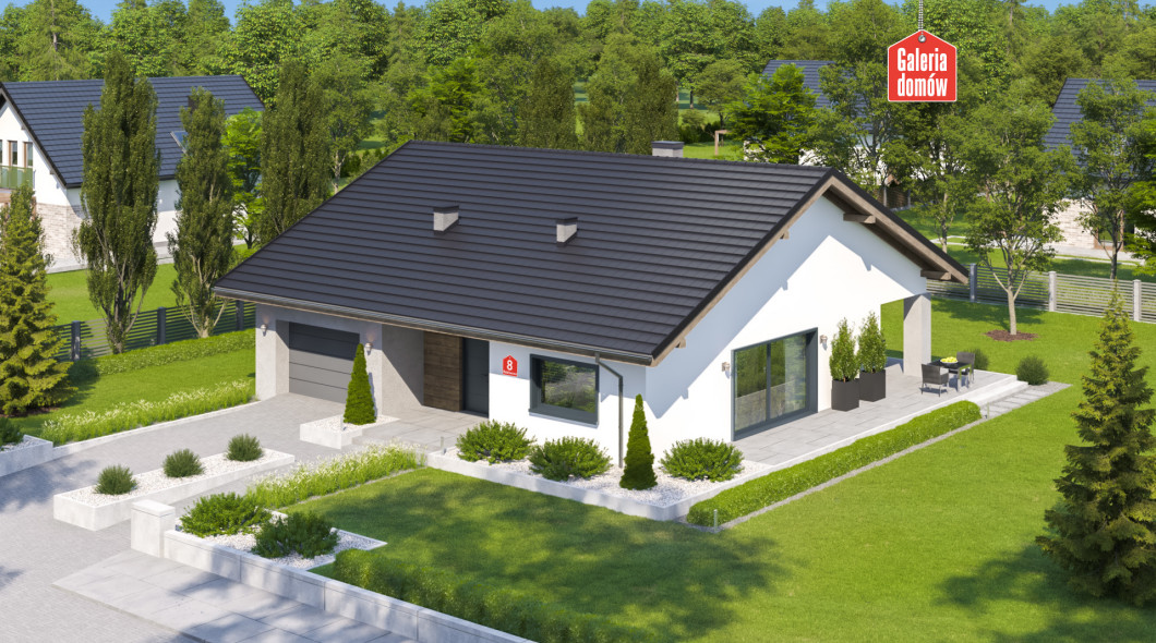 Dom przy Rubinowej 8 to budynek jednorodzinny, parterowy, z dachem dwuspadowym, symetrycznym. Pojedynczy garaż został całkowicie zamknięty w bryle budynku opartego na planie kwadratu. Wykończenie zewnętrzne w oparciu o kontrast bieli i czerni rozbijany ciepłymi elementami drewnianymi. Układ pomieszczeń zakłada w części reprezentacyjnej pokój dzienny z wyjściem na zadaszony taras oraz otwartą kuchnię. Strefę relaksu tworzą trzy sypialnie. Dom posiada również dużą łazienkę oraz mniejszą toaletę. Ponadto do dyspozycji mieszkańców oddano pomieszczenie gospodarcze i kotłownię. Dom przy Rubinowej 8 zaprojektowano w technologii murowanej z drewnianą więźbą tradycyjną. Ogrzewanie gazowe. Budynek energooszczędny, dostosowany do WT 2021. Z powodzeniem pomieści 4-5 osobowa rodzinę.