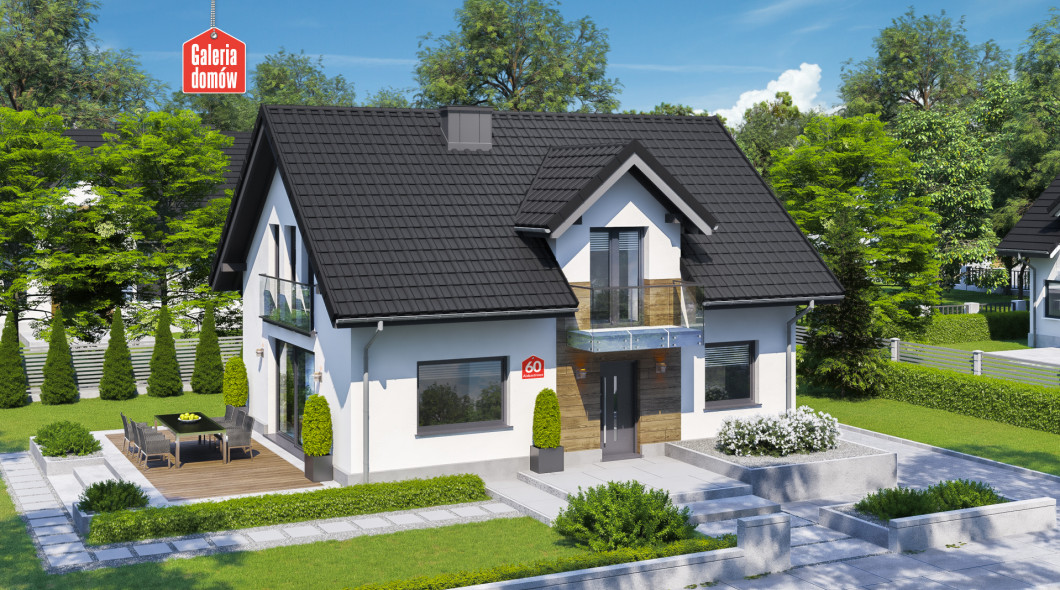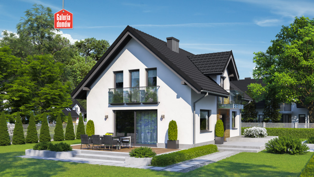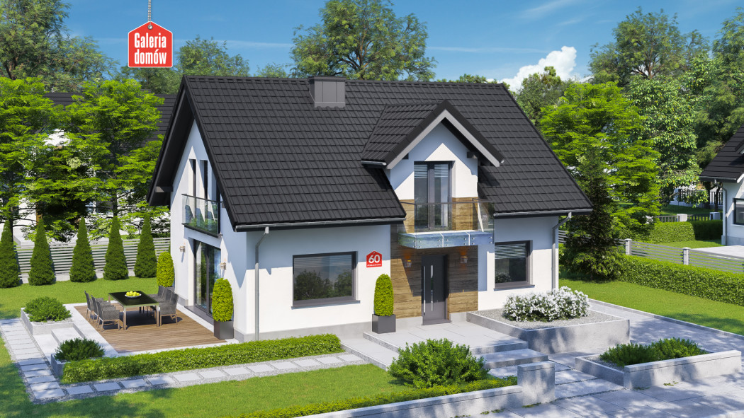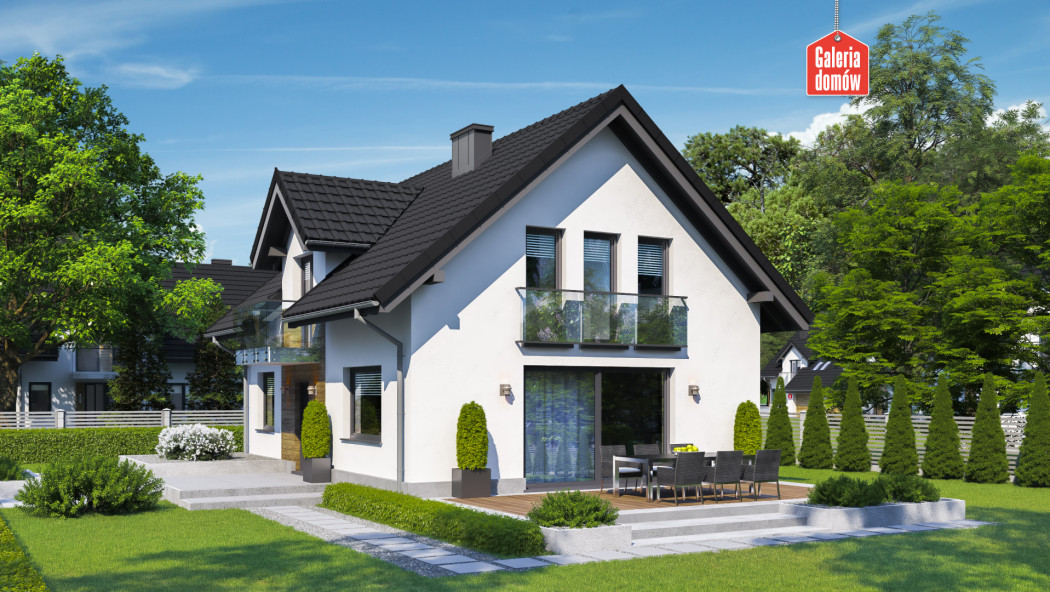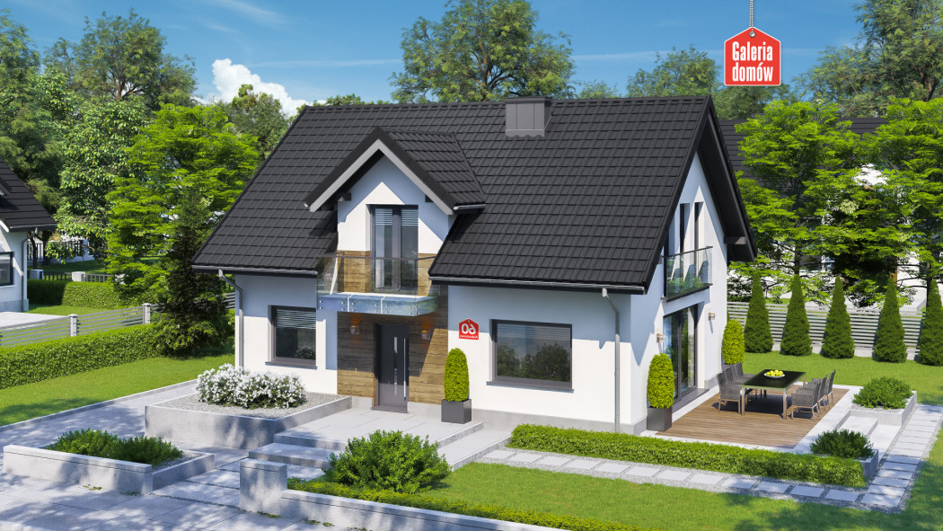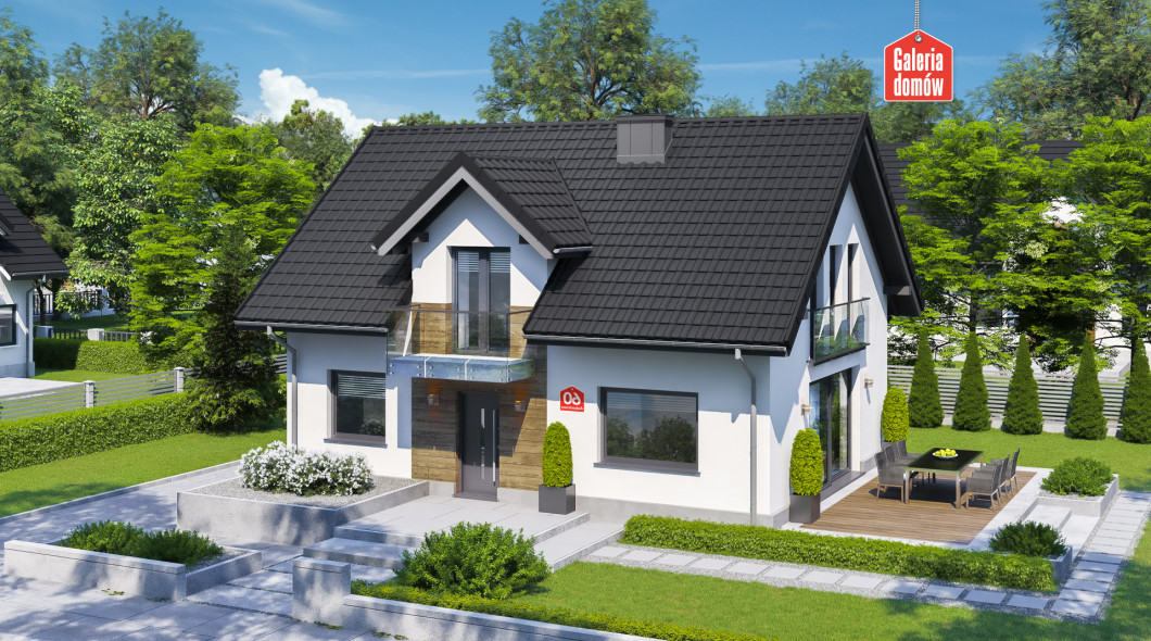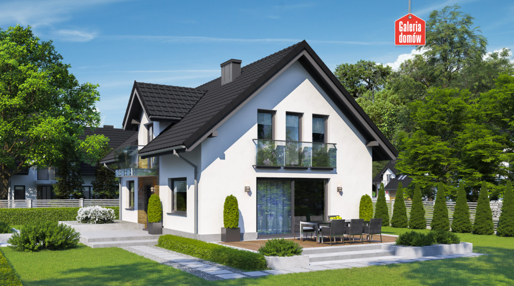 Dom nowoczesny, energooszczędny, został opracowany wg standardów WT 2021. Układ funkcjonalny przewiduje otwartą strefę dzienną, na którą składają się; salon z jadalnią i kuchnia. Na parterze mieści się też dodatkowy pokój, łazienka oraz kotłownia. Poddasze przeznaczono na strefę odpoczynku, którą tworzą 3 sypialnie, duża łazienka z pralnią i toaletą. Budynek dzięki prostej konstrukcji jest tani w budowie i oszczędny w użytkowaniu. Nowoczesna aranżacja elewacji, stylowe balkony francuskie i elegancki taras nadają charakter domowi. Wybór polecany 4-5 osobowym rodzinom.