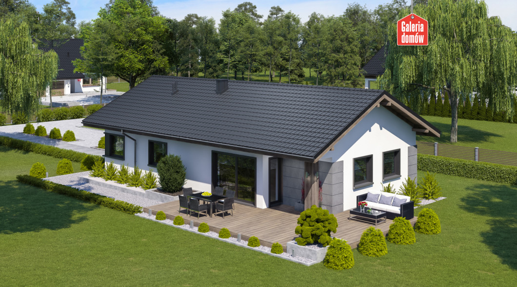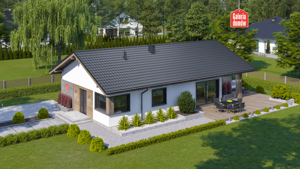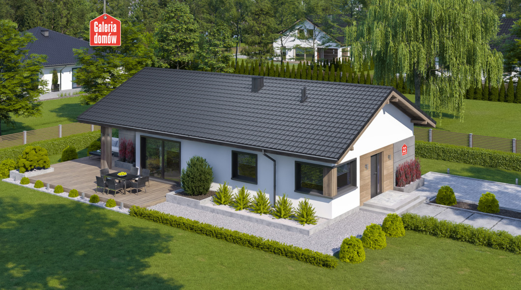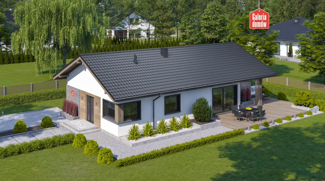 Dom przy Pastelowej 22 to dom parterowy o powierzchni użytkowej 100 m². Budynek nie posiada garażu, przez co jest tańszy w budowie. Układ funkcjonalny zawiera otwarty pokój dzienny z kuchnią i jadalnią oraz 4 pokoje dodatkowe, łazienkę, toaletę i kotłownię.