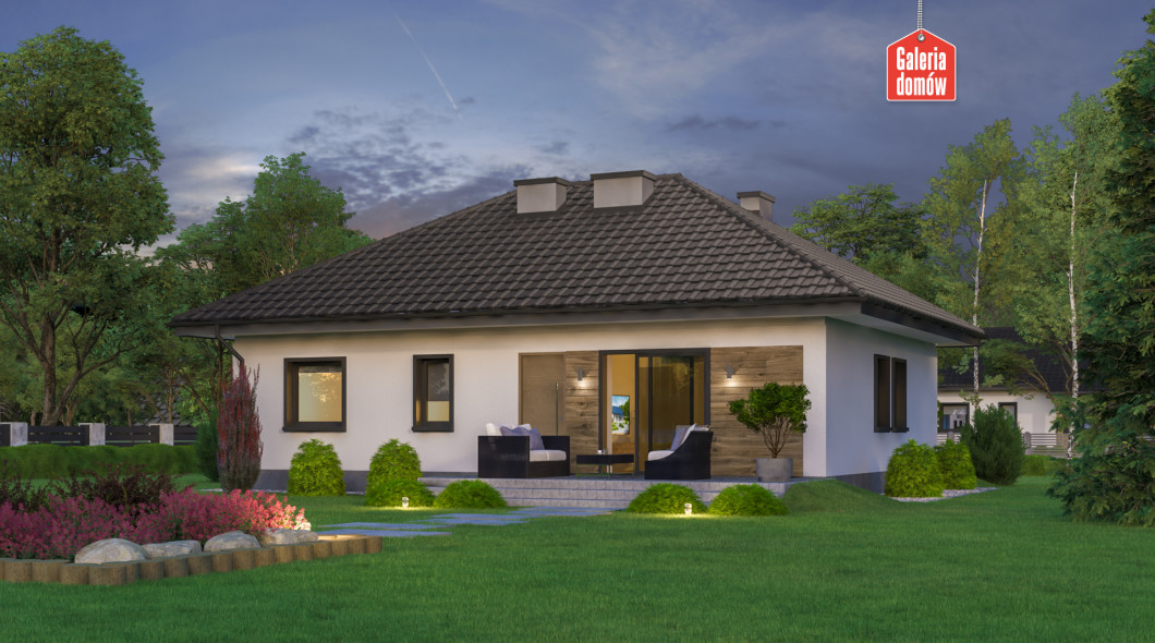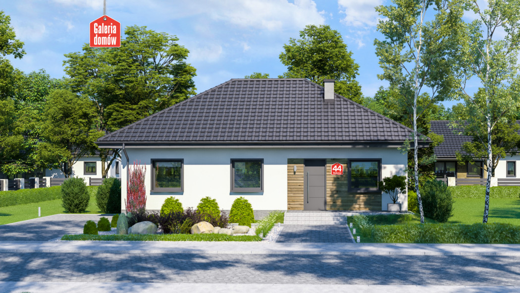 Gotowy projekt Dom przy Bukowej 44 to propozycja niewielkiego parterowego domu z dachem czterospadowym. Wykonany w technologii tradycyjnej, murowanej i dostosowany do warunków technicznych WT 2021. Układ funkcjonalny przewiduje otwartą część dzienną, na którą składa się salon i kuchnia. Bukowa 44 oferuje ponadto 3 sypialnie, pralnię połączoną z kotłownią, kompletnie wyposażoną łazienkę oraz dodatkową toaletę. Elewacja budynku została ozdobiona naturalnym drewnem i jest utrzymana w nowoczesnej stylistyce. Budynek, dzięki przemyślanej konstrukcji, jest szybki i tani w budowie oraz ekonomiczny w użytkowaniu. Doskonały wariant dla 4-5 osobowej rodziny, ceniącej komfort parterowego domu, połączony z ekonomią użytkowania.