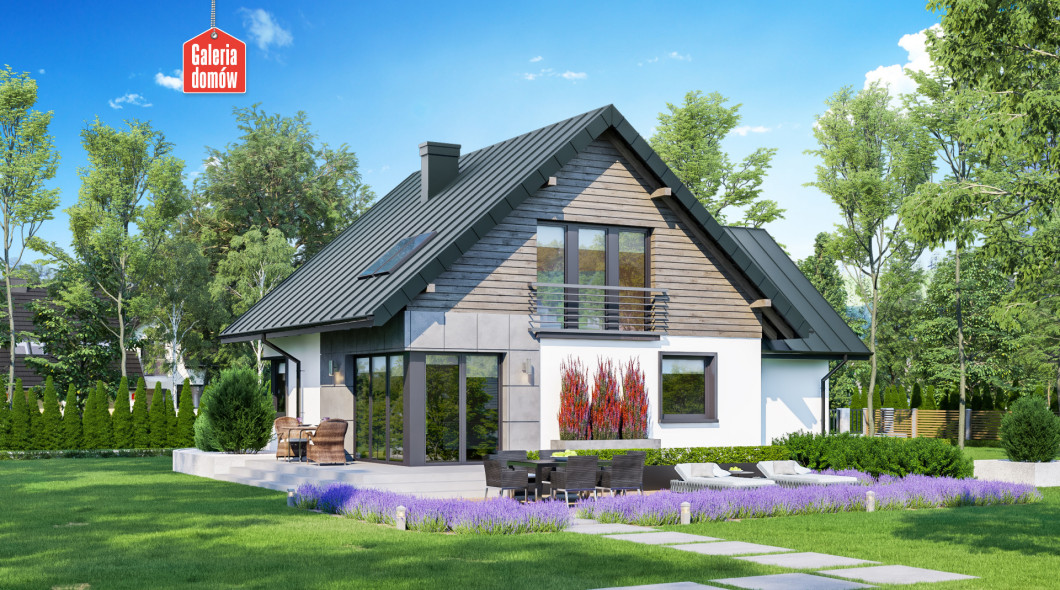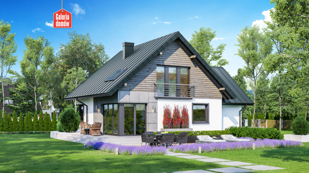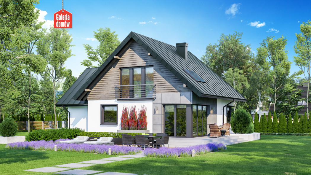Gotowy projekt Dom przy Cyprysowej 65 to budynek jednorodzinny, z poddaszem użytkowym, o powierzchni 113.46 m². Posiada dach dwuspadowy z kalenicą prostopadłą do drogi.
