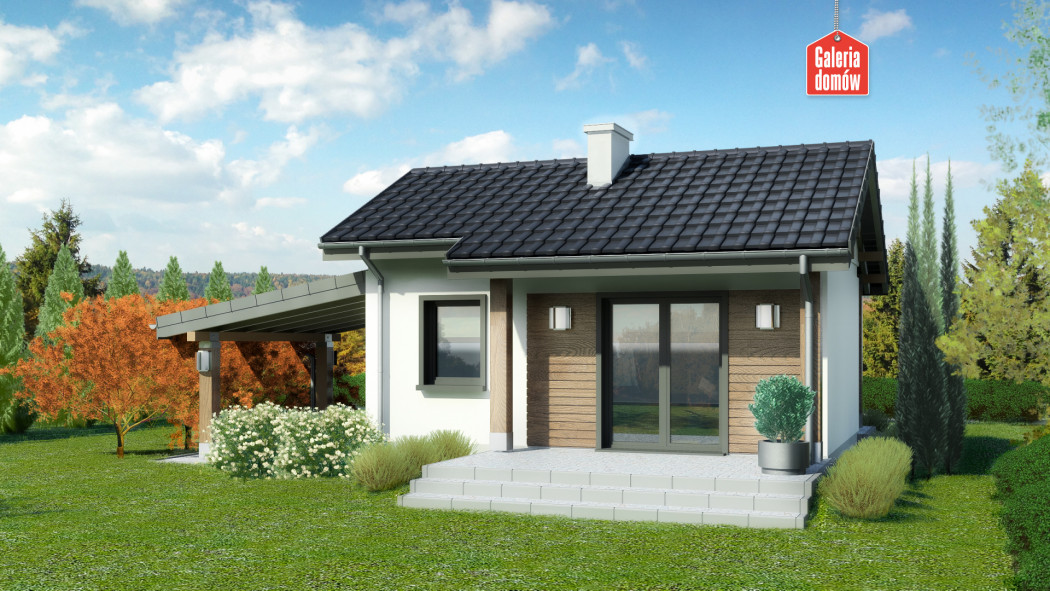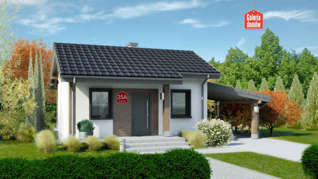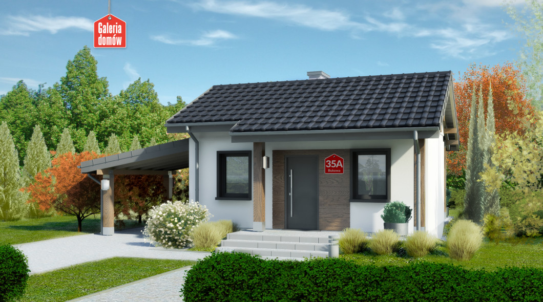 Dom przy Bukowej 35 jest przeznaczony zarówno do zabudowy letniskowej, całorocznej, jak i jednorodzinnej. W większości przypadków dom można wybudować bez pozwolenia na budowę – na tzw. zgłoszenie. Układ funkcjonalny Bukowej 35A przewiduje pokój dzienny z otwartą kuchnią oraz sypialnie i łazienkę. W salonie z kominkiem przewidziano sofę, małą jadalnię i szafkę na telewizor. W kuchni jest miejsce na lodówkę, płytę grzewczą, zmywarkę i zlew. Łazienkę wyposażono w kabinę prysznicową, sedes, umywalkę, a także pralkę i kocioł gazowy. Auto możemy wygodnie zaparkować pod drewnianą wiatą. Projektowany w dla konstrukcji drewnianej w dwuspadowym dachem. Posiada aktualną charakterystykę energetyczną.