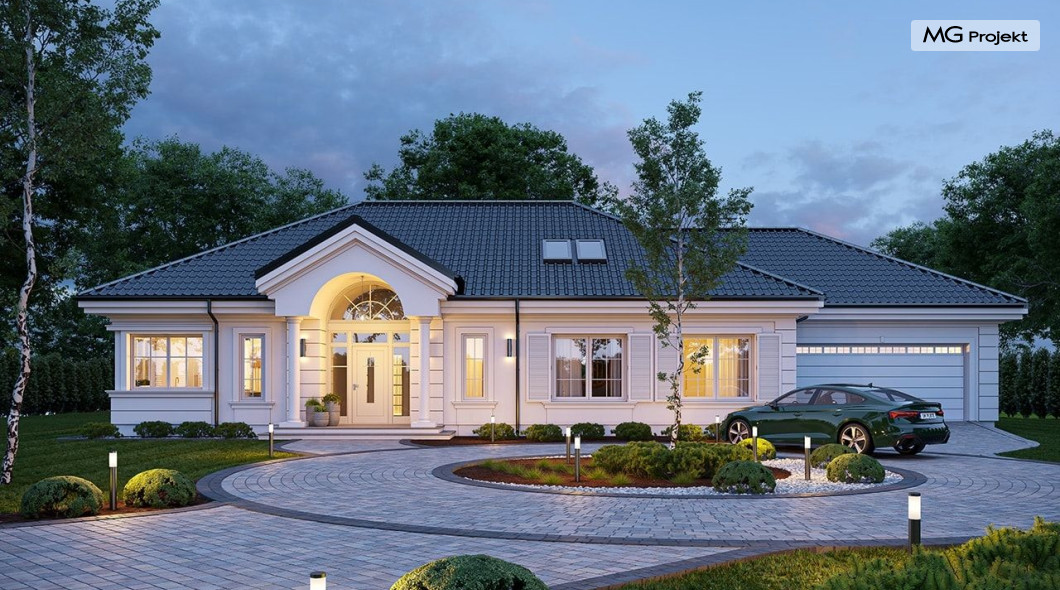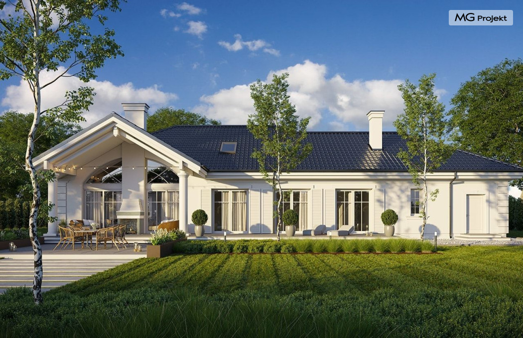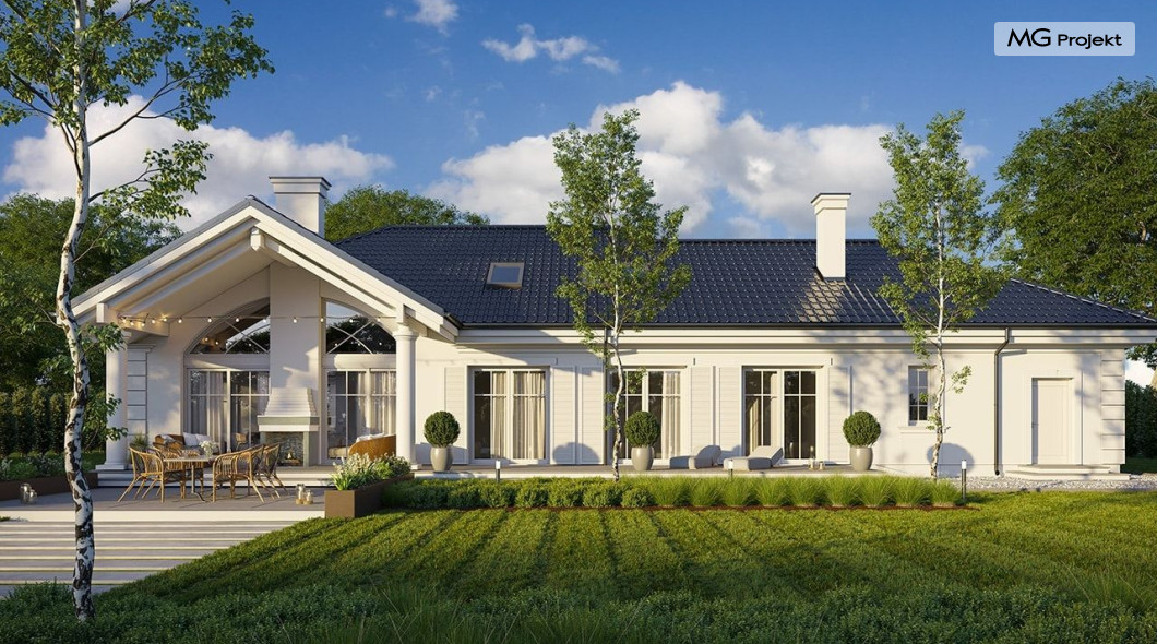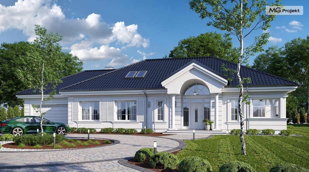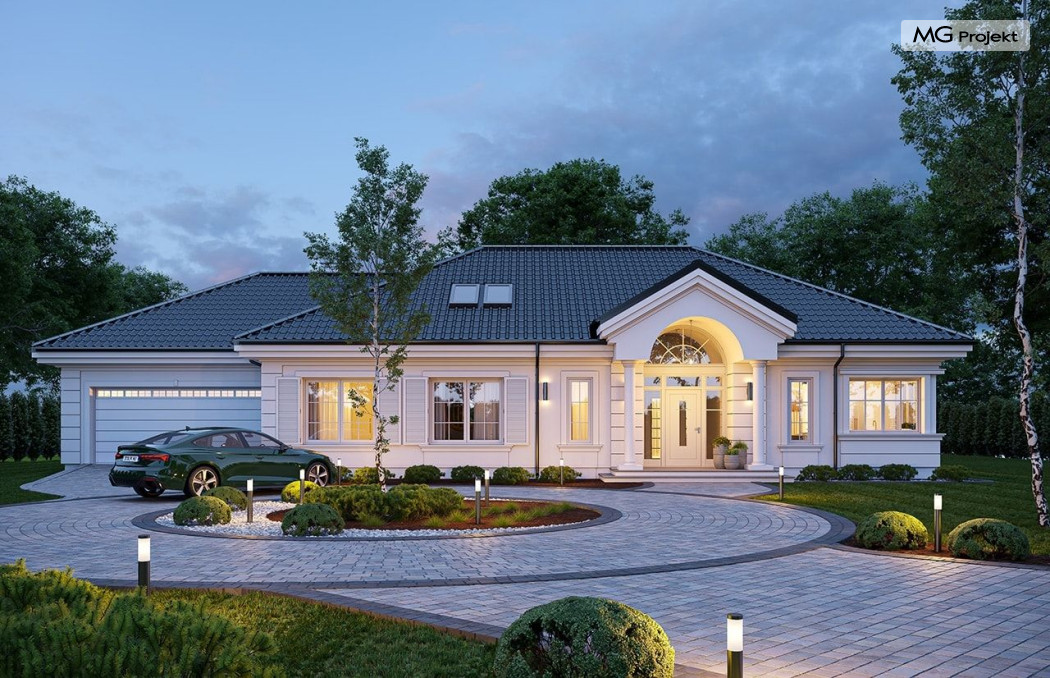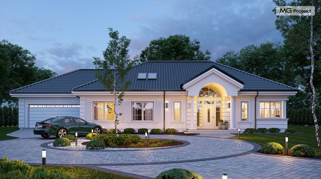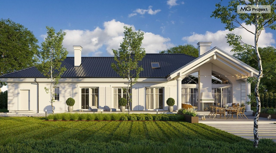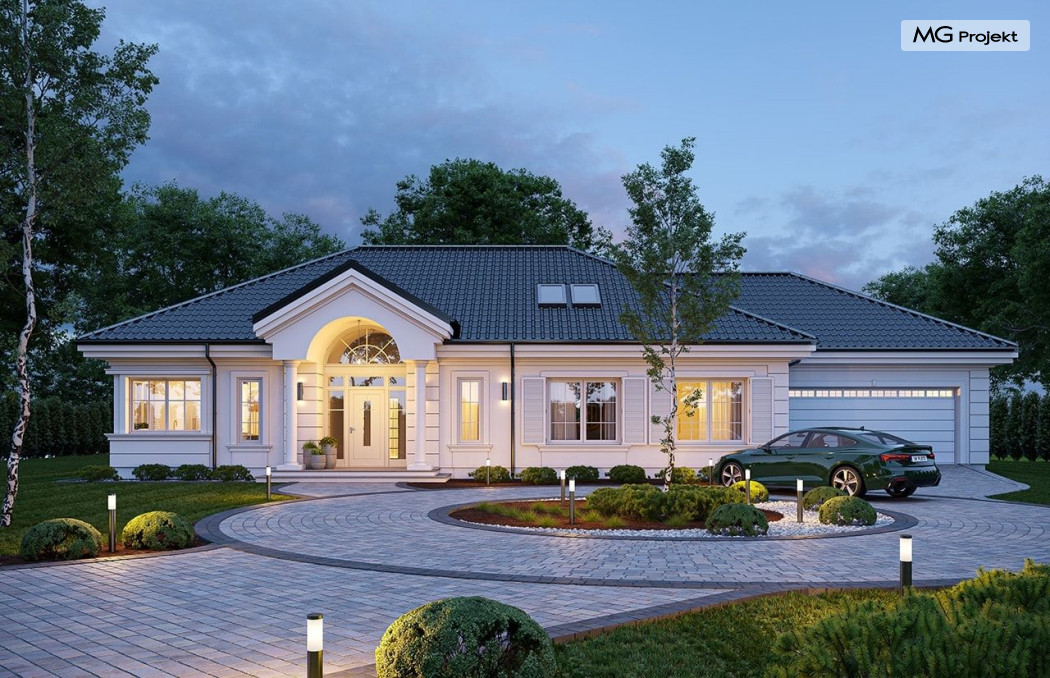 Projekt domu Willa Parkowa 8 B jest kolejną propozycją domu jednorodzinnego z popularnej serii „Willi Parkowych”. Dom został zaprojektowany jako parterowy, z przestrzenią poddasza / strychu do dowolnego wykorzystania i aranżacji. Budynek przykryto wielospadowym dachem i zaprojektowano na planie prostokąta, z dobudowaną z boku częścią garażowo -techniczną. Cały program użytkowy domu zmieszczono na parterze, aby zapewnić mieszkańcom wygodę życia na jednym poziomie, bez konieczności ciągłego chodzenia po schodach. Styl Willi Parkowej to architektura dworkowo – rezydencyjna w nowoczesnym ujęciu - dworek XXI wieku. Front domu ozdobiono jest pięknym portykiem wejściowym z szerokimi drzwiami frontowymi z naświetlami i łukowym świetlikiem doświetlającym podniesiony westybul. Od strony ogrodu urody dodaje zadaszenie tarasu z dużym przeszkleniem z salonu, z łukowymi oknami i kominkiem dwustronnym. Dom jest reprezentacyjny, elegancki, a za razem utrzymuje ludzką skalę i powściągliwość. Uroku całej sylwetce domu dodają duże okna z delikatnymi podziałami i pięknymi okiennicami, gzymsy, boniowania i sztukateria. A całość zamyka od góry łagodny proporcjonalny dach. Wnętrze domu podzielono wyraźnie na cześć dzienną - z salonem, część nocną - z pokojami sypialnymi i cześć techniczną - z garażem i kotłownią. Do domu wchodzimy reprezentacyjnym wejściem przez podwyższony przedsionek z sufitem łukowym, do pokoju dziennego łączącego funkcję holu, salonu i jadalni. Od frontu część dzienną zamyka dodatkowo kuchnia z wyspą, spiżarnią i narożnym oknem. Salon zaprojektowano z otwarciem przestrzennym – pustką, łącząc przestrzennie parter z antresolą na poddaszu - będącą przedłużeniem pokoju dziennego. W części sypialnej mamy trzy sypialnie dziecięce z łazienką, oraz sypialnię master z własną łazienką i garderobą. Dalej zaprojektowano dostępną z korytarza przez śluzę podwójnych drzwi część gospodarczą, z pomieszczeniami kotłowni i dwustanowiskowym garażem. Na poddaszu mamy do dyspozycji przestrzeń do indywidualnej aranżacji, w której można uzyskać dwa lub trzy dodatkowe pokoje. W projekcie zastosowano nowoczesne instalacje i bardzo dobre ocieplenia, dzięki czemu budynek jest energooszczędny i będzie niedrogi w późniejszej eksploatacji. Willa Parkowa 8 B to jedna z mniejszych wersji projektów z tej serii. Dom idealny dla osób marzących o pięknym romantycznym prawdziwym domu, osadzonym swoją formą w tradycji, ale będącym też zupełnie współczesną komfortową willą. Zapraszamy !