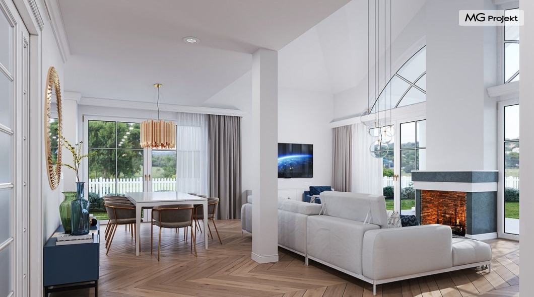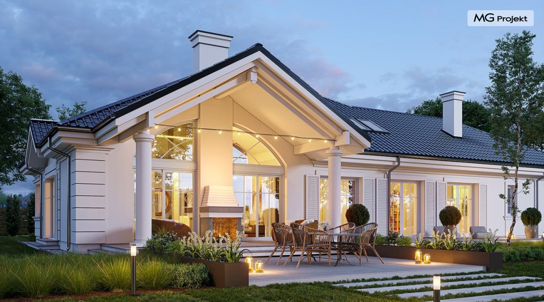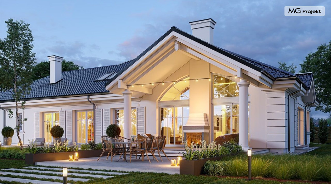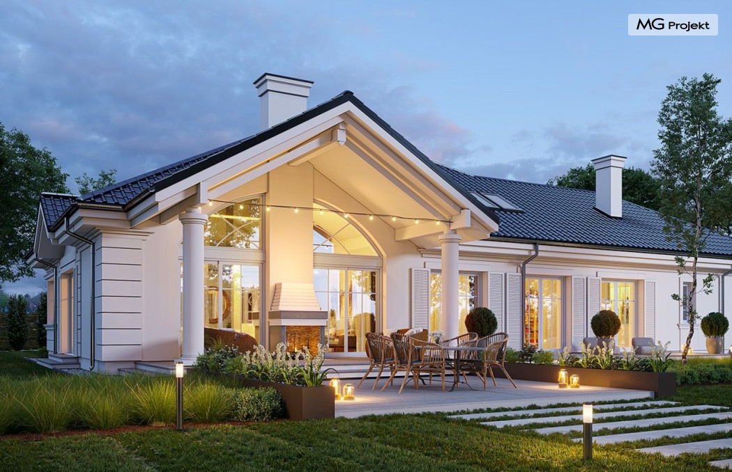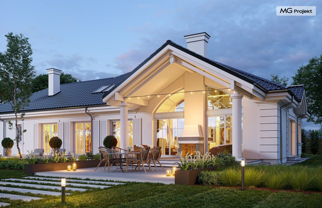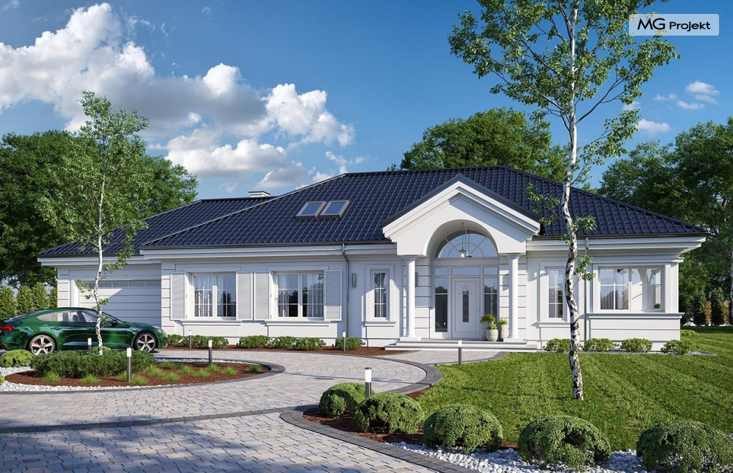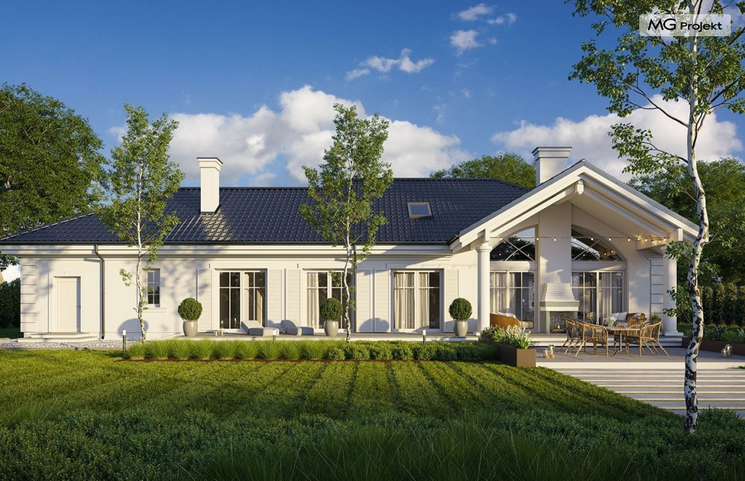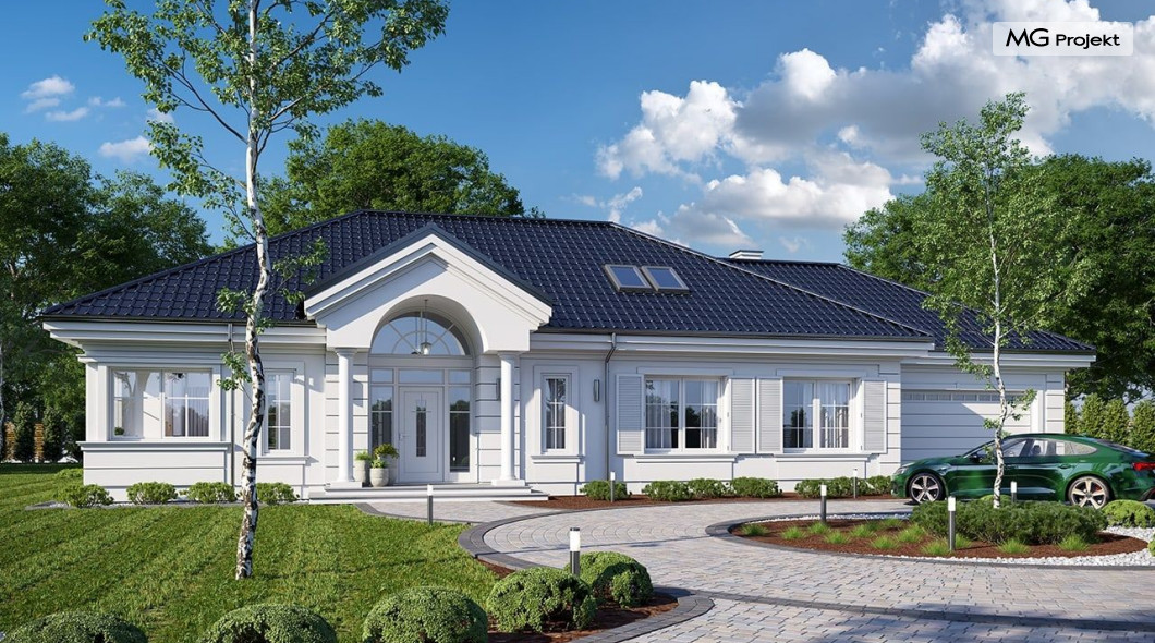 Projekt domu Willa Parkowa 8 B jest kolejną propozycją domu jednorodzinnego z popularnej serii „Willi Parkowych”. Dom został zaprojektowany jako parterowy, z przestrzenią poddasza / strychu do dowolnego wykorzystania i aranżacji. Budynek przykryto wielospadowym dachem i zaprojektowano na planie prostokąta, z dobudowaną z boku częścią garażowo -techniczną. Cały program użytkowy domu zmieszczono na parterze, aby zapewnić mieszkańcom wygodę życia na jednym poziomie, bez konieczności ciągłego chodzenia po schodach. Styl Willi Parkowej to architektura dworkowo – rezydencyjna w nowoczesnym ujęciu - dworek XXI wieku. Front domu ozdobiono jest pięknym portykiem wejściowym z szerokimi drzwiami frontowymi z naświetlami i łukowym świetlikiem doświetlającym podniesiony westybul. Od strony ogrodu urody dodaje zadaszenie tarasu z dużym przeszkleniem z salonu, z łukowymi oknami i kominkiem dwustronnym. Dom jest reprezentacyjny, elegancki, a za razem utrzymuje ludzką skalę i powściągliwość. Uroku całej sylwetce domu dodają duże okna z delikatnymi podziałami i pięknymi okiennicami, gzymsy, boniowania i sztukateria. A całość zamyka od góry łagodny proporcjonalny dach. Wnętrze domu podzielono wyraźnie na cześć dzienną - z salonem, część nocną - z pokojami sypialnymi i cześć techniczną - z garażem i kotłownią. Do domu wchodzimy reprezentacyjnym wejściem przez podwyższony przedsionek z sufitem łukowym, do pokoju dziennego łączącego funkcję holu, salonu i jadalni. Od frontu część dzienną zamyka dodatkowo kuchnia z wyspą, spiżarnią i narożnym oknem. Salon zaprojektowano z otwarciem przestrzennym – pustką, łącząc przestrzennie parter z antresolą na poddaszu - będącą przedłużeniem pokoju dziennego. W części sypialnej mamy trzy sypialnie dziecięce z łazienką, oraz sypialnię master z własną łazienką i garderobą. Dalej zaprojektowano dostępną z korytarza przez śluzę podwójnych drzwi część gospodarczą, z pomieszczeniami kotłowni i dwustanowiskowym garażem. Na poddaszu mamy do dyspozycji przestrzeń do indywidualnej aranżacji, w której można uzyskać dwa lub trzy dodatkowe pokoje. W projekcie zastosowano nowoczesne instalacje i bardzo dobre ocieplenia, dzięki czemu budynek jest energooszczędny i będzie niedrogi w późniejszej eksploatacji. Willa Parkowa 8 B to jedna z mniejszych wersji projektów z tej serii. Dom idealny dla osób marzących o pięknym romantycznym prawdziwym domu, osadzonym swoją formą w tradycji, ale będącym też zupełnie współczesną komfortową willą. Zapraszamy !