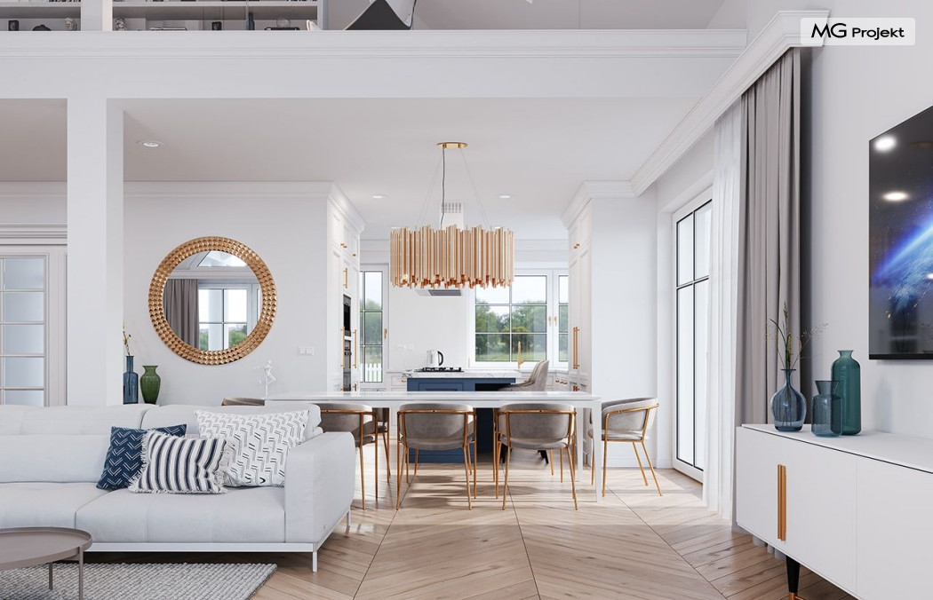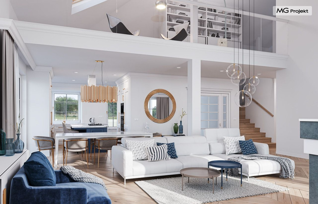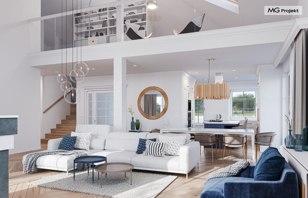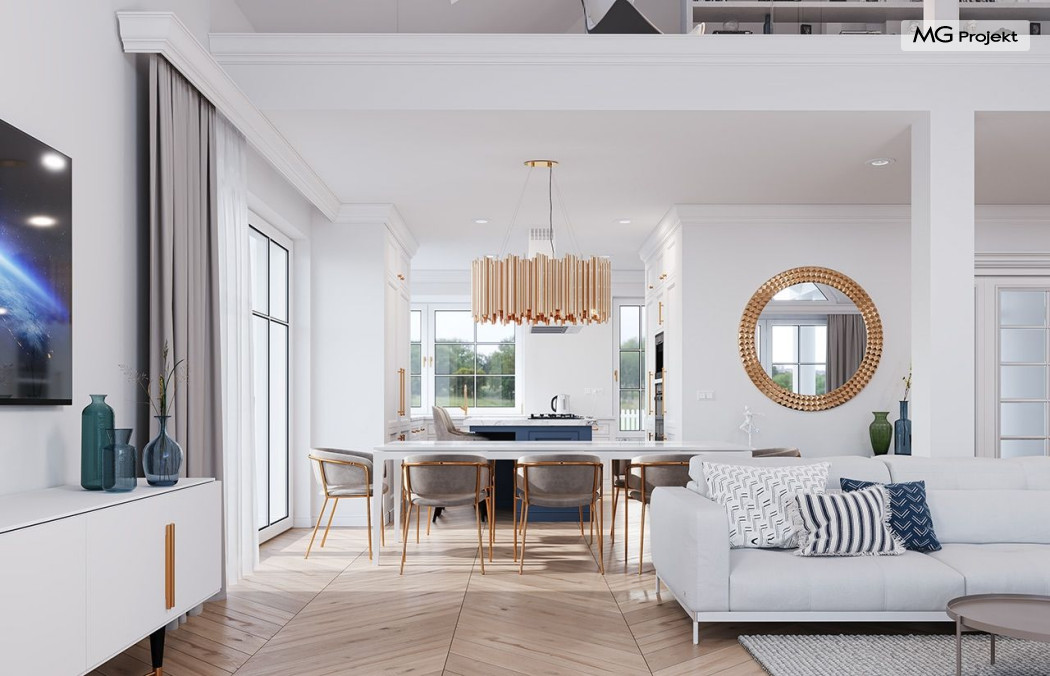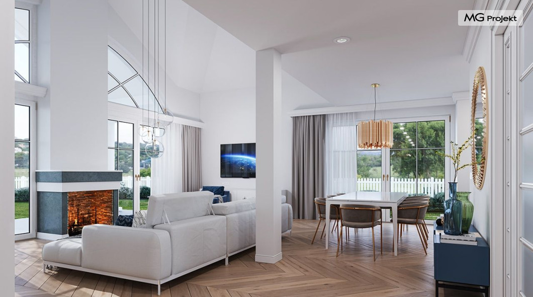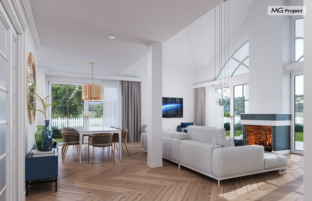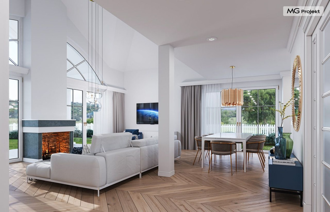 Projekt domu Willa Parkowa 8 B jest kolejną propozycją domu jednorodzinnego z popularnej serii „Willi Parkowych”. Dom został zaprojektowany jako parterowy, z przestrzenią poddasza / strychu do dowolnego wykorzystania i aranżacji. Budynek przykryto wielospadowym dachem i zaprojektowano na planie prostokąta, z dobudowaną z boku częścią garażowo -techniczną. Cały program użytkowy domu zmieszczono na parterze, aby zapewnić mieszkańcom wygodę życia na jednym poziomie, bez konieczności ciągłego chodzenia po schodach. Styl Willi Parkowej to architektura dworkowo – rezydencyjna w nowoczesnym ujęciu - dworek XXI wieku. Front domu ozdobiono jest pięknym portykiem wejściowym z szerokimi drzwiami frontowymi z naświetlami i łukowym świetlikiem doświetlającym podniesiony westybul. Od strony ogrodu urody dodaje zadaszenie tarasu z dużym przeszkleniem z salonu, z łukowymi oknami i kominkiem dwustronnym. Dom jest reprezentacyjny, elegancki, a za razem utrzymuje ludzką skalę i powściągliwość. Uroku całej sylwetce domu dodają duże okna z delikatnymi podziałami i pięknymi okiennicami, gzymsy, boniowania i sztukateria. A całość zamyka od góry łagodny proporcjonalny dach. Wnętrze domu podzielono wyraźnie na cześć dzienną - z salonem, część nocną - z pokojami sypialnymi i cześć techniczną - z garażem i kotłownią. Do domu wchodzimy reprezentacyjnym wejściem przez podwyższony przedsionek z sufitem łukowym, do pokoju dziennego łączącego funkcję holu, salonu i jadalni. Od frontu część dzienną zamyka dodatkowo kuchnia z wyspą, spiżarnią i narożnym oknem. Salon zaprojektowano z otwarciem przestrzennym – pustką, łącząc przestrzennie parter z antresolą na poddaszu - będącą przedłużeniem pokoju dziennego. W części sypialnej mamy trzy sypialnie dziecięce z łazienką, oraz sypialnię master z własną łazienką i garderobą. Dalej zaprojektowano dostępną z korytarza przez śluzę podwójnych drzwi część gospodarczą, z pomieszczeniami kotłowni i dwustanowiskowym garażem. Na poddaszu mamy do dyspozycji przestrzeń do indywidualnej aranżacji, w której można uzyskać dwa lub trzy dodatkowe pokoje. W projekcie zastosowano nowoczesne instalacje i bardzo dobre ocieplenia, dzięki czemu budynek jest energooszczędny i będzie niedrogi w późniejszej eksploatacji. Willa Parkowa 8 B to jedna z mniejszych wersji projektów z tej serii. Dom idealny dla osób marzących o pięknym romantycznym prawdziwym domu, osadzonym swoją formą w tradycji, ale będącym też zupełnie współczesną komfortową willą. Zapraszamy !