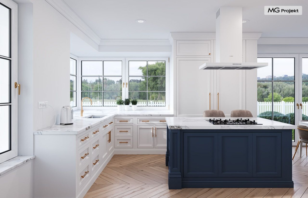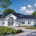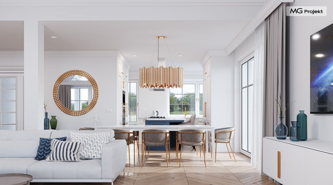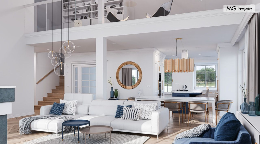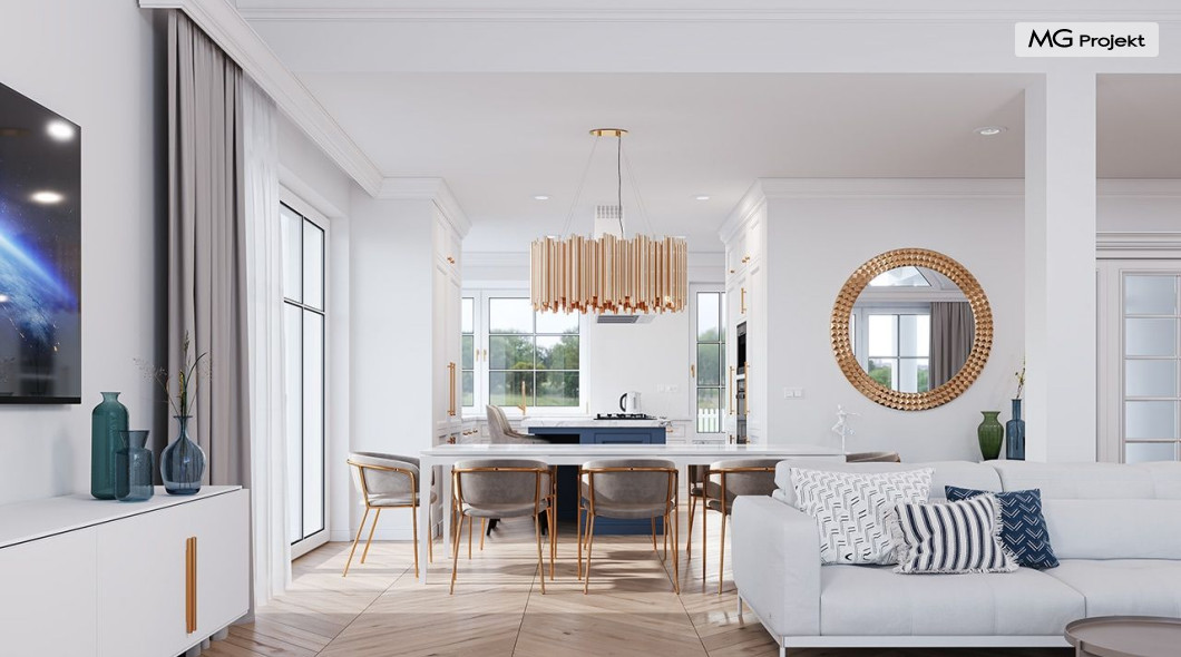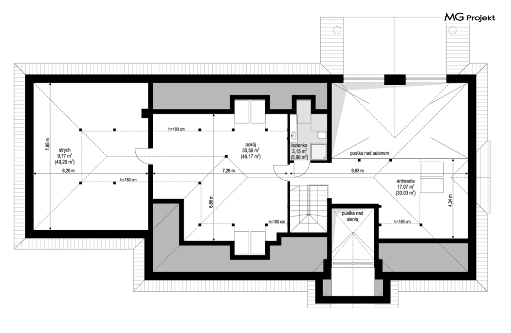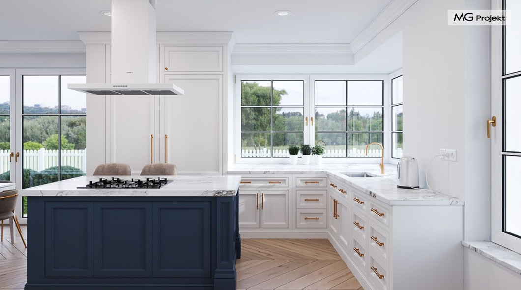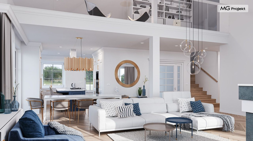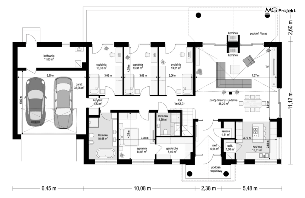 Projekt domu Willa Parkowa 8 B jest kolejną propozycją domu jednorodzinnego z popularnej serii „Willi Parkowych”. Dom został zaprojektowany jako parterowy, z przestrzenią poddasza / strychu do dowolnego wykorzystania i aranżacji. Budynek przykryto wielospadowym dachem i zaprojektowano na planie prostokąta, z dobudowaną z boku częścią garażowo -techniczną. Cały program użytkowy domu zmieszczono na parterze, aby zapewnić mieszkańcom wygodę życia na jednym poziomie, bez konieczności ciągłego chodzenia po schodach. Styl Willi Parkowej to architektura dworkowo – rezydencyjna w nowoczesnym ujęciu - dworek XXI wieku. Front domu ozdobiono jest pięknym portykiem wejściowym z szerokimi drzwiami frontowymi z naświetlami i łukowym świetlikiem doświetlającym podniesiony westybul. Od strony ogrodu urody dodaje zadaszenie tarasu z dużym przeszkleniem z salonu, z łukowymi oknami i kominkiem dwustronnym. Dom jest reprezentacyjny, elegancki, a za razem utrzymuje ludzką skalę i powściągliwość. Uroku całej sylwetce domu dodają duże okna z delikatnymi podziałami i pięknymi okiennicami, gzymsy, boniowania i sztukateria. A całość zamyka od góry łagodny proporcjonalny dach. Wnętrze domu podzielono wyraźnie na cześć dzienną - z salonem, część nocną - z pokojami sypialnymi i cześć techniczną - z garażem i kotłownią. Do domu wchodzimy reprezentacyjnym wejściem przez podwyższony przedsionek z sufitem łukowym, do pokoju dziennego łączącego funkcję holu, salonu i jadalni. Od frontu część dzienną zamyka dodatkowo kuchnia z wyspą, spiżarnią i narożnym oknem. Salon zaprojektowano z otwarciem przestrzennym – pustką, łącząc przestrzennie parter z antresolą na poddaszu - będącą przedłużeniem pokoju dziennego. W części sypialnej mamy trzy sypialnie dziecięce z łazienką, oraz sypialnię master z własną łazienką i garderobą. Dalej zaprojektowano dostępną z korytarza przez śluzę podwójnych drzwi część gospodarczą, z pomieszczeniami kotłowni i dwustanowiskowym garażem. Na poddaszu mamy do dyspozycji przestrzeń do indywidualnej aranżacji, w której można uzyskać dwa lub trzy dodatkowe pokoje. W projekcie zastosowano nowoczesne instalacje i bardzo dobre ocieplenia, dzięki czemu budynek jest energooszczędny i będzie niedrogi w późniejszej eksploatacji. Willa Parkowa 8 B to jedna z mniejszych wersji projektów z tej serii. Dom idealny dla osób marzących o pięknym romantycznym prawdziwym domu, osadzonym swoją formą w tradycji, ale będącym też zupełnie współczesną komfortową willą. Zapraszamy !