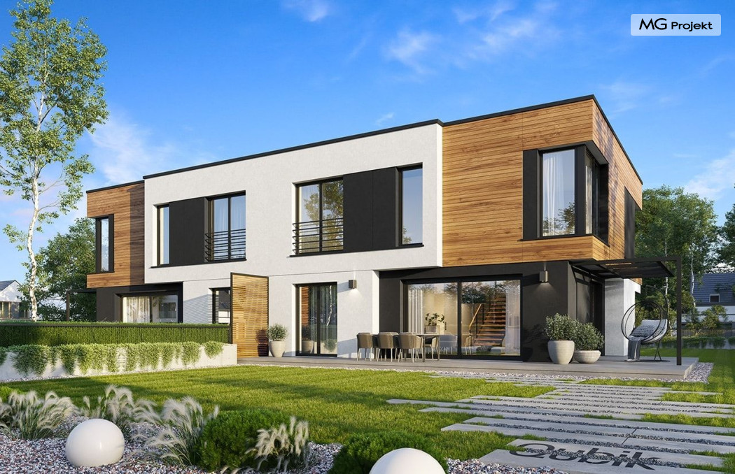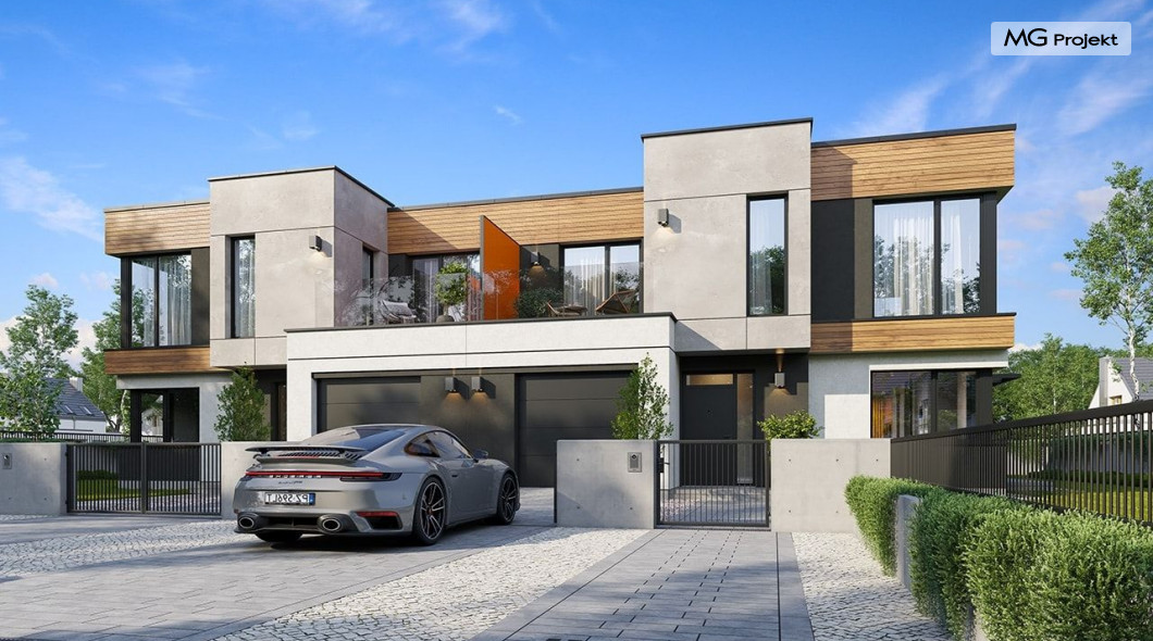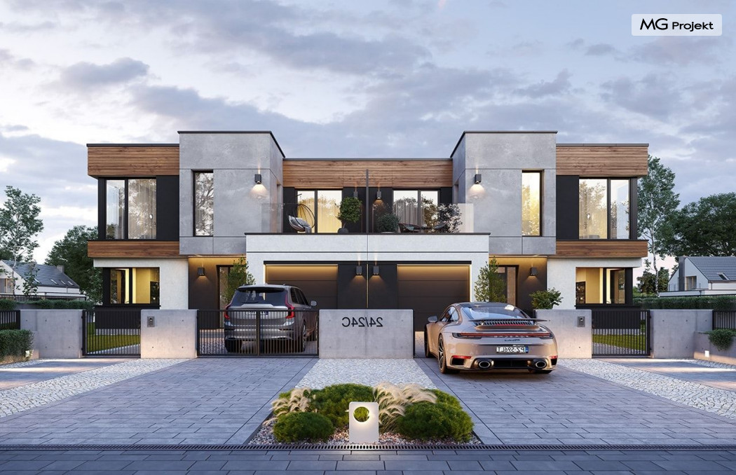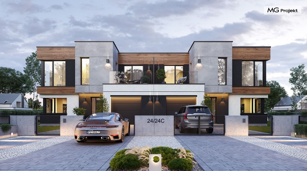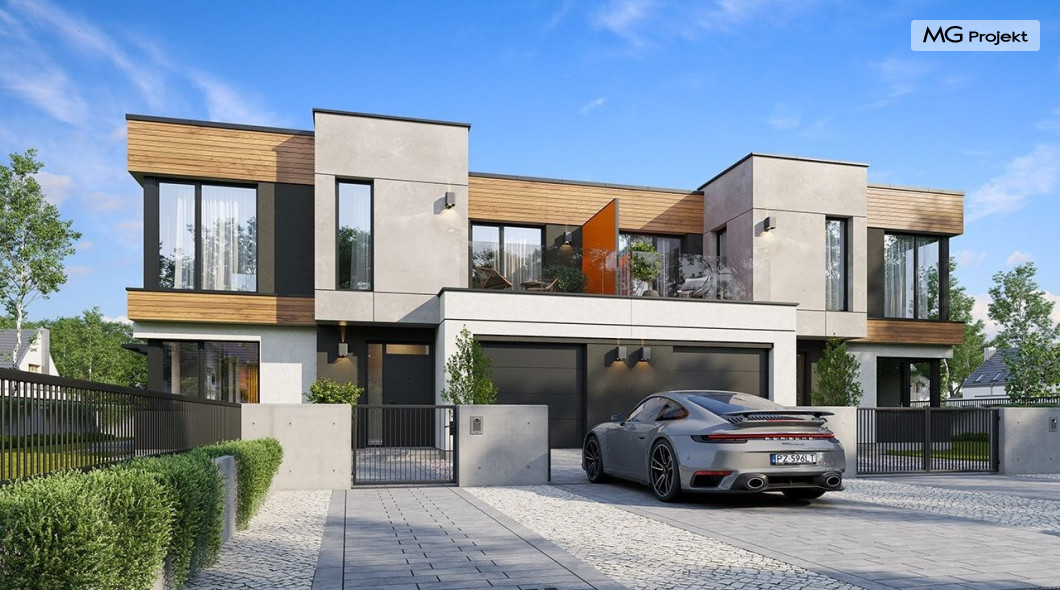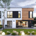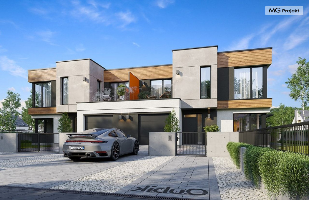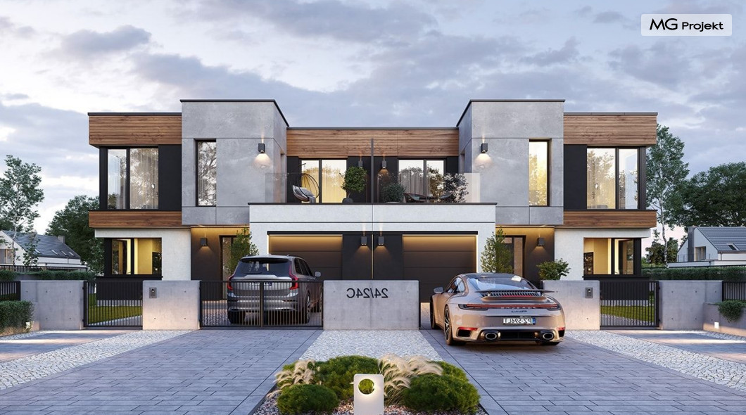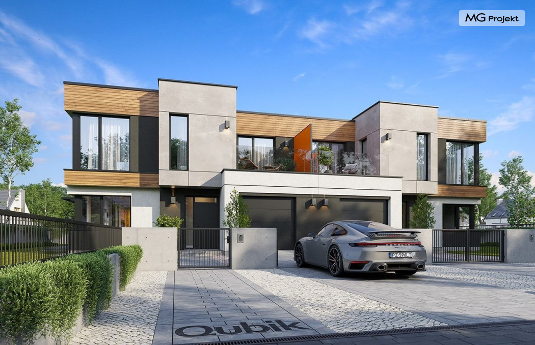 Projekt domu Qubik 3 jest to projekt budynku jednorodzinnego w zabudowie bliźniaczej. Budynek o nowoczesnej architekturze, z piętrową bryłą, przykryty dachem płaskim, zbudowany ma planie zbliżonym do kwadratu. Bryła budynku składa się z kilku przenikających się wzajemnie prostopadłościennych mniejszych brył. Dom połączony jest wbudowanymi garażami rozdzielającymi wizualnie dwie połówki bliźniaka. Wejścia do obu segmentów domu podkreślone są dominującymi wykuszami wystającymi przed ścianę elewacji frontowej i wykończonymi w kontrastowym kolorze. Podział elewacji domu na poziome pasy, zróżnicowane kolorystycznie i materiałowo, oraz zastosowanie dużych przeszkleń, dają domowi dynamiczny nowoczesny wygląd. Od strony ogrodu architektura domu jest spokojniejsza - tutaj główną rolę odgrywają ogród, taras i szerokie przeszklenie łączące salon z trawnikiem. Wnętrze każdej z połówek bliźniaka zaprojektowano dzieląc funkcje na cześć dzienną i techniczną na parterze, oraz pokoje sypialne na piętrze.Do domu wchodzimy przez przedsionek do holu z reprezentacyjnymi schodami i do salonu. Salon łączy się częściowo z dużą wygodną kuchnią. Jest tu również połączenie z dodatkowym pokojem na parterze – gabinetem. W salonie nie przewidziano kominka - uznając go za niepotrzebny, ale w każdej chwili taki kominek można bez kłopotu dodać. Piętro to cztery pokoje sypialne z dwiema łazienkami, w tym sypialnia master z własną łazienką i garderobą. Hol na piętrze został pięknie doświetlony ogromnym świetlikiem do dachów płaskich Velux. Architektura domu - zarówno jego szata zewnętrzna jak i wnętrze,zostały podporządkowane maksymalnej klarowności, funkcjonalności i prostocie. Qubik 3 to dom dla Inwestorów lubiących minimalizm i prostotę, w połączeniu z dyskretną elegancją. Dom jest prosty w budowie, ma prostą konstrukcję. W budynku zastosowano bardzo dobre izolacje i nowoczesne instalacje, aby zminimalizować późniejsze koszty eksploatacji budynku. Qubik 3 zmieści się na niewielkiej parceli, w miejscu gdzie urzędnicy dopuszczają budowę domu z płaskim dachem. Projekt jest świetną propozycją dla inwestorów na wyróżnienie się ze swoim bliźniakiem z tła innych typowych domów. Zapraszamy !