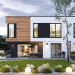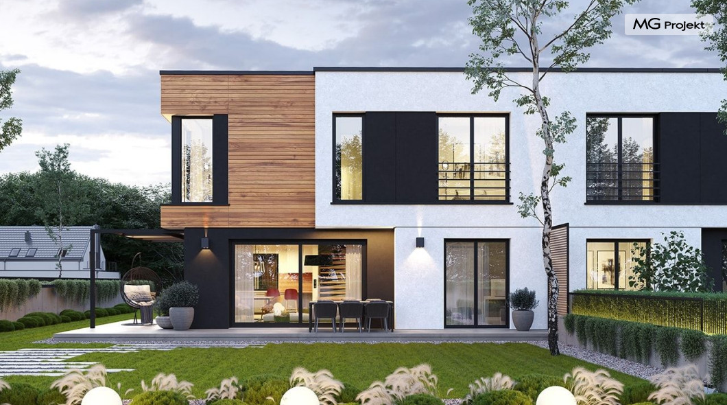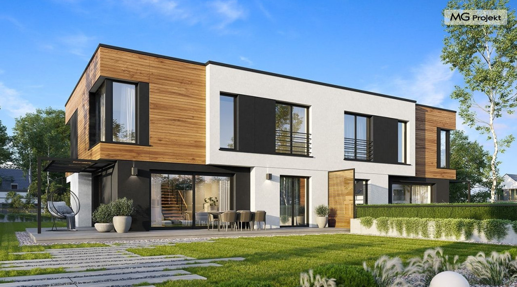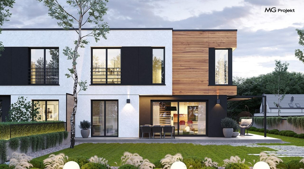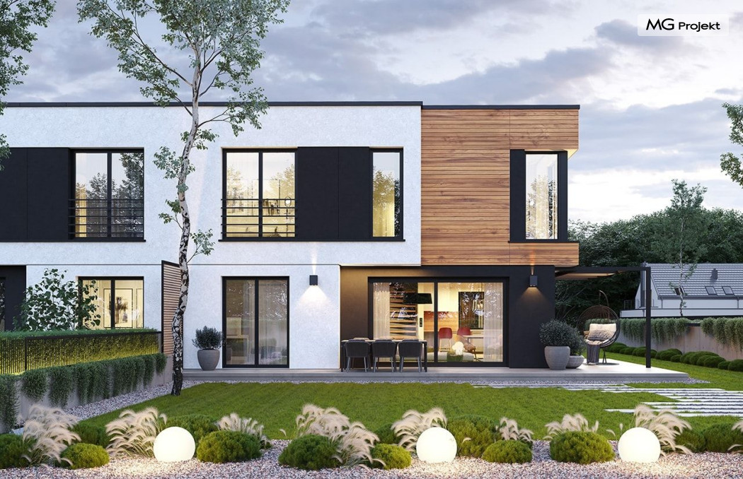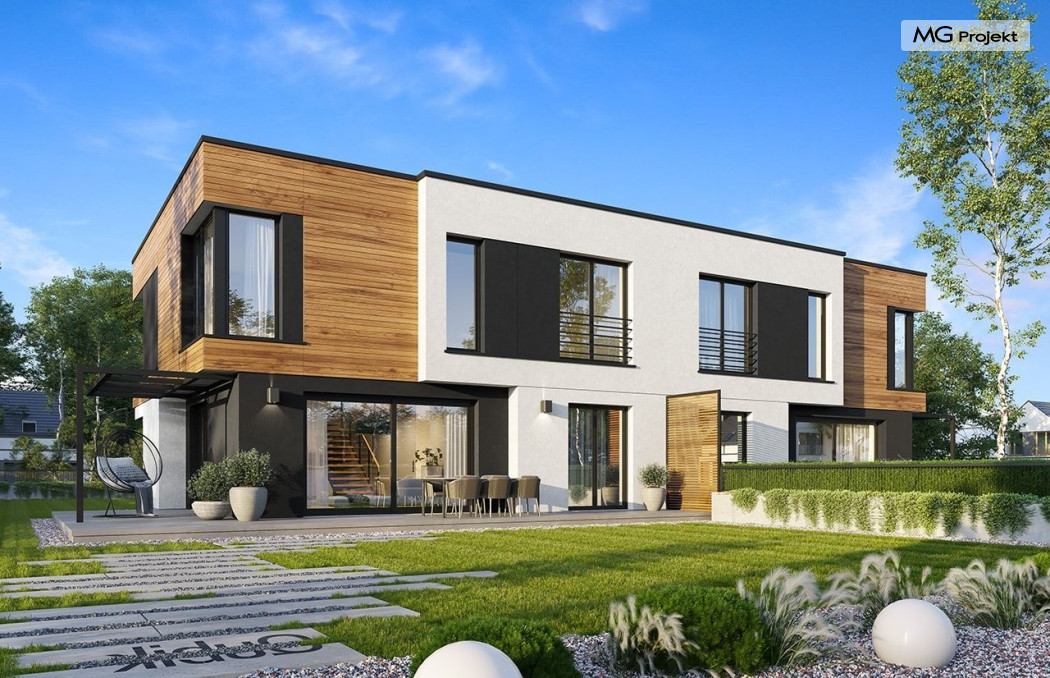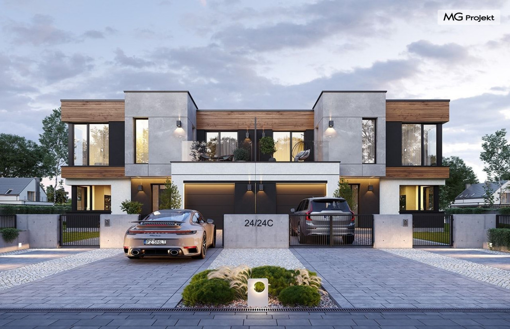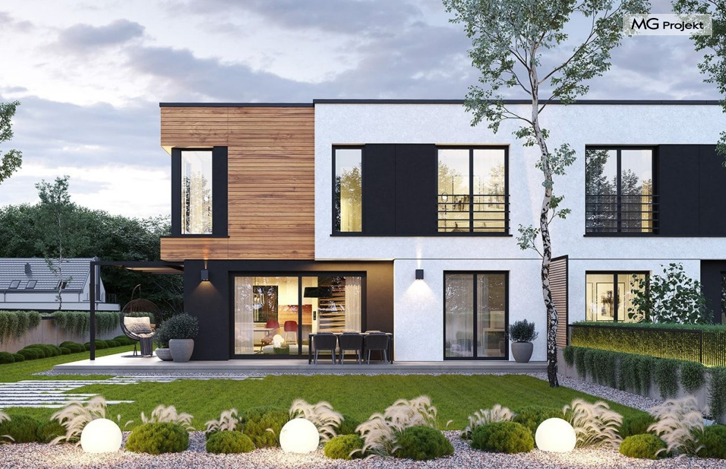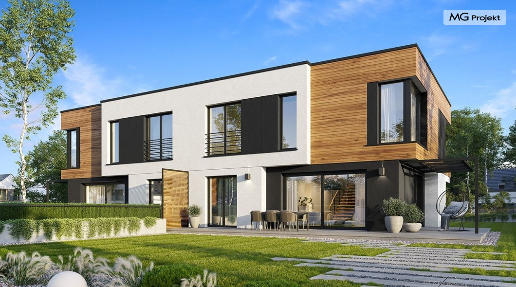 Projekt domu Qubik 3 jest to projekt budynku jednorodzinnego w zabudowie bliźniaczej. Budynek o nowoczesnej architekturze, z piętrową bryłą, przykryty dachem płaskim, zbudowany ma planie zbliżonym do kwadratu. Bryła budynku składa się z kilku przenikających się wzajemnie prostopadłościennych mniejszych brył. Dom połączony jest wbudowanymi garażami rozdzielającymi wizualnie dwie połówki bliźniaka. Wejścia do obu segmentów domu podkreślone są dominującymi wykuszami wystającymi przed ścianę elewacji frontowej i wykończonymi w kontrastowym kolorze. Podział elewacji domu na poziome pasy, zróżnicowane kolorystycznie i materiałowo, oraz zastosowanie dużych przeszkleń, dają domowi dynamiczny nowoczesny wygląd. Od strony ogrodu architektura domu jest spokojniejsza - tutaj główną rolę odgrywają ogród, taras i szerokie przeszklenie łączące salon z trawnikiem. Wnętrze każdej z połówek bliźniaka zaprojektowano dzieląc funkcje na cześć dzienną i techniczną na parterze, oraz pokoje sypialne na piętrze.Do domu wchodzimy przez przedsionek do holu z reprezentacyjnymi schodami i do salonu. Salon łączy się częściowo z dużą wygodną kuchnią. Jest tu również połączenie z dodatkowym pokojem na parterze – gabinetem. W salonie nie przewidziano kominka - uznając go za niepotrzebny, ale w każdej chwili taki kominek można bez kłopotu dodać. Piętro to cztery pokoje sypialne z dwiema łazienkami, w tym sypialnia master z własną łazienką i garderobą. Hol na piętrze został pięknie doświetlony ogromnym świetlikiem do dachów płaskich Velux. Architektura domu - zarówno jego szata zewnętrzna jak i wnętrze,zostały podporządkowane maksymalnej klarowności, funkcjonalności i prostocie. Qubik 3 to dom dla Inwestorów lubiących minimalizm i prostotę, w połączeniu z dyskretną elegancją. Dom jest prosty w budowie, ma prostą konstrukcję. W budynku zastosowano bardzo dobre izolacje i nowoczesne instalacje, aby zminimalizować późniejsze koszty eksploatacji budynku. Qubik 3 zmieści się na niewielkiej parceli, w miejscu gdzie urzędnicy dopuszczają budowę domu z płaskim dachem. Projekt jest świetną propozycją dla inwestorów na wyróżnienie się ze swoim bliźniakiem z tła innych typowych domów. Zapraszamy !