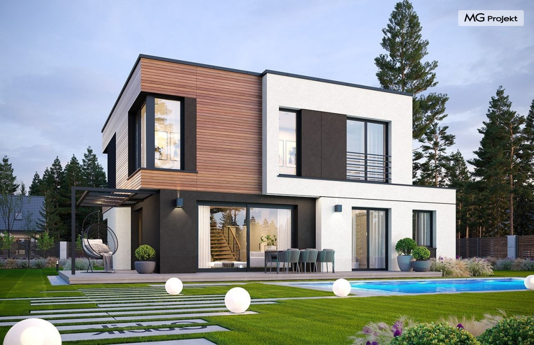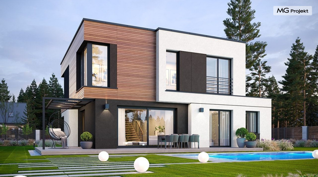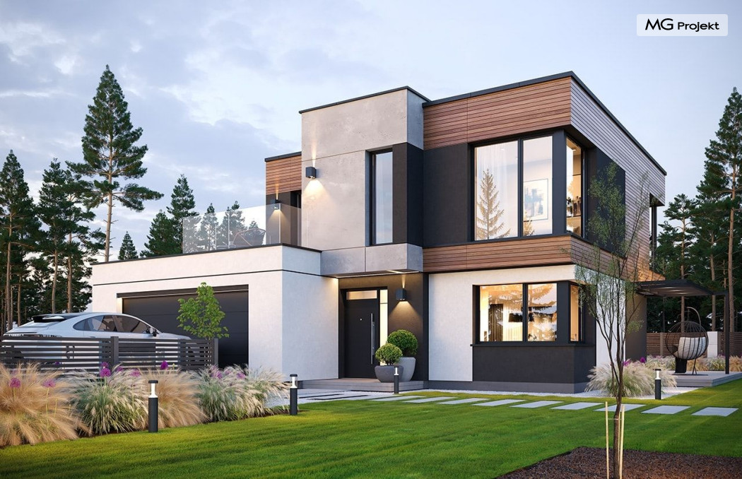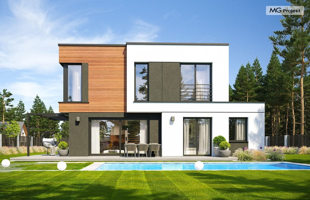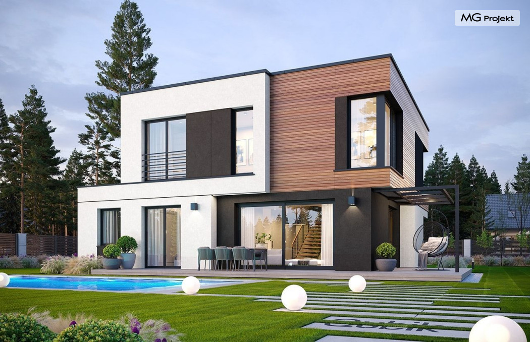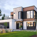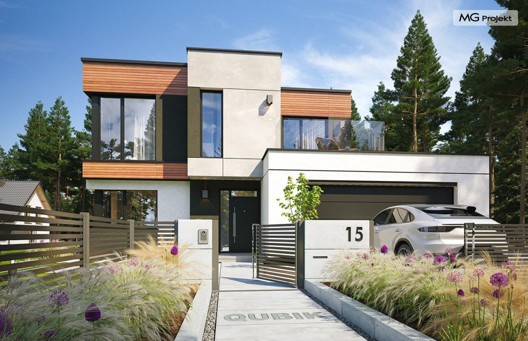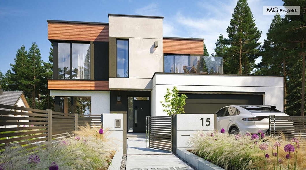 Projekt domu Qubik 4 jest to projekt nowoczesnego piętrowego domu jednorodzinnego z przeznaczeniem dla rodziny 4-6 osobowej. Dom został zaprojektowany na planie zbliżonym do kwadratu, z wbudowanym dwustanowiskowym garażem. Budynek składa się z kilku przenikających się wzajemnie prostopadłościennych brył i zwieńczony jest dachem płaskim. Elewację frontową zdobi wystający nad podestem wejściowym wykusz, ściany podzielone poziomymi pasami i duże przeszklenia pomieszczeń na parterze i piętrze. Od strony ogrodowej elewacja domu została uspokojona. Zastosowano tu delikatne przesunięcie fragmentów bryły wykończonych w kontrastujących kolorach. uzyskano tym samym ciekawy efekt, jednocześnie pozostawiając tą stronę domu spokojniejszą, mniej agresywną, bardziej współgrającą z otaczającym ogrodem i tarasem dostępnym z salonu. Kontrastujące materiały i kolory elewacji i duże przeszklenia okien dają budynkowi wyrazisty nowoczesny styl. Wnętrze domu podzielone zostało na cześć dzienną i techniczną na parterze i pokoje sypialne na piętrze. Jednoprzestrzenne wnętrze salonu połączonego wizualnie z kuchnią i holem daje bardzo komfortową część do codziennego funkcjonowania domowników. Dodatkowy pokój na parterze z własną łazienką i garderobą może pełnić rozmaite funkcje – gabinetu lub sypialni. Dwustanowiskowy garaż z kotłownią domykają parter. Na piętrze mamy cztery pokoje sypialne z dwiema łazienkami, garderobą i szafami w zabudowie. Sypialnia master ma własną łazienkę i garderobę. Konstrukcja budynku jest prosta i dość łatwa w budowie. W domu zastosowano bardzo dobre izolacje i nowoczesne instalacje, dzięki czemu jest on energooszczędny i będzie niedrogi w przyszłej eksploatacji. Qubik 4 to doskonała propozycja dla Inwestorów pragnących oryginalnego nowoczesnego komfortowego domu o funkcjonalnym wnętrzu i nietuzinkowej architekturze, wyróżniającej się w otoczeniu. Zapraszamy !