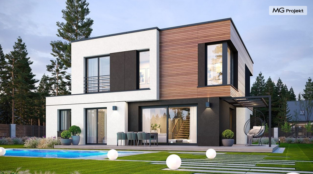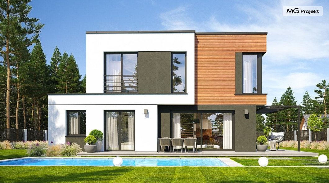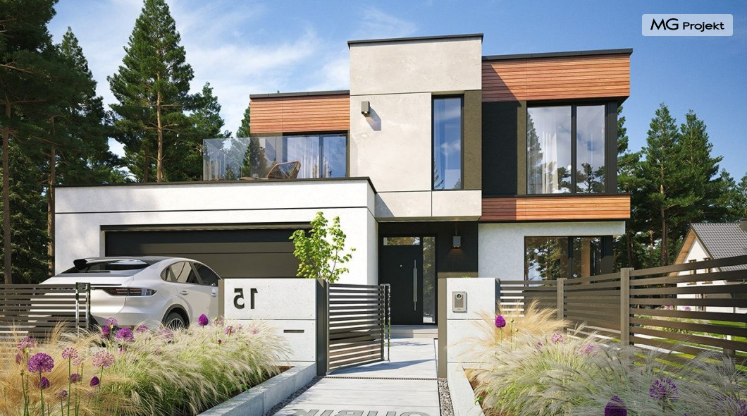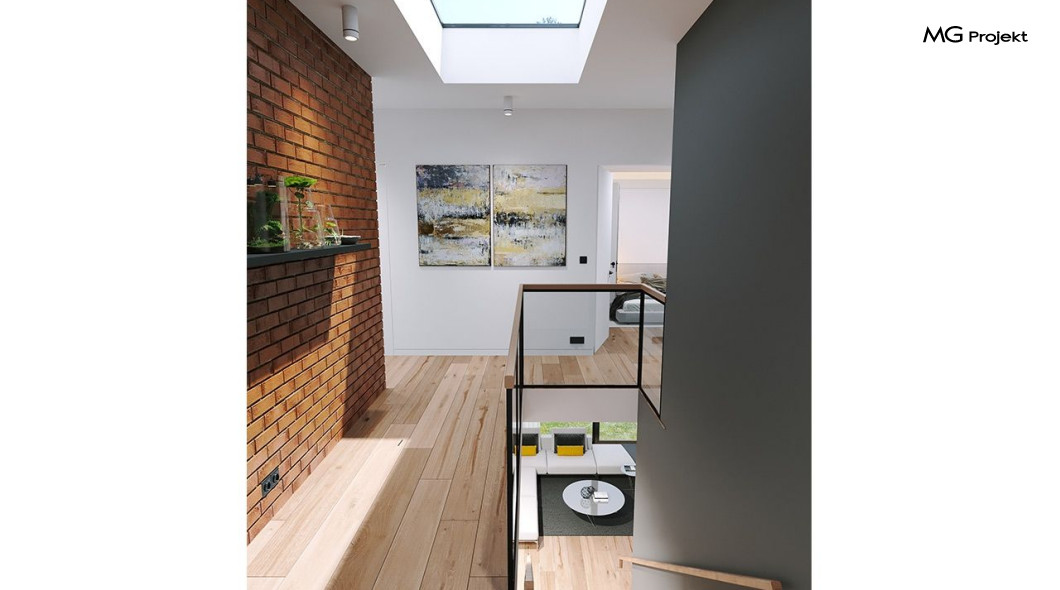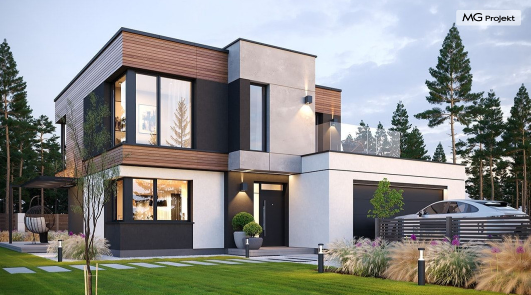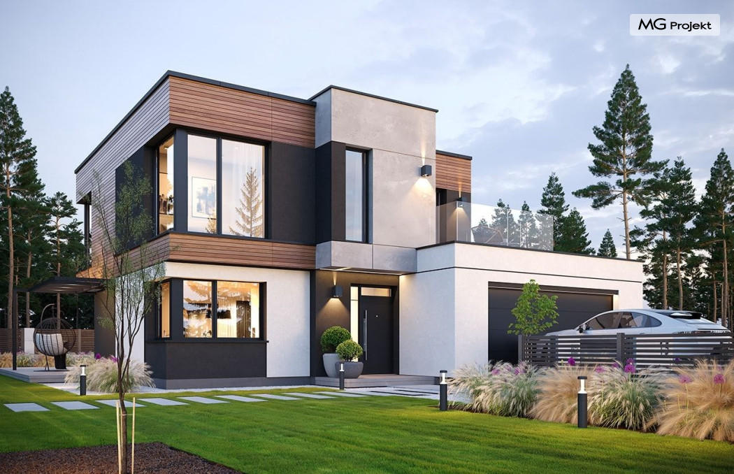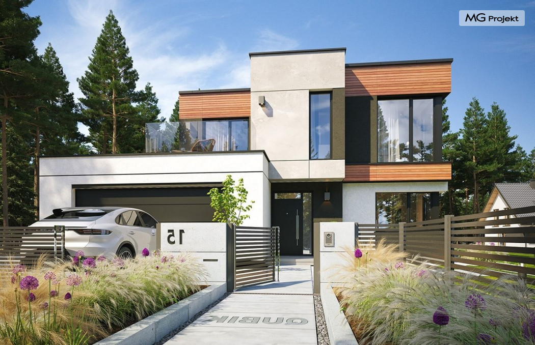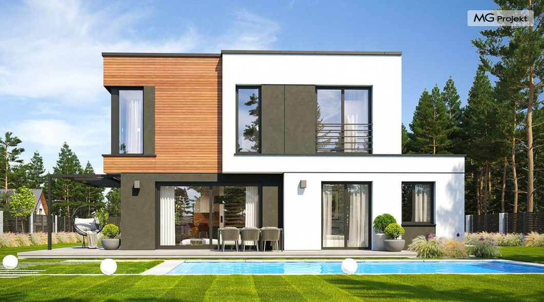 Projekt domu Qubik 4 jest to projekt nowoczesnego piętrowego domu jednorodzinnego z przeznaczeniem dla rodziny 4-6 osobowej. Dom został zaprojektowany na planie zbliżonym do kwadratu, z wbudowanym dwustanowiskowym garażem. Budynek składa się z kilku przenikających się wzajemnie prostopadłościennych brył i zwieńczony jest dachem płaskim. Elewację frontową zdobi wystający nad podestem wejściowym wykusz, ściany podzielone poziomymi pasami i duże przeszklenia pomieszczeń na parterze i piętrze. Od strony ogrodowej elewacja domu została uspokojona. Zastosowano tu delikatne przesunięcie fragmentów bryły wykończonych w kontrastujących kolorach. uzyskano tym samym ciekawy efekt, jednocześnie pozostawiając tą stronę domu spokojniejszą, mniej agresywną, bardziej współgrającą z otaczającym ogrodem i tarasem dostępnym z salonu. Kontrastujące materiały i kolory elewacji i duże przeszklenia okien dają budynkowi wyrazisty nowoczesny styl. Wnętrze domu podzielone zostało na cześć dzienną i techniczną na parterze i pokoje sypialne na piętrze. Jednoprzestrzenne wnętrze salonu połączonego wizualnie z kuchnią i holem daje bardzo komfortową część do codziennego funkcjonowania domowników. Dodatkowy pokój na parterze z własną łazienką i garderobą może pełnić rozmaite funkcje – gabinetu lub sypialni. Dwustanowiskowy garaż z kotłownią domykają parter. Na piętrze mamy cztery pokoje sypialne z dwiema łazienkami, garderobą i szafami w zabudowie. Sypialnia master ma własną łazienkę i garderobę. Konstrukcja budynku jest prosta i dość łatwa w budowie. W domu zastosowano bardzo dobre izolacje i nowoczesne instalacje, dzięki czemu jest on energooszczędny i będzie niedrogi w przyszłej eksploatacji. Qubik 4 to doskonała propozycja dla Inwestorów pragnących oryginalnego nowoczesnego komfortowego domu o funkcjonalnym wnętrzu i nietuzinkowej architekturze, wyróżniającej się w otoczeniu. Zapraszamy !