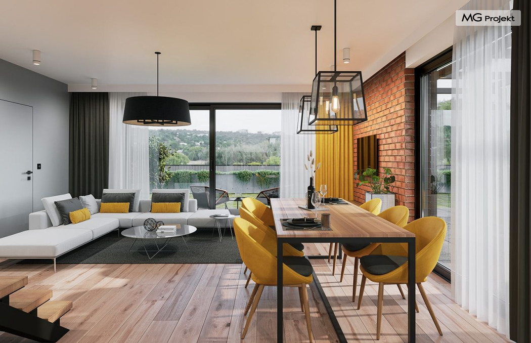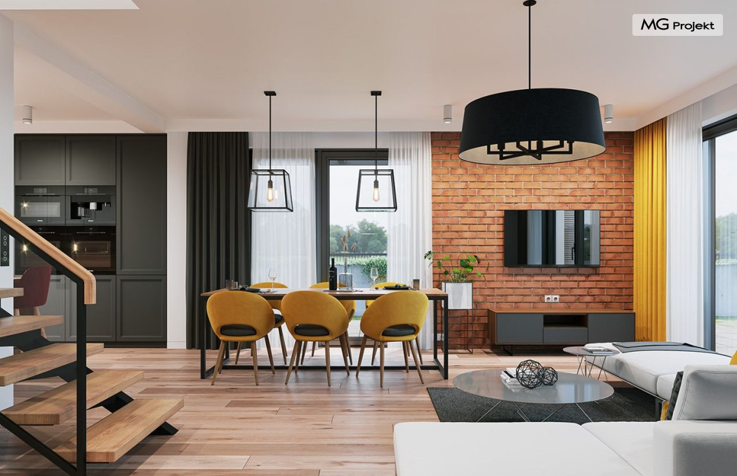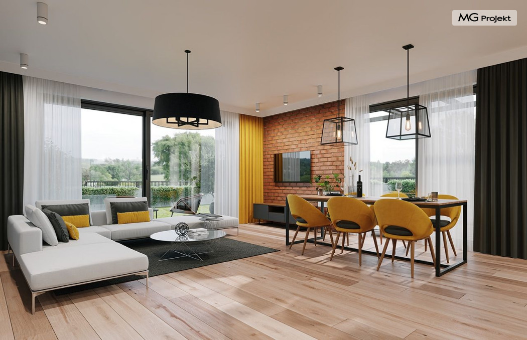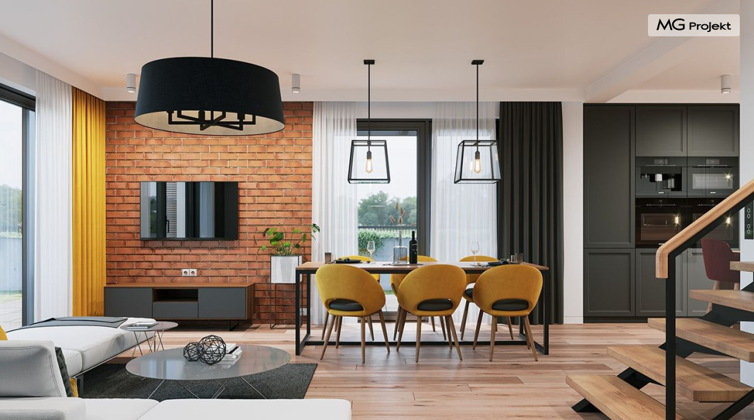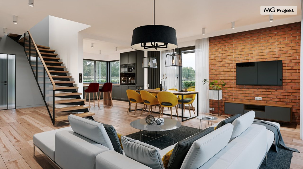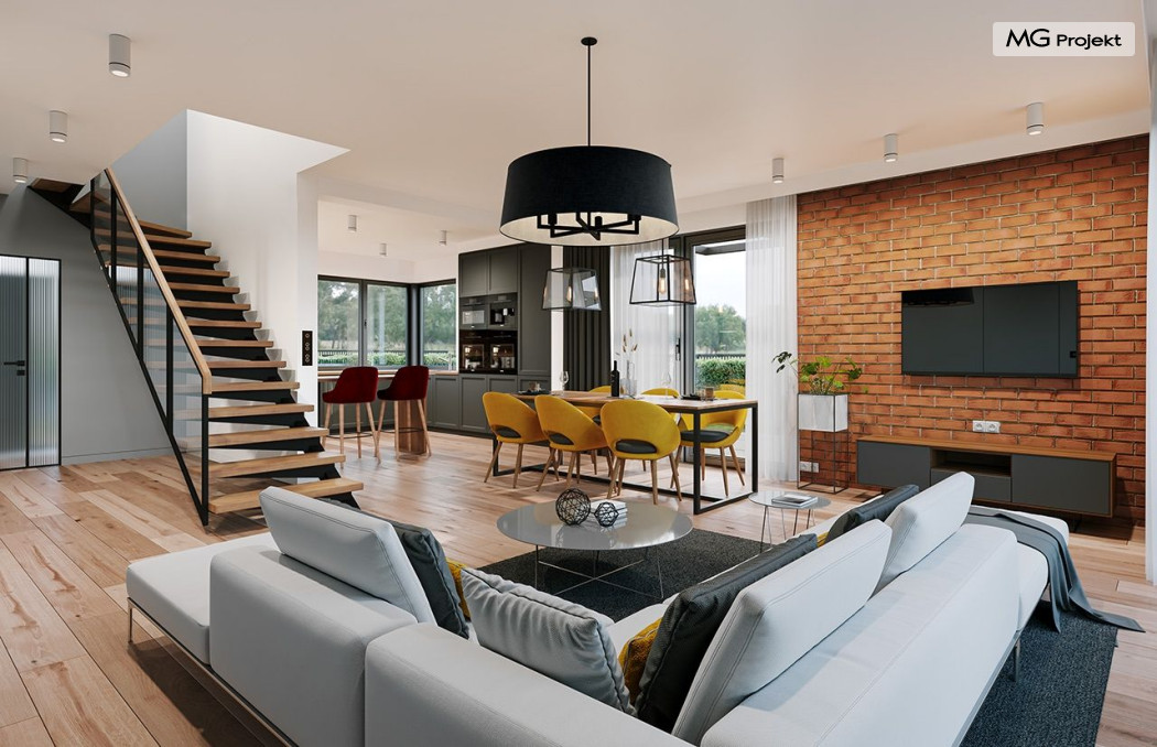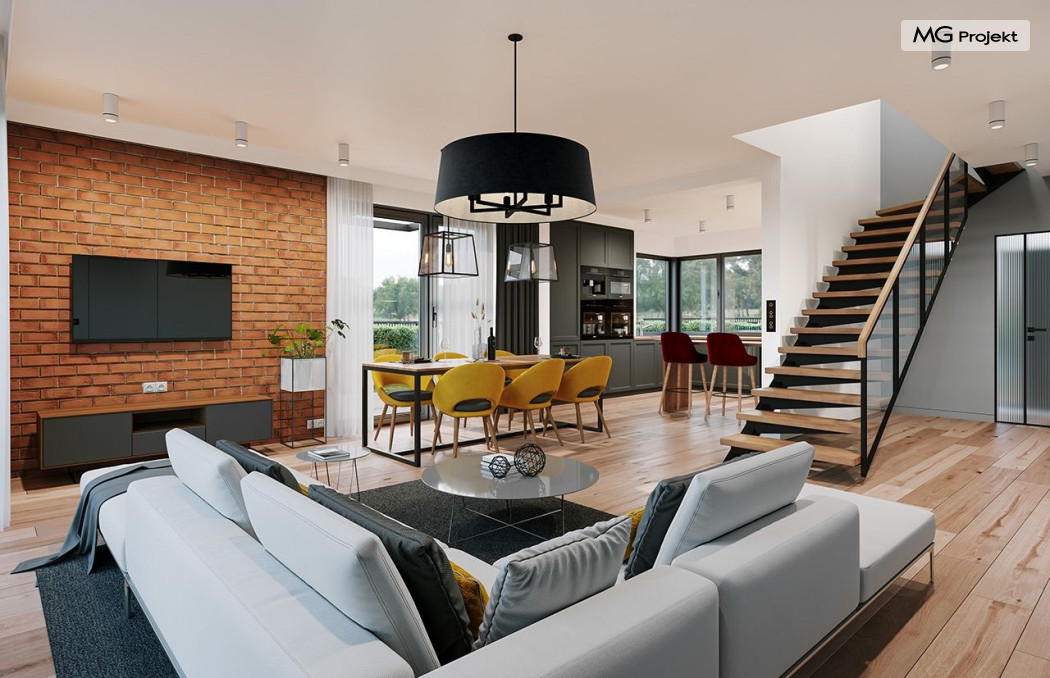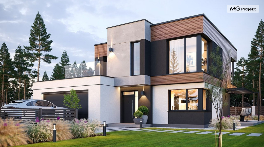 Projekt domu Qubik 4 jest to projekt nowoczesnego piętrowego domu jednorodzinnego z przeznaczeniem dla rodziny 4-6 osobowej. Dom został zaprojektowany na planie zbliżonym do kwadratu, z wbudowanym dwustanowiskowym garażem. Budynek składa się z kilku przenikających się wzajemnie prostopadłościennych brył i zwieńczony jest dachem płaskim. Elewację frontową zdobi wystający nad podestem wejściowym wykusz, ściany podzielone poziomymi pasami i duże przeszklenia pomieszczeń na parterze i piętrze. Od strony ogrodowej elewacja domu została uspokojona. Zastosowano tu delikatne przesunięcie fragmentów bryły wykończonych w kontrastujących kolorach. uzyskano tym samym ciekawy efekt, jednocześnie pozostawiając tą stronę domu spokojniejszą, mniej agresywną, bardziej współgrającą z otaczającym ogrodem i tarasem dostępnym z salonu. Kontrastujące materiały i kolory elewacji i duże przeszklenia okien dają budynkowi wyrazisty nowoczesny styl. Wnętrze domu podzielone zostało na cześć dzienną i techniczną na parterze i pokoje sypialne na piętrze. Jednoprzestrzenne wnętrze salonu połączonego wizualnie z kuchnią i holem daje bardzo komfortową część do codziennego funkcjonowania domowników. Dodatkowy pokój na parterze z własną łazienką i garderobą może pełnić rozmaite funkcje – gabinetu lub sypialni. Dwustanowiskowy garaż z kotłownią domykają parter. Na piętrze mamy cztery pokoje sypialne z dwiema łazienkami, garderobą i szafami w zabudowie. Sypialnia master ma własną łazienkę i garderobę. Konstrukcja budynku jest prosta i dość łatwa w budowie. W domu zastosowano bardzo dobre izolacje i nowoczesne instalacje, dzięki czemu jest on energooszczędny i będzie niedrogi w przyszłej eksploatacji. Qubik 4 to doskonała propozycja dla Inwestorów pragnących oryginalnego nowoczesnego komfortowego domu o funkcjonalnym wnętrzu i nietuzinkowej architekturze, wyróżniającej się w otoczeniu. Zapraszamy !
