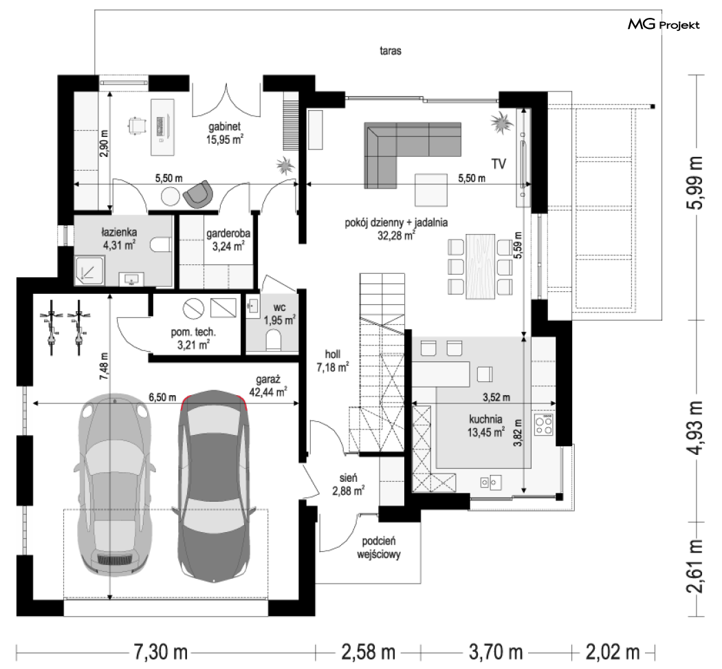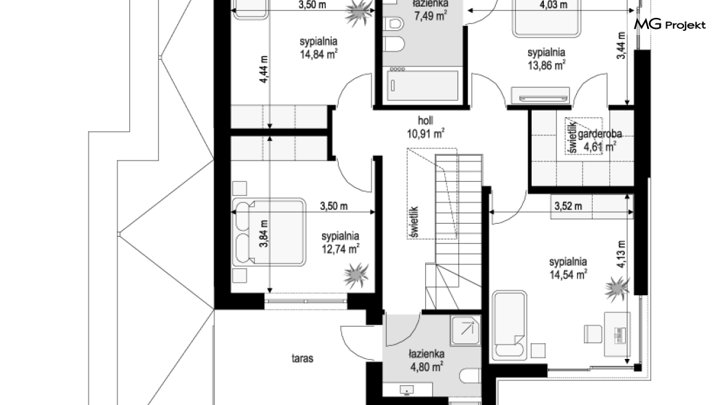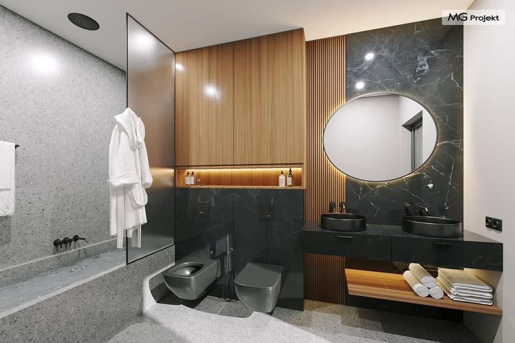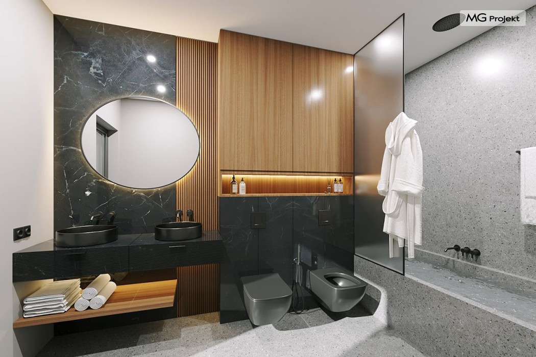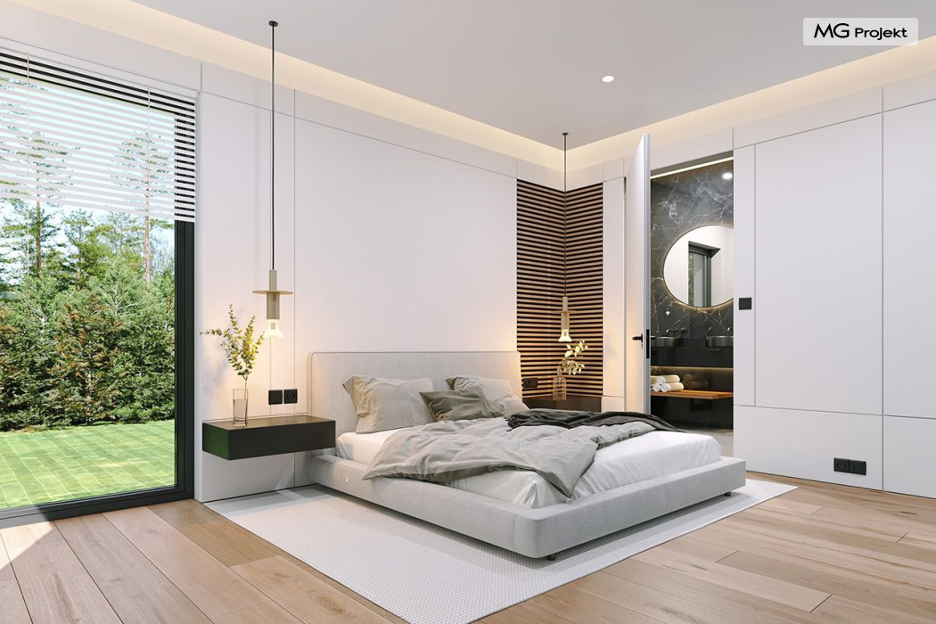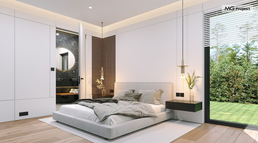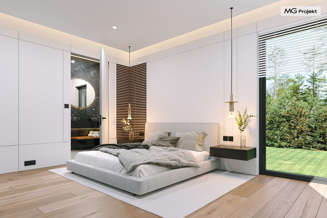 Projekt domu Qubik 4 jest to projekt nowoczesnego piętrowego domu jednorodzinnego z przeznaczeniem dla rodziny 4-6 osobowej. Dom został zaprojektowany na planie zbliżonym do kwadratu, z wbudowanym dwustanowiskowym garażem. Budynek składa się z kilku przenikających się wzajemnie prostopadłościennych brył i zwieńczony jest dachem płaskim. Elewację frontową zdobi wystający nad podestem wejściowym wykusz, ściany podzielone poziomymi pasami i duże przeszklenia pomieszczeń na parterze i piętrze. Od strony ogrodowej elewacja domu została uspokojona. Zastosowano tu delikatne przesunięcie fragmentów bryły wykończonych w kontrastujących kolorach. uzyskano tym samym ciekawy efekt, jednocześnie pozostawiając tą stronę domu spokojniejszą, mniej agresywną, bardziej współgrającą z otaczającym ogrodem i tarasem dostępnym z salonu. Kontrastujące materiały i kolory elewacji i duże przeszklenia okien dają budynkowi wyrazisty nowoczesny styl. Wnętrze domu podzielone zostało na cześć dzienną i techniczną na parterze i pokoje sypialne na piętrze. Jednoprzestrzenne wnętrze salonu połączonego wizualnie z kuchnią i holem daje bardzo komfortową część do codziennego funkcjonowania domowników. Dodatkowy pokój na parterze z własną łazienką i garderobą może pełnić rozmaite funkcje – gabinetu lub sypialni. Dwustanowiskowy garaż z kotłownią domykają parter. Na piętrze mamy cztery pokoje sypialne z dwiema łazienkami, garderobą i szafami w zabudowie. Sypialnia master ma własną łazienkę i garderobę. Konstrukcja budynku jest prosta i dość łatwa w budowie. W domu zastosowano bardzo dobre izolacje i nowoczesne instalacje, dzięki czemu jest on energooszczędny i będzie niedrogi w przyszłej eksploatacji. Qubik 4 to doskonała propozycja dla Inwestorów pragnących oryginalnego nowoczesnego komfortowego domu o funkcjonalnym wnętrzu i nietuzinkowej architekturze, wyróżniającej się w otoczeniu. Zapraszamy !
