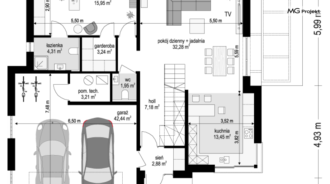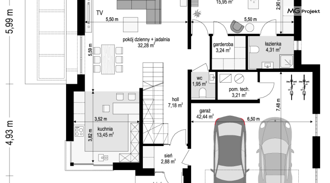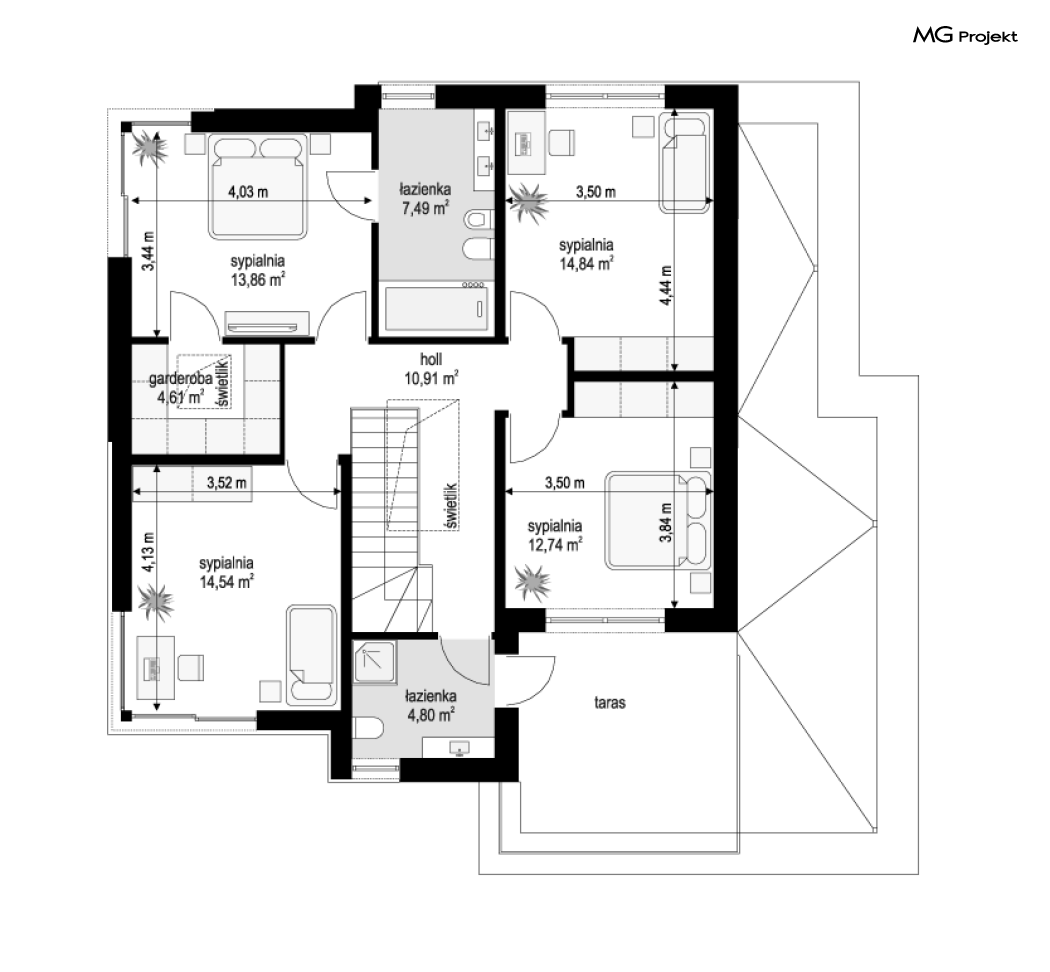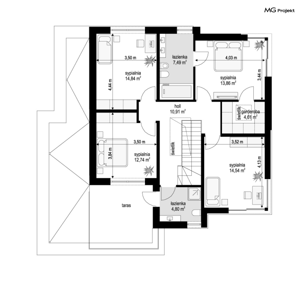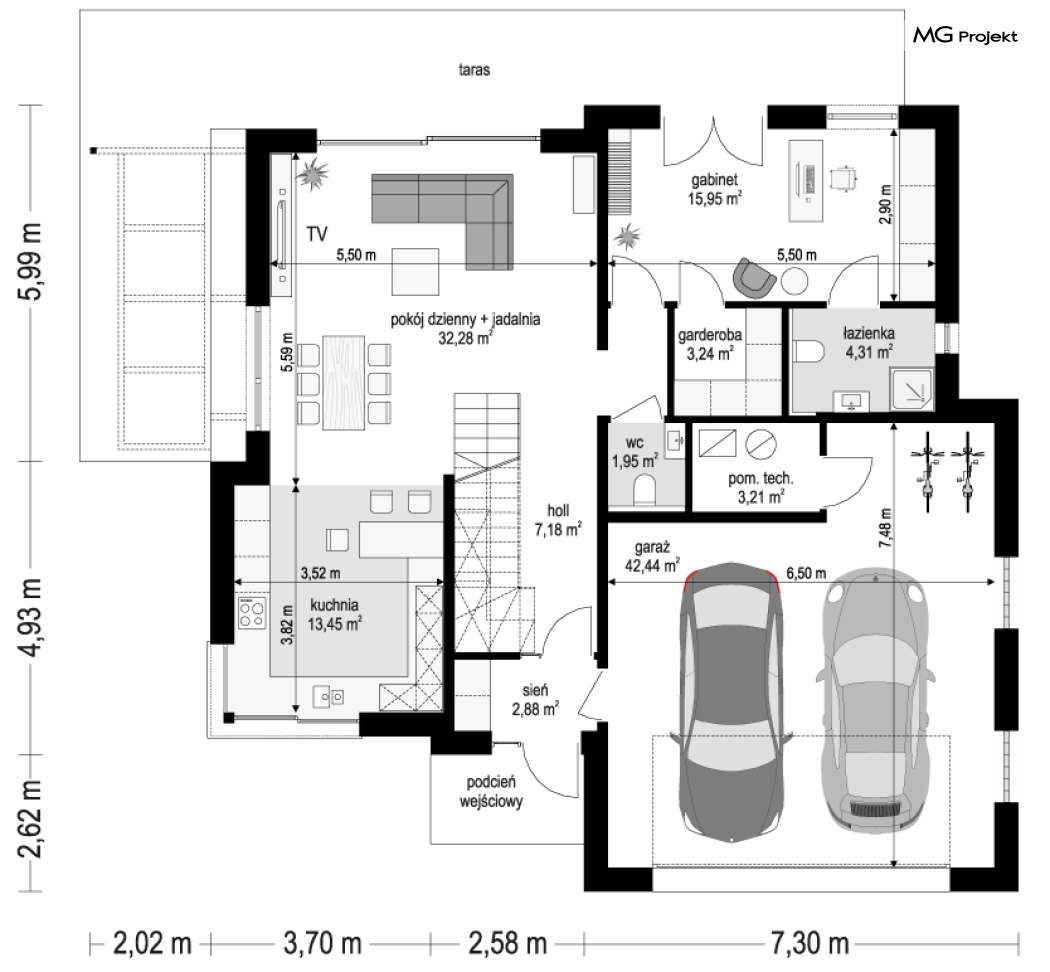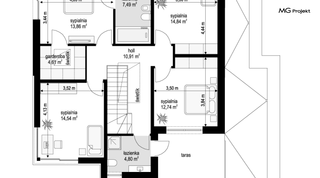 Projekt domu Qubik 4 jest to projekt nowoczesnego piętrowego domu jednorodzinnego z przeznaczeniem dla rodziny 4-6 osobowej. Dom został zaprojektowany na planie zbliżonym do kwadratu, z wbudowanym dwustanowiskowym garażem. Budynek składa się z kilku przenikających się wzajemnie prostopadłościennych brył i zwieńczony jest dachem płaskim. Elewację frontową zdobi wystający nad podestem wejściowym wykusz, ściany podzielone poziomymi pasami i duże przeszklenia pomieszczeń na parterze i piętrze. Od strony ogrodowej elewacja domu została uspokojona. Zastosowano tu delikatne przesunięcie fragmentów bryły wykończonych w kontrastujących kolorach. uzyskano tym samym ciekawy efekt, jednocześnie pozostawiając tą stronę domu spokojniejszą, mniej agresywną, bardziej współgrającą z otaczającym ogrodem i tarasem dostępnym z salonu. Kontrastujące materiały i kolory elewacji i duże przeszklenia okien dają budynkowi wyrazisty nowoczesny styl. Wnętrze domu podzielone zostało na cześć dzienną i techniczną na parterze i pokoje sypialne na piętrze. Jednoprzestrzenne wnętrze salonu połączonego wizualnie z kuchnią i holem daje bardzo komfortową część do codziennego funkcjonowania domowników. Dodatkowy pokój na parterze z własną łazienką i garderobą może pełnić rozmaite funkcje – gabinetu lub sypialni. Dwustanowiskowy garaż z kotłownią domykają parter. Na piętrze mamy cztery pokoje sypialne z dwiema łazienkami, garderobą i szafami w zabudowie. Sypialnia master ma własną łazienkę i garderobę. Konstrukcja budynku jest prosta i dość łatwa w budowie. W domu zastosowano bardzo dobre izolacje i nowoczesne instalacje, dzięki czemu jest on energooszczędny i będzie niedrogi w przyszłej eksploatacji. Qubik 4 to doskonała propozycja dla Inwestorów pragnących oryginalnego nowoczesnego komfortowego domu o funkcjonalnym wnętrzu i nietuzinkowej architekturze, wyróżniającej się w otoczeniu. Zapraszamy !