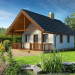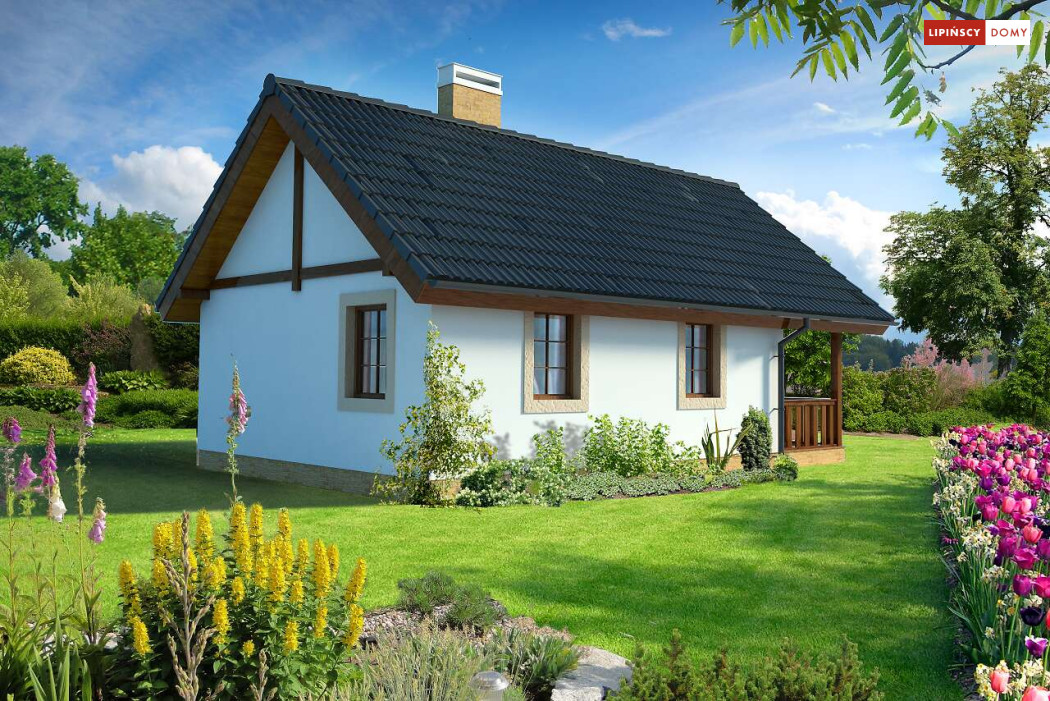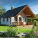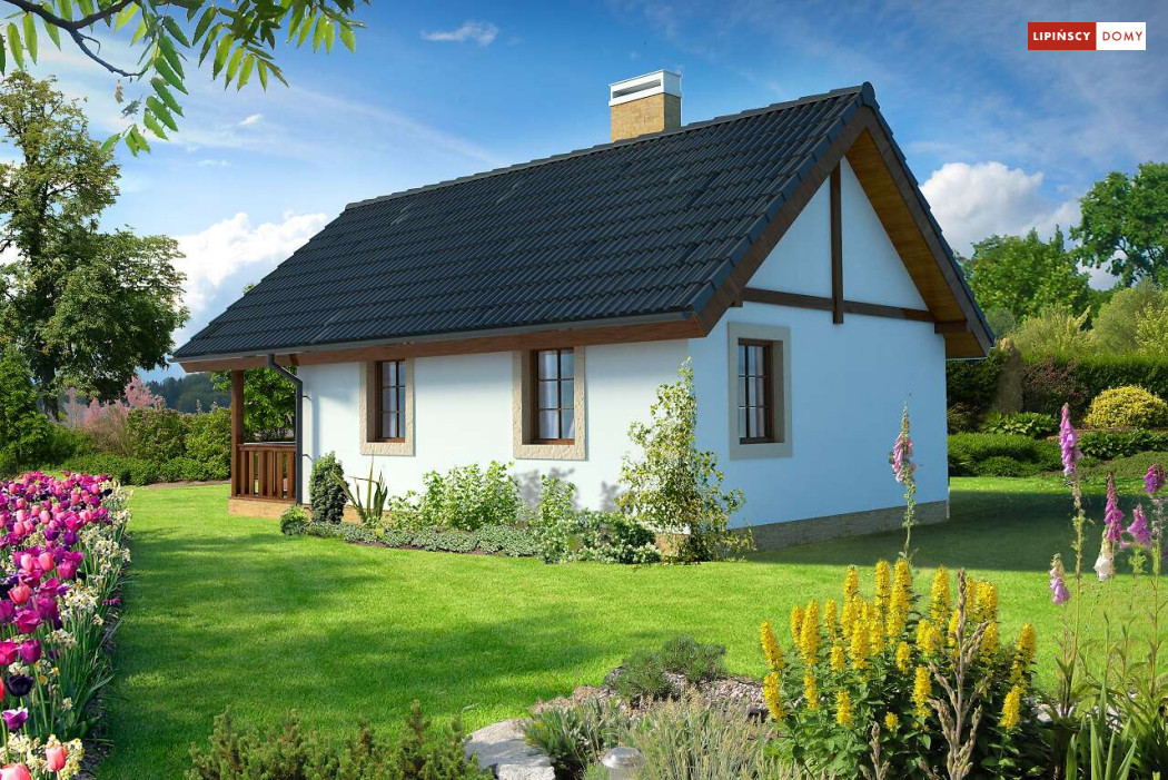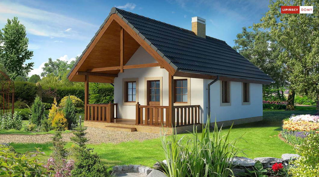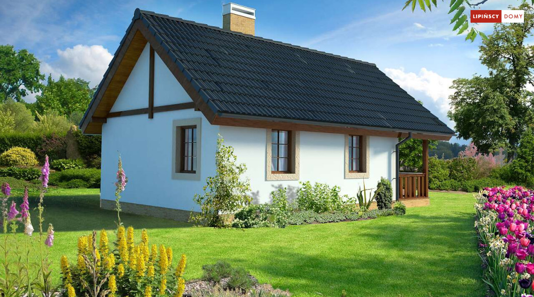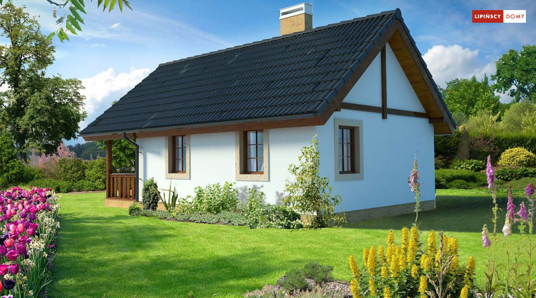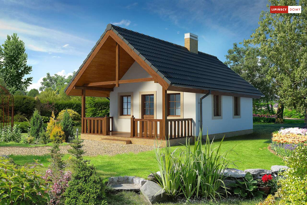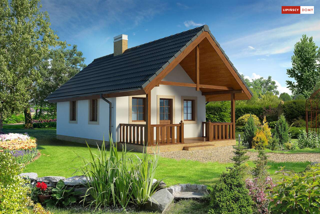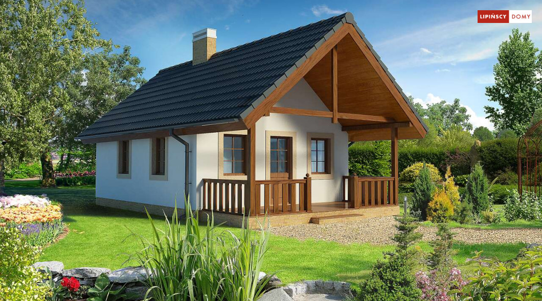 Mały, funkcjonalny domek weekendowy, prosty w budowie. Parterowy, oferujący maksimum komfortu na minimalnej powierzchni. Dodatkowym atutem jest wygodny zadaszony taras, umożliwiający korzystanie z uroków natury również w mniej sprzyjających warunkach pogodowych. Serce domu stanowi kominek wokół którego rozwiązano przestrzeń mieszkaniową. Znajduje się tu pokój kominkowy, aneks kuchenny, łazienka i sypialnia. Bryła budynku jest harmonijna, detal ładny i wyważony.