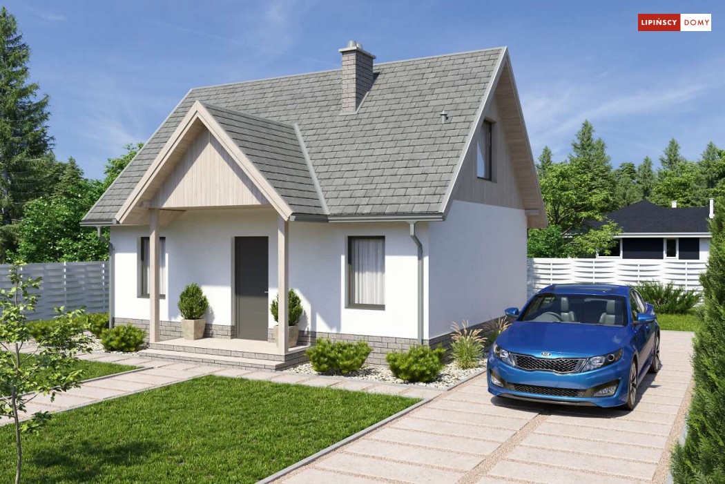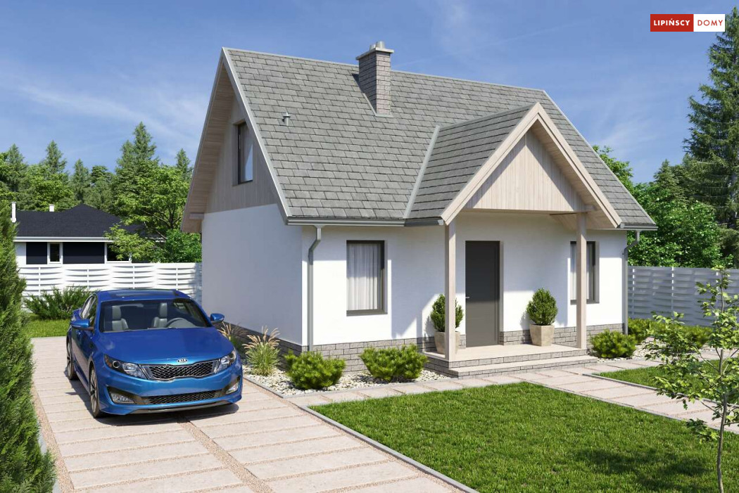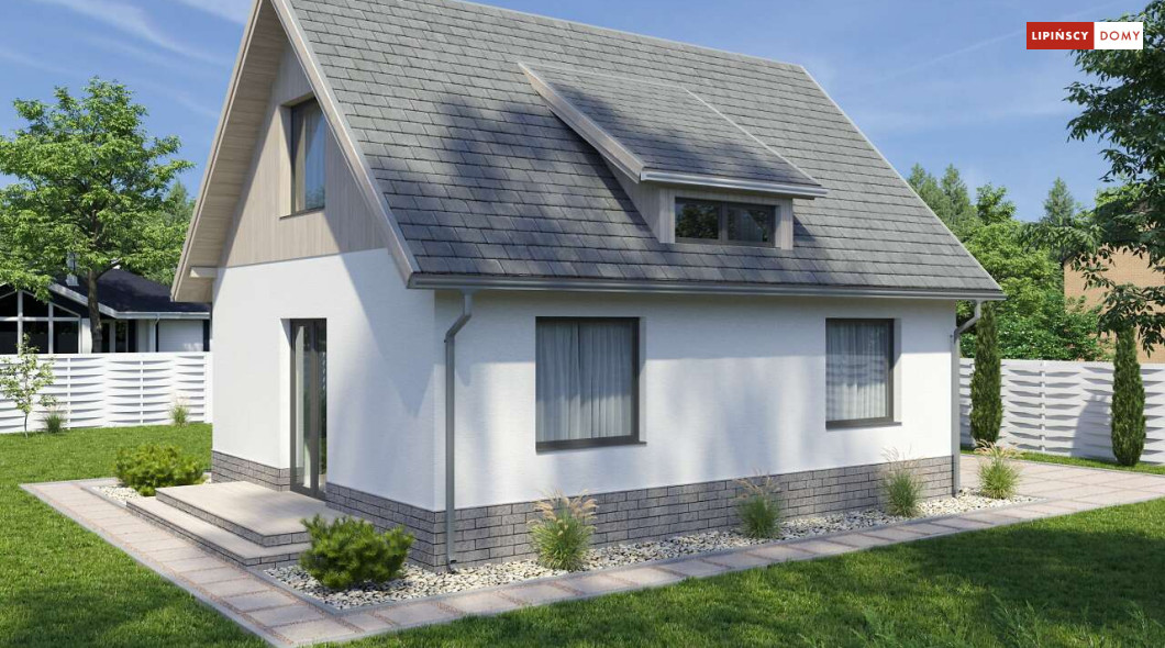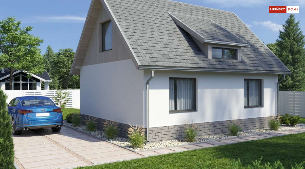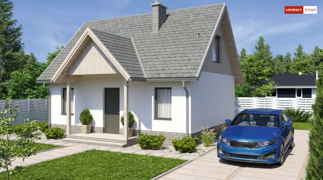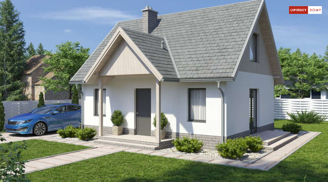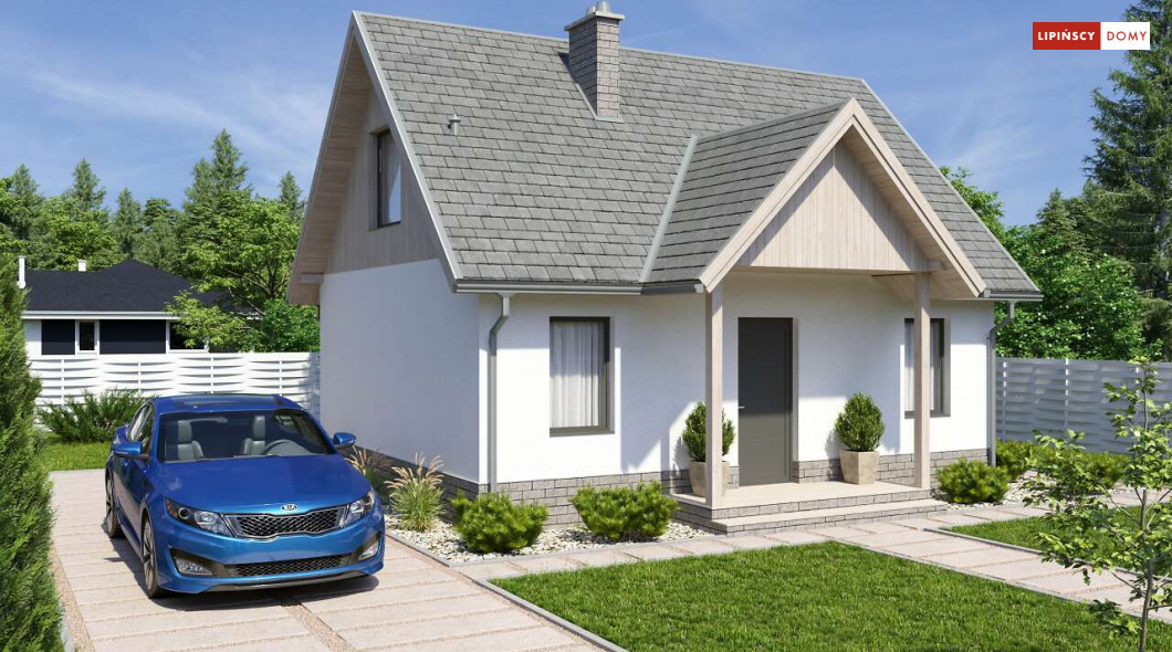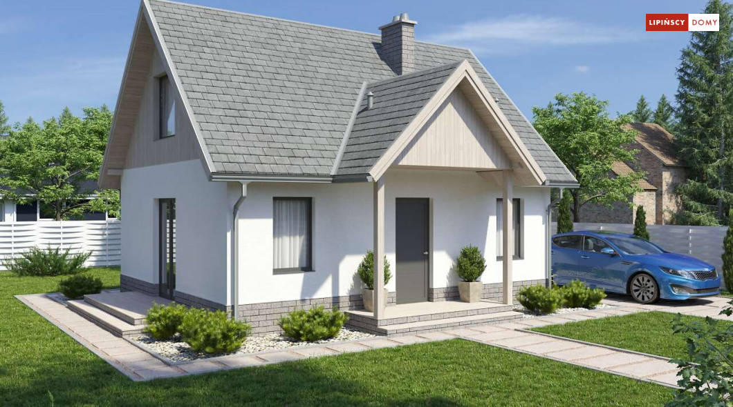 Wdzięczny, mały domek dla niedużej rodziny. Na niewielkiej powierzchni zgrabnie zakomponowano cztery pokoje kuchnię, łazienkę i pomieszczenie gospodarcze. Z zadaszonego ganku przechodzi się do wiatrołapu, przy którym jest łazienka z kotłem c. o. Pokój dzienny stanowi przestrzeń integrującą życie rodziny. Jest tu miejsce na kominek, kącik wypoczynkowy, stół jadalniany i wydzieloną część kuchenną. Obok znajduje się jedna sypialnia. Drewniane schody prowadzą na poddasze, gdzie są dwie sypialnie i garderoba. Sypialnie są wystarczająco wygodne i ustawne, a garderoba bardzo praktyczna.