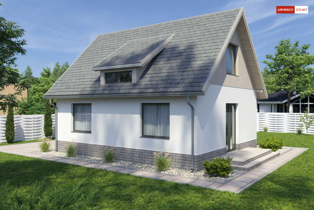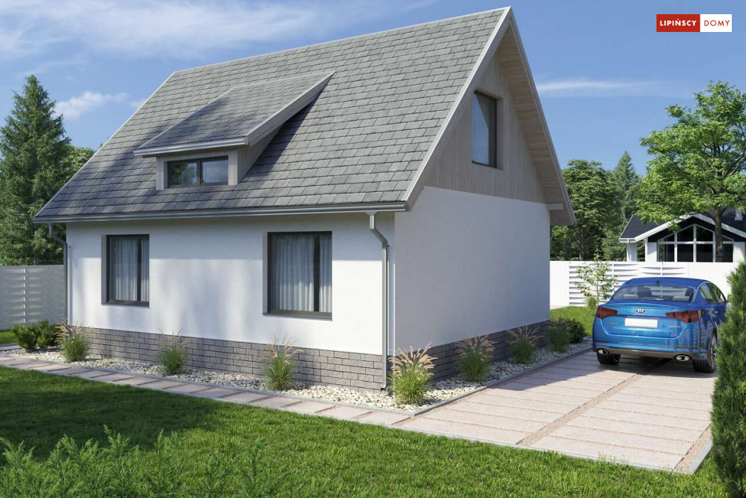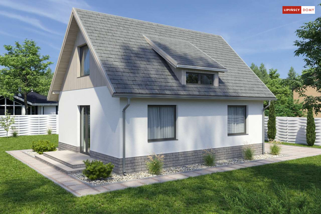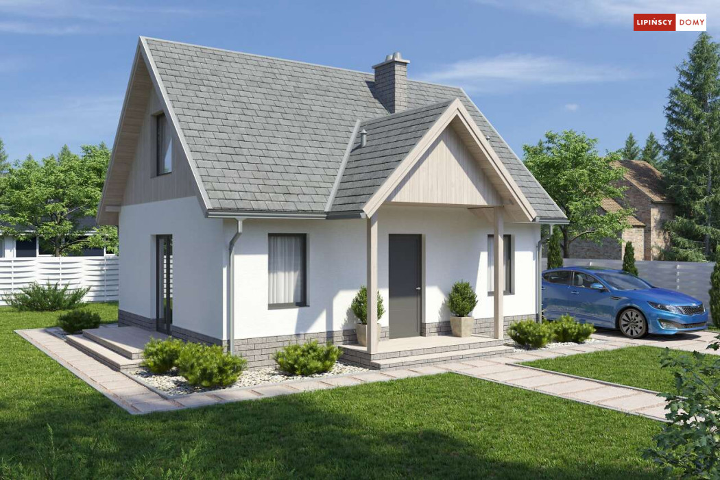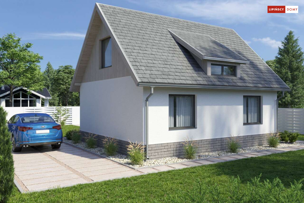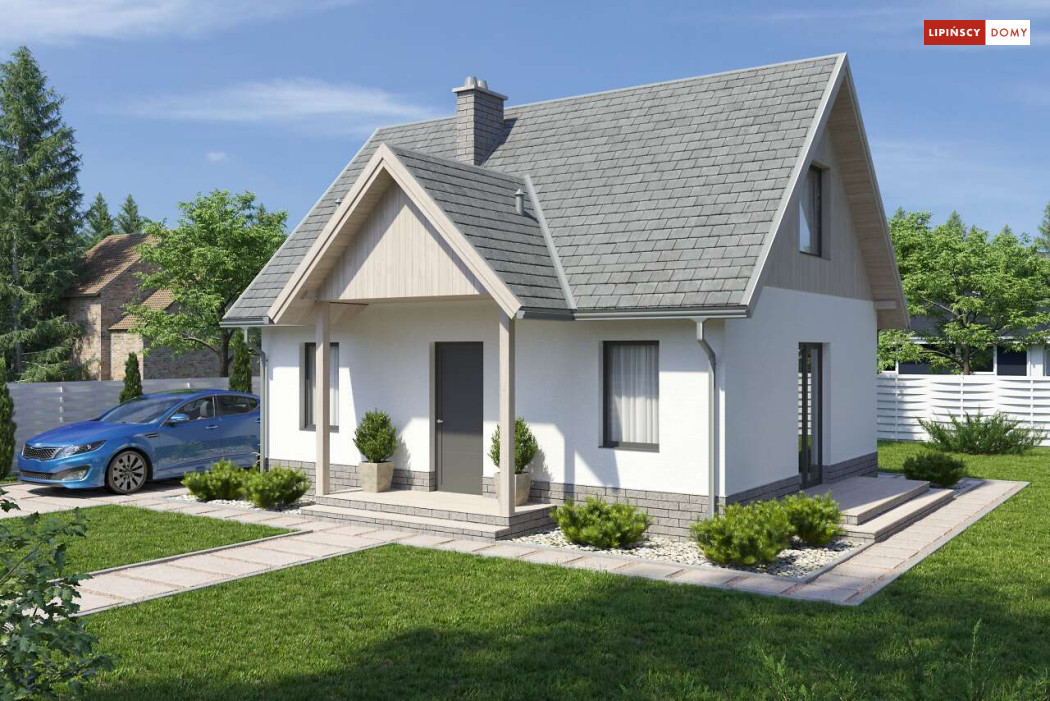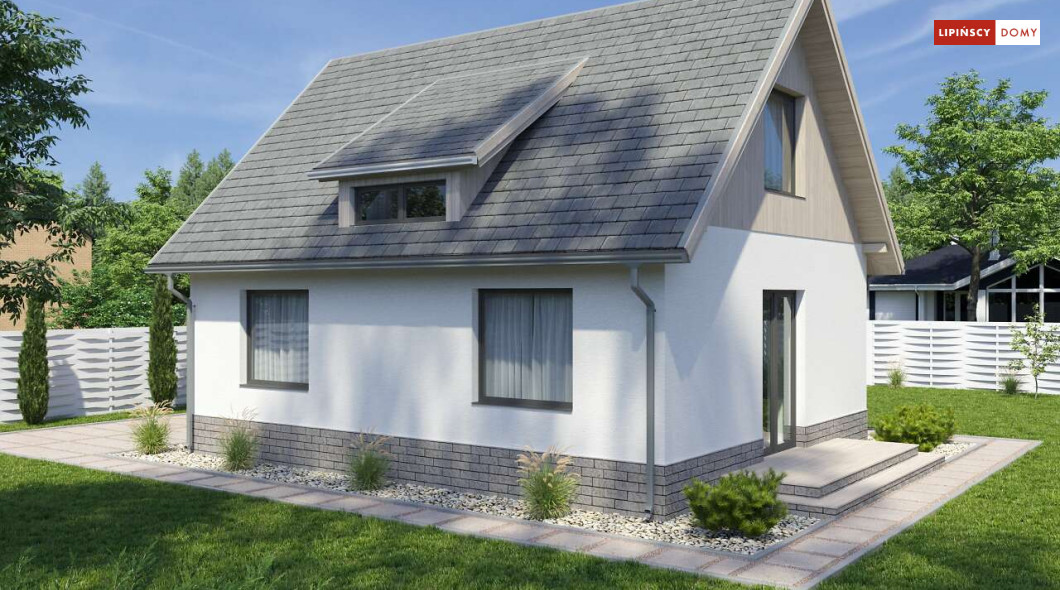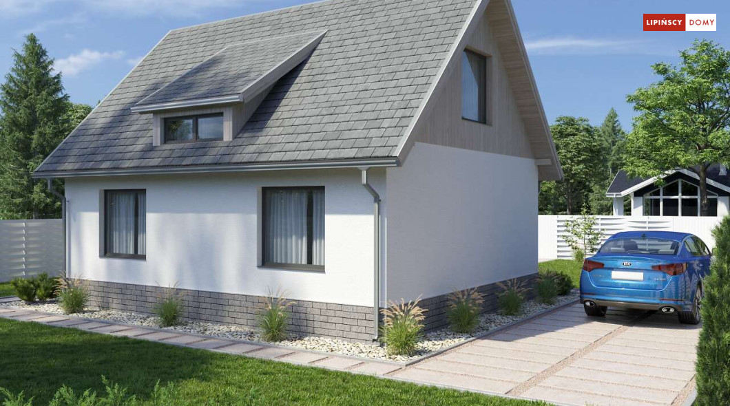 Wdzięczny, mały domek dla niedużej rodziny. Na niewielkiej powierzchni zgrabnie zakomponowano cztery pokoje kuchnię, łazienkę i pomieszczenie gospodarcze. Z zadaszonego ganku przechodzi się do wiatrołapu, przy którym jest łazienka z kotłem c. o. Pokój dzienny stanowi przestrzeń integrującą życie rodziny. Jest tu miejsce na kominek, kącik wypoczynkowy, stół jadalniany i wydzieloną część kuchenną. Obok znajduje się jedna sypialnia. Drewniane schody prowadzą na poddasze, gdzie są dwie sypialnie i garderoba. Sypialnie są wystarczająco wygodne i ustawne, a garderoba bardzo praktyczna.