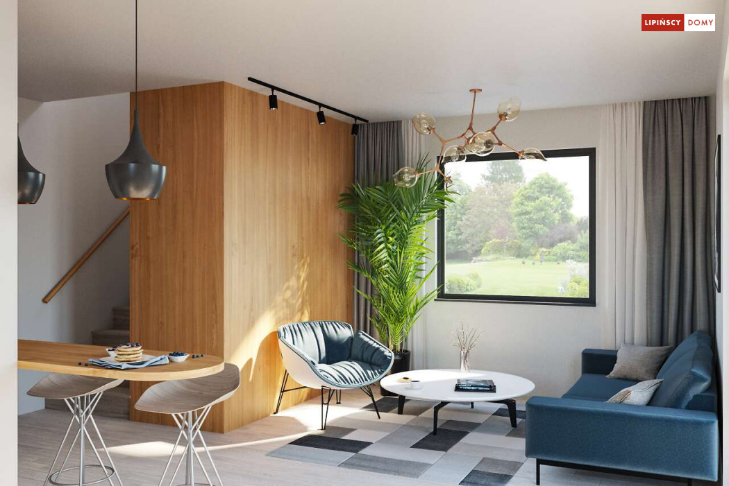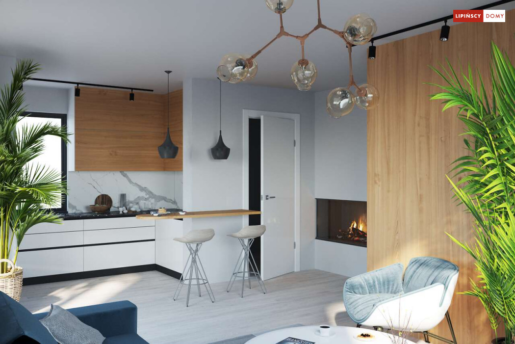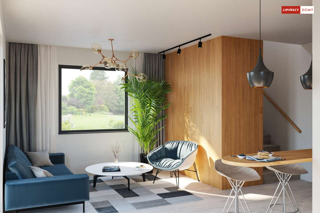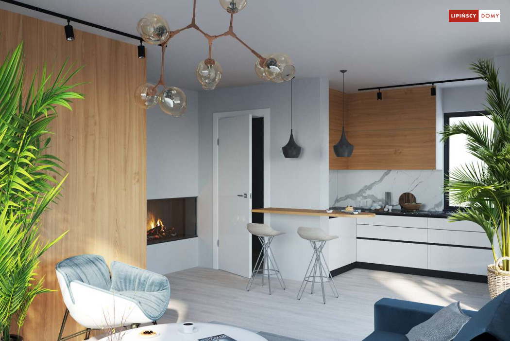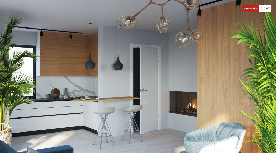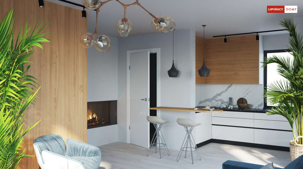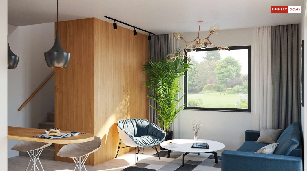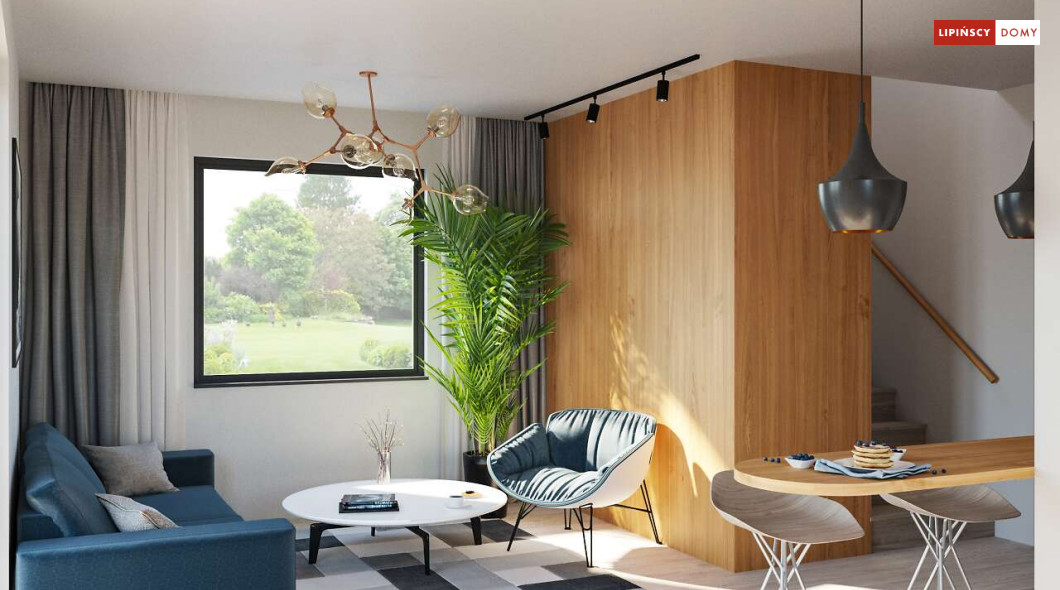 Wdzięczny, mały domek dla niedużej rodziny. Na niewielkiej powierzchni zgrabnie zakomponowano cztery pokoje kuchnię, łazienkę i pomieszczenie gospodarcze. Z zadaszonego ganku przechodzi się do wiatrołapu, przy którym jest łazienka z kotłem c. o. Pokój dzienny stanowi przestrzeń integrującą życie rodziny. Jest tu miejsce na kominek, kącik wypoczynkowy, stół jadalniany i wydzieloną część kuchenną. Obok znajduje się jedna sypialnia. Drewniane schody prowadzą na poddasze, gdzie są dwie sypialnie i garderoba. Sypialnie są wystarczająco wygodne i ustawne, a garderoba bardzo praktyczna.