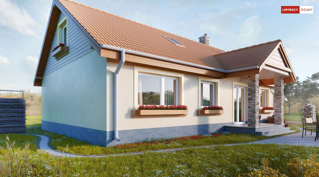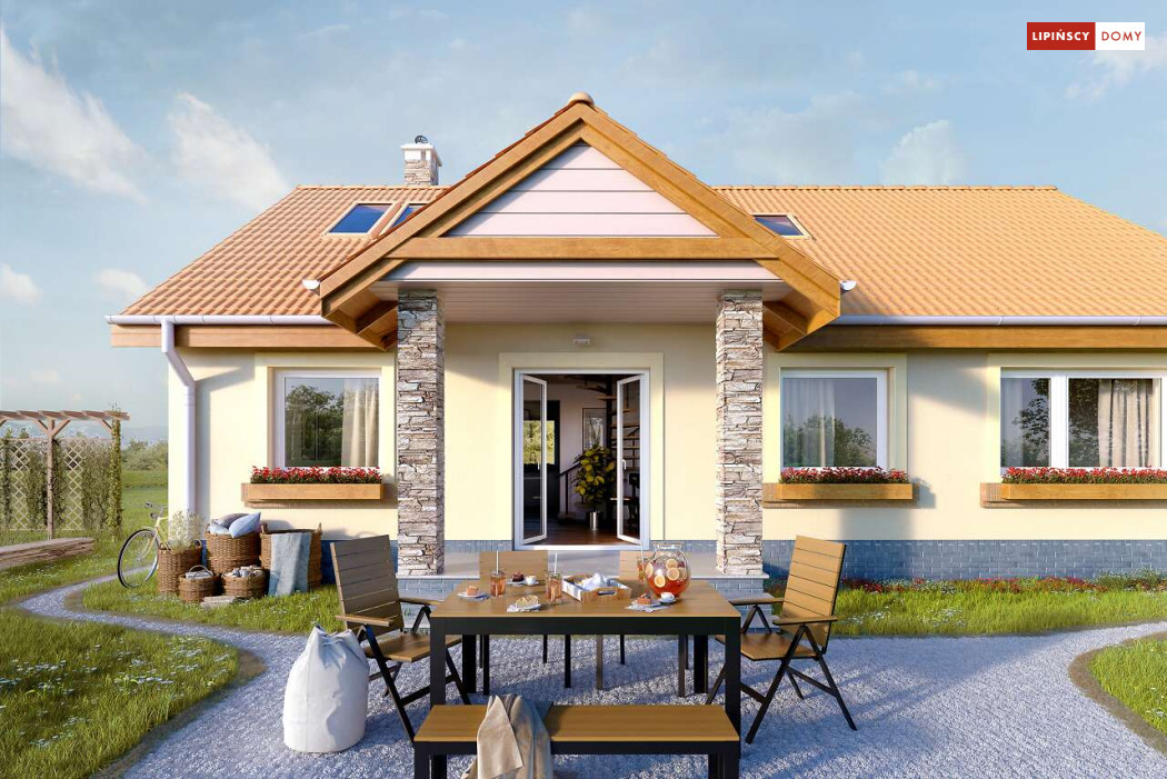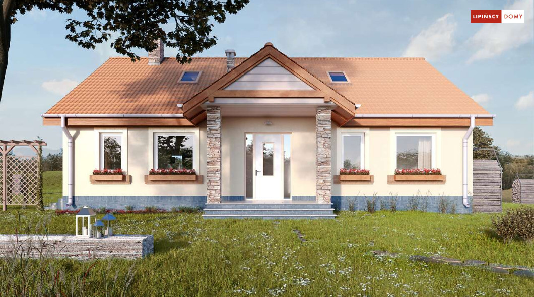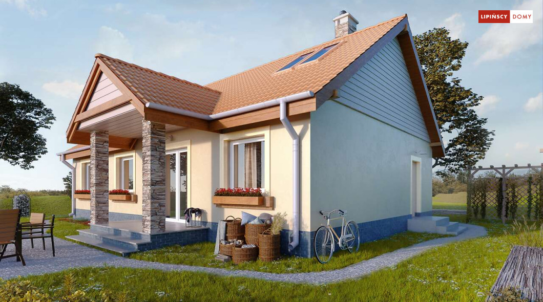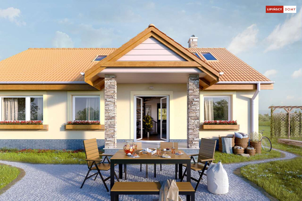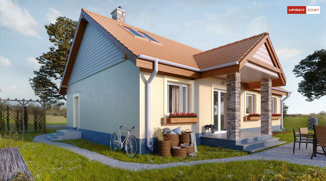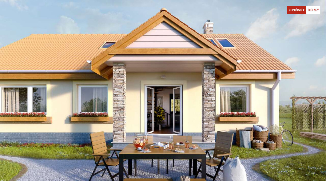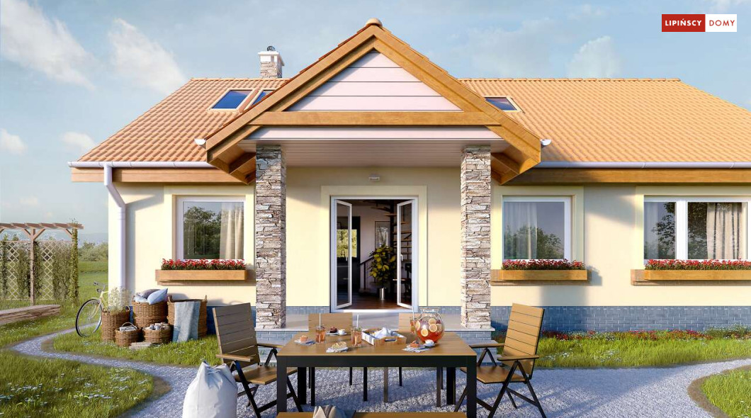 Jest to parterowy dom o prostym kształcie. Akcentami elewacji są dwuspadowe zadaszenia wsparte na masywnych prostokątnych słupach. Taras wejściowy i spory wiatrołap z miejscem na pojemne szafy prowadzą do wnętrza domu. Trzy sypialnie i wygodna łazienka po lewej stronie wejścia to strefa nocna. Pokój dzienny łączy się z dużą kuchnią w jedną przestrzeń. Jest tu miejsce na kąt wypoczynkowy przy kominku, stół jadalny, kręcone schody na ewentualne poddasze. W projekcie przewidziano ogrzewanie kotłem na gaz. Możliwa jest zmiana ogrzewania na pompę ciepła.