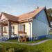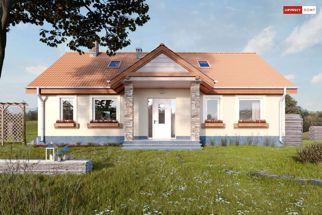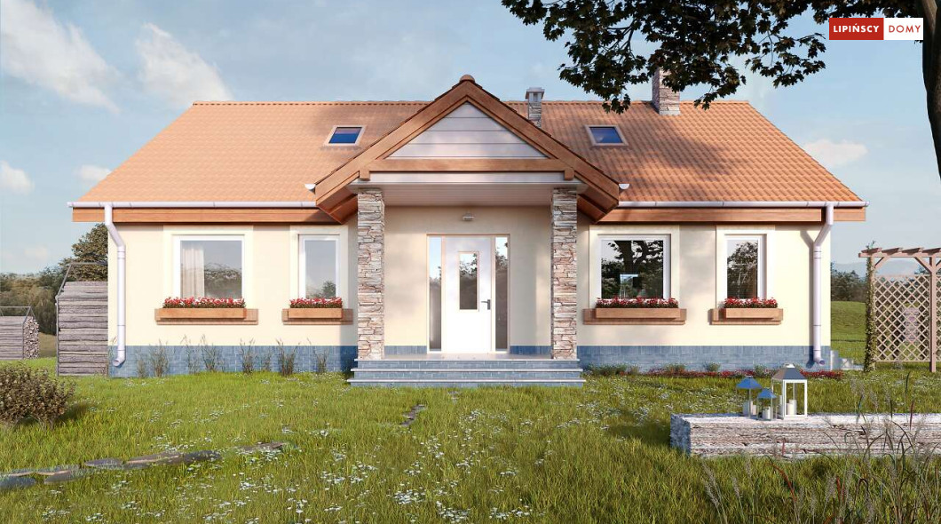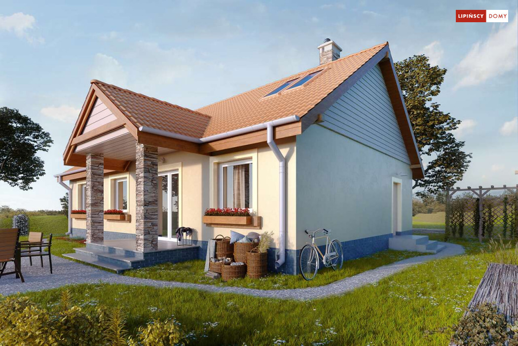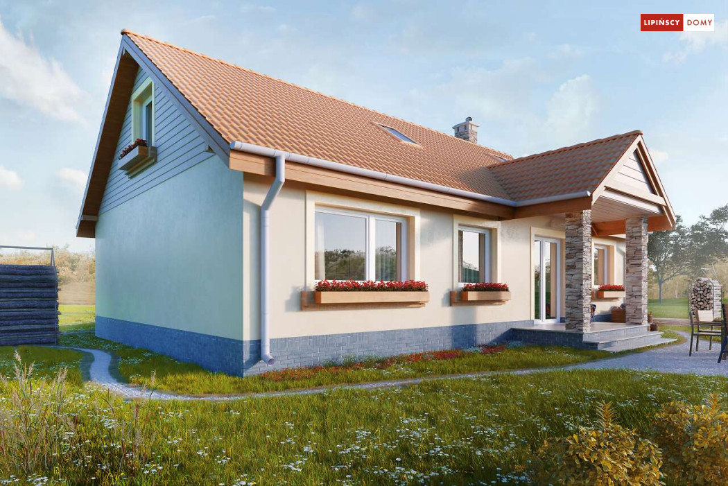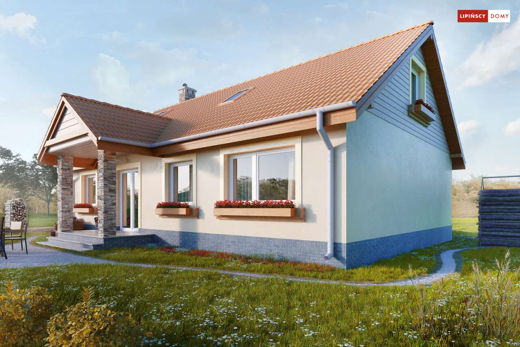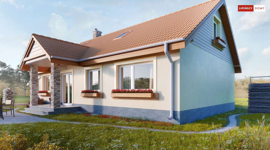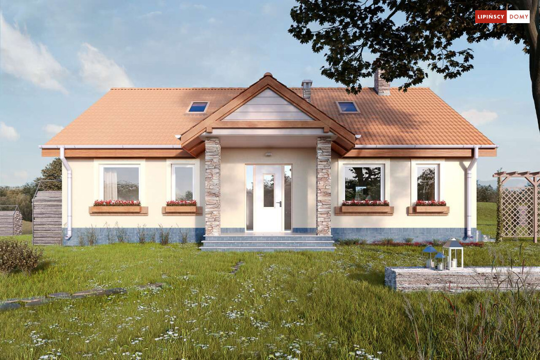Jest to parterowy dom o prostym kształcie. Akcentami elewacji są dwuspadowe zadaszenia wsparte na masywnych prostokątnych słupach. Taras wejściowy i spory wiatrołap z miejscem na pojemne szafy prowadzą do wnętrza domu. Trzy sypialnie i wygodna łazienka po lewej stronie wejścia to strefa nocna. Pokój dzienny łączy się z dużą kuchnią w jedną przestrzeń. Jest tu miejsce na kąt wypoczynkowy przy kominku, stół jadalny, kręcone schody na ewentualne poddasze. W projekcie przewidziano ogrzewanie kotłem na gaz. Możliwa jest zmiana ogrzewania na pompę ciepła.