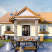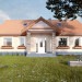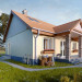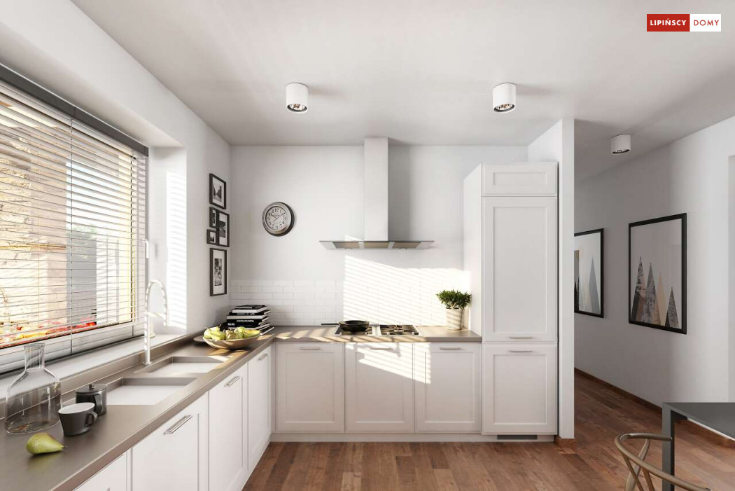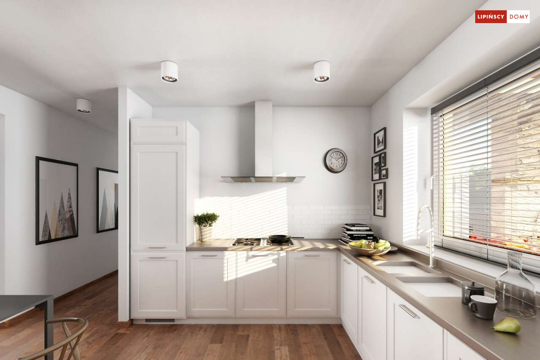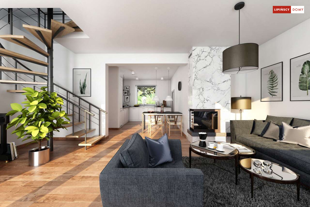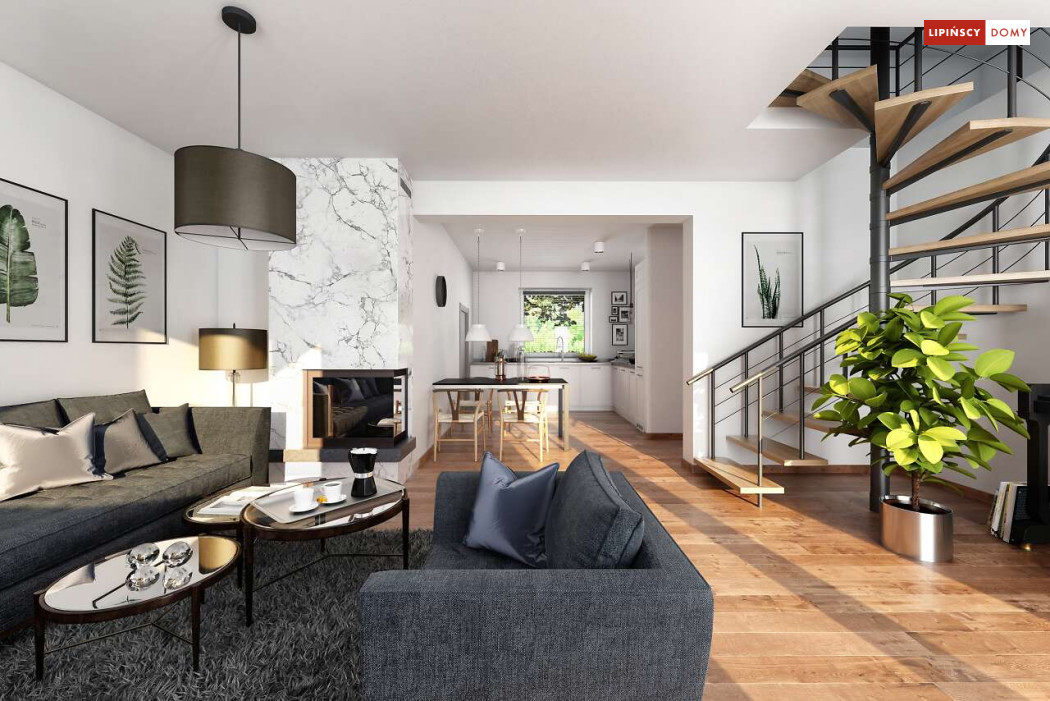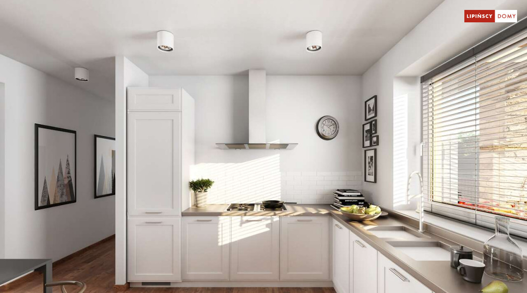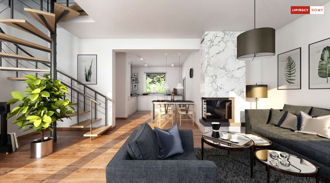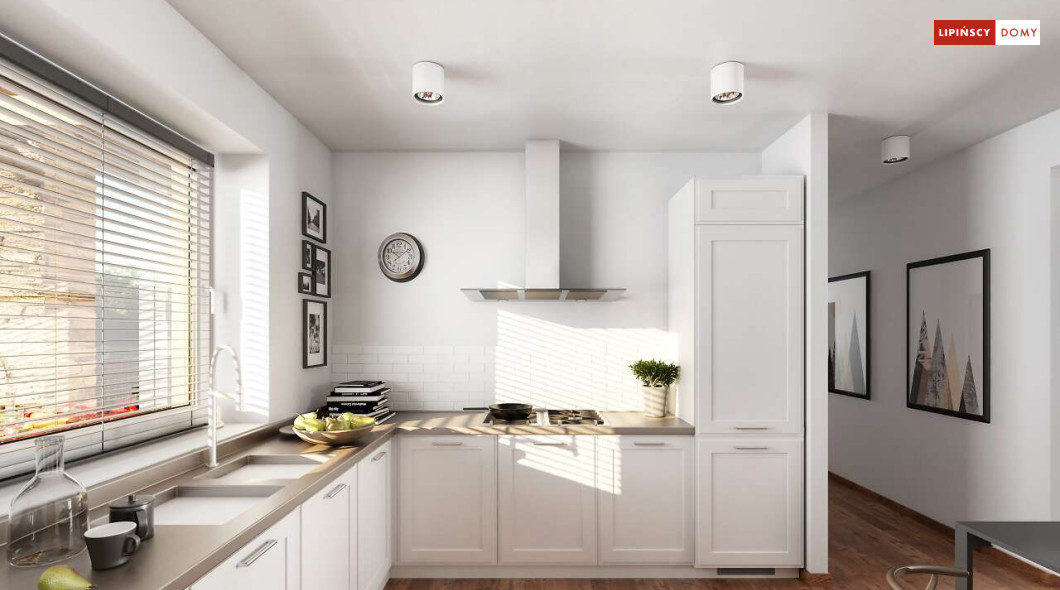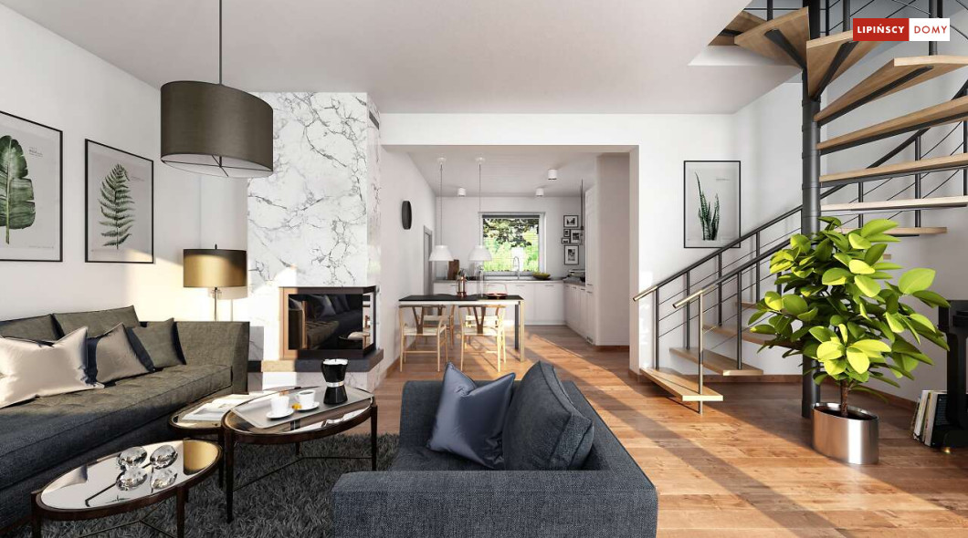 Jest to parterowy dom o prostym kształcie. Akcentami elewacji są dwuspadowe zadaszenia wsparte na masywnych prostokątnych słupach. Taras wejściowy i spory wiatrołap z miejscem na pojemne szafy prowadzą do wnętrza domu. Trzy sypialnie i wygodna łazienka po lewej stronie wejścia to strefa nocna. Pokój dzienny łączy się z dużą kuchnią w jedną przestrzeń. Jest tu miejsce na kąt wypoczynkowy przy kominku, stół jadalny, kręcone schody na ewentualne poddasze. W projekcie przewidziano ogrzewanie kotłem na gaz. Możliwa jest zmiana ogrzewania na pompę ciepła.