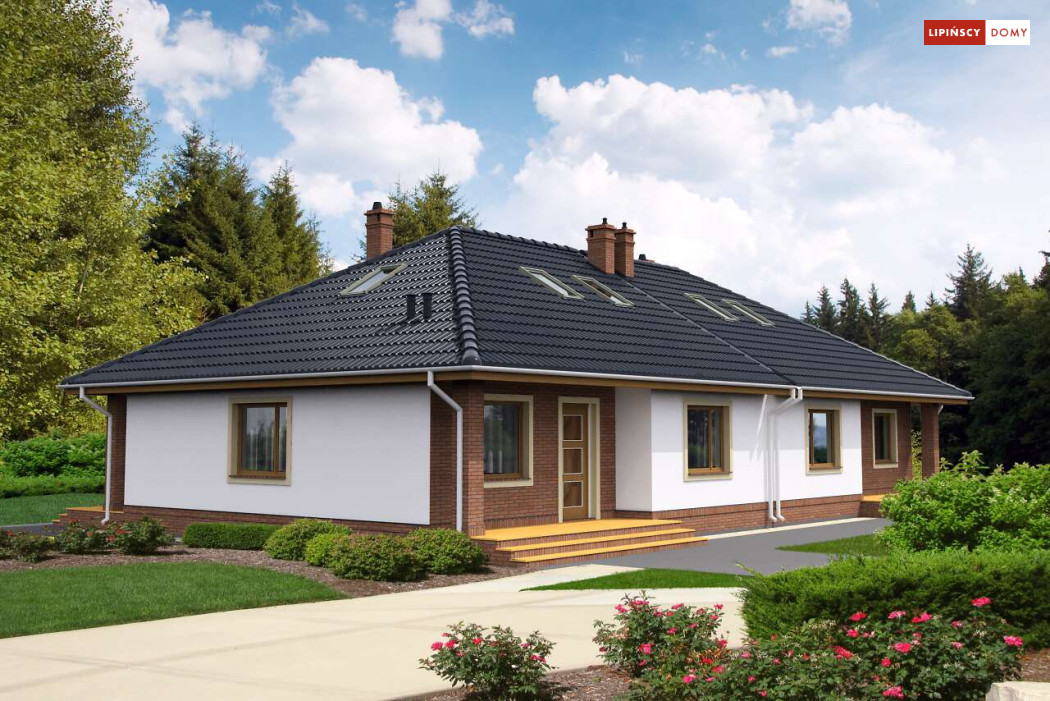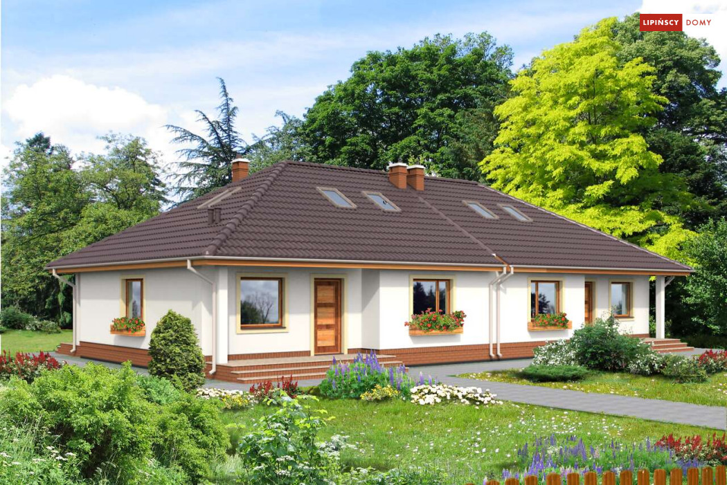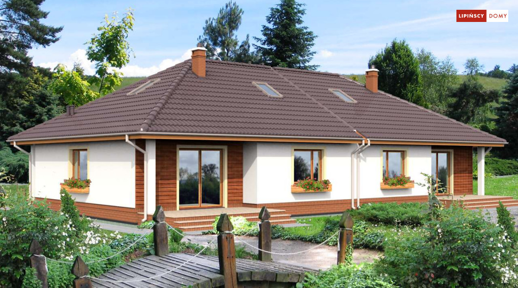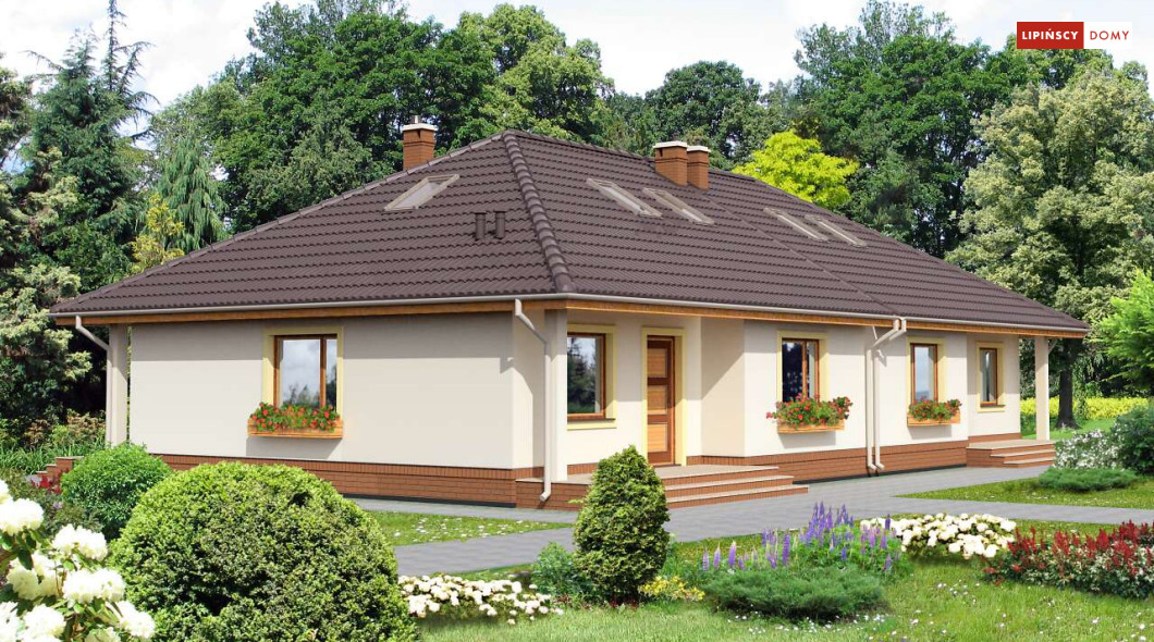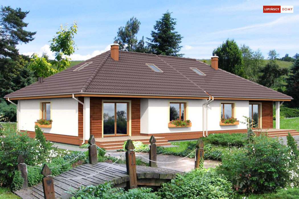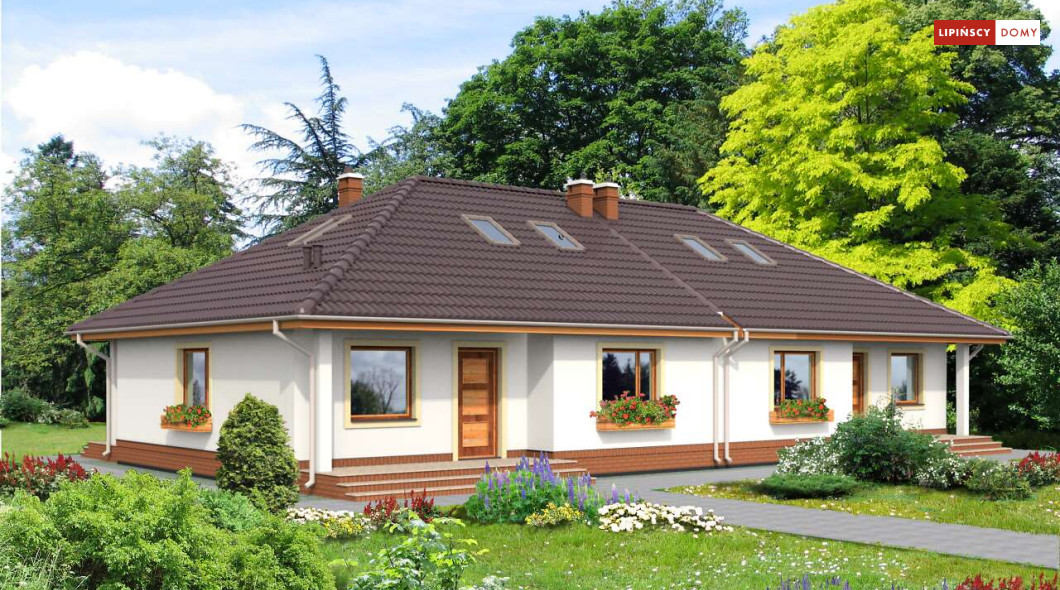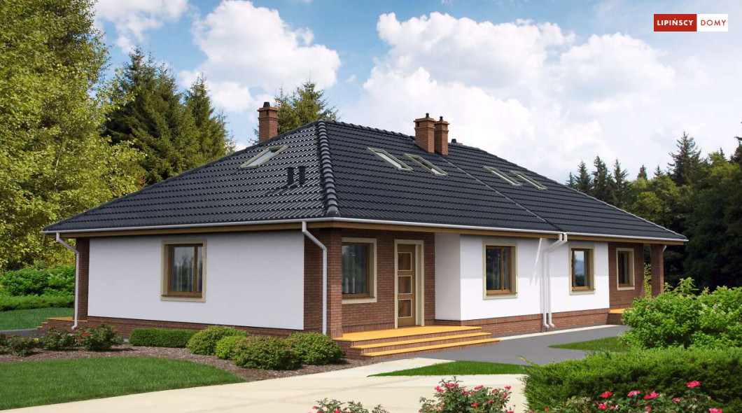 Oba segmenty domu przykrywa dach czterospadowy o łagodnym spadku nadając prostej bryle bliźniaka horyzontalny charakter. Narożniki budynku zaakcentowane są wcięciami, w które wnikają tarasy: wejściowy i ogrodowy. Dach budynku nad nimi wspierają murowane słupy. Dodaje to formie odrobinę ażurowości. Elewacje uzupełniają drewniane elementy okładziny ściany tarasu ogrodowego i kwietniki pod oknami. Na parterze, zaraz za wiatrołapem ma miejsce pokój dzienny z kominkiem, aneksem jadalnym i niewielką, otwartą kuchnią. Znajdują się tu również dwie sypialnie, łazienka, kotłownia, wnęki na szafy oraz schody na poddasze, gdzie zlokalizowano sypialnię z łazienką i garderobą.