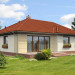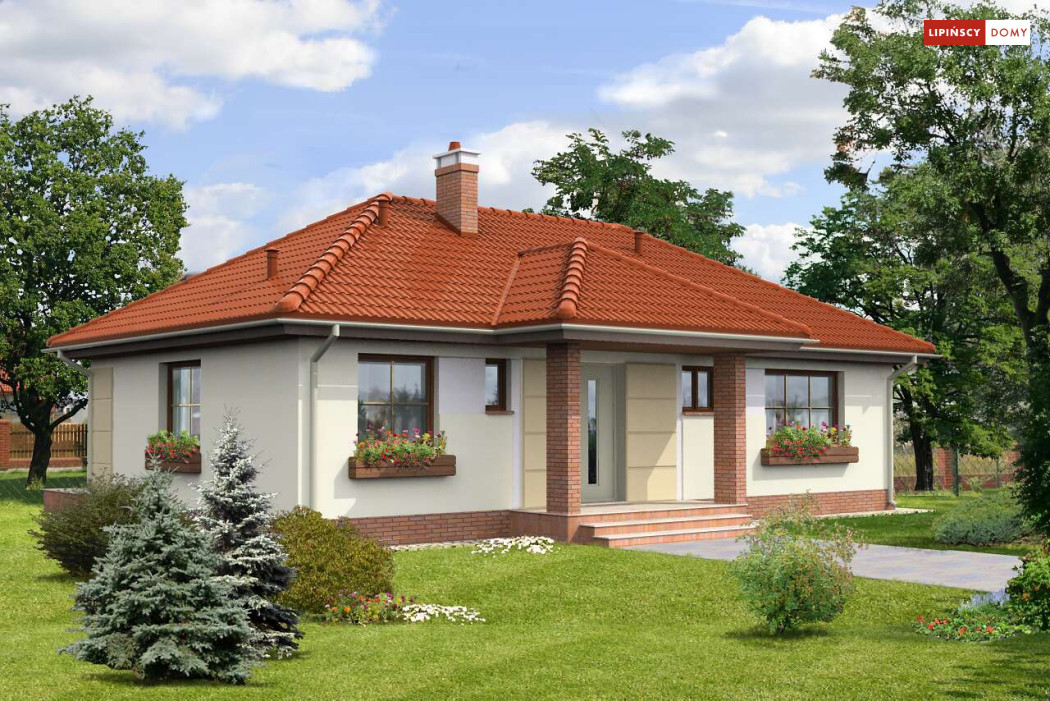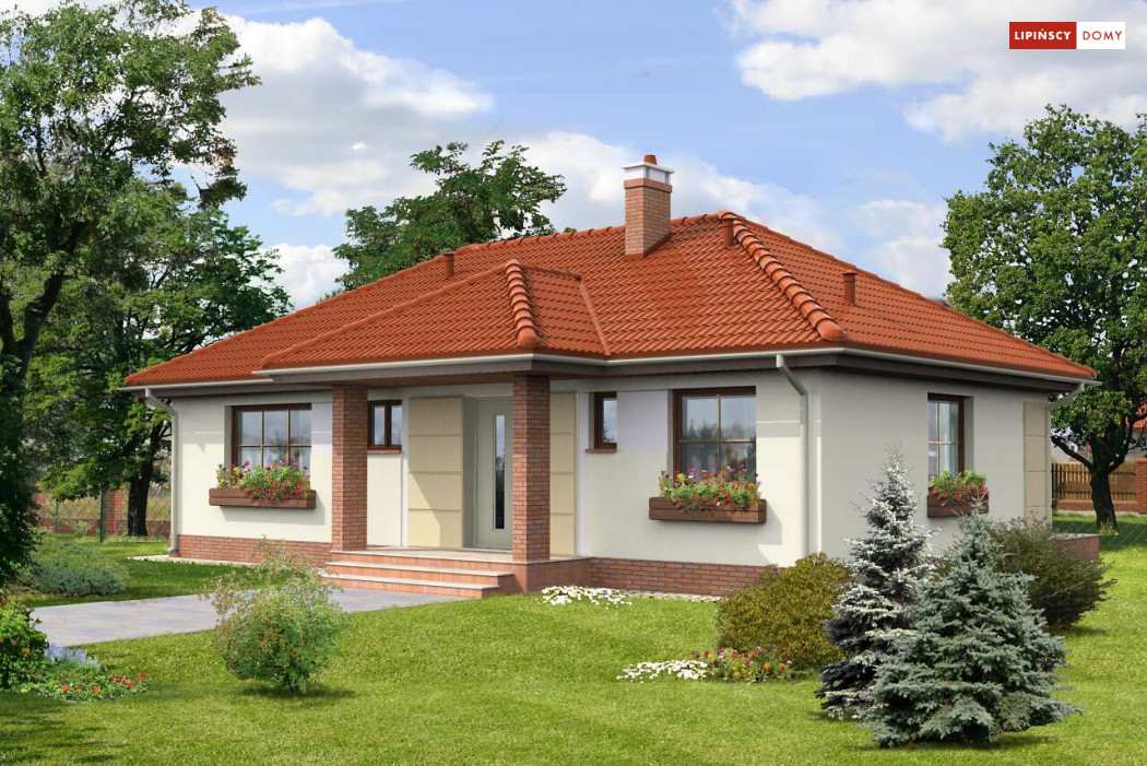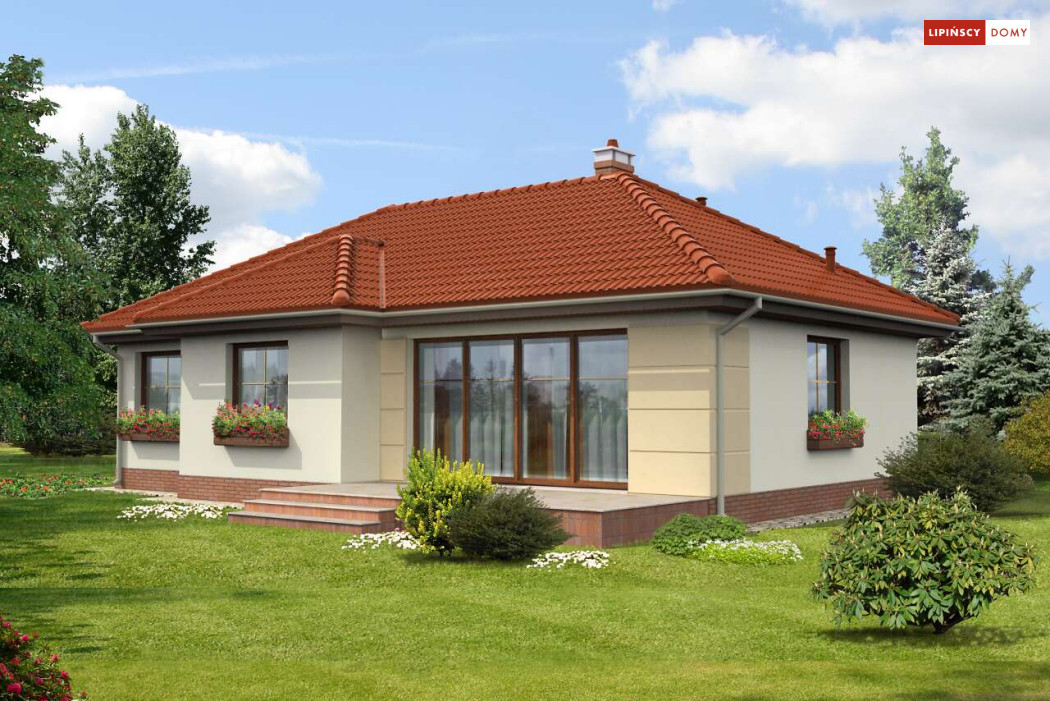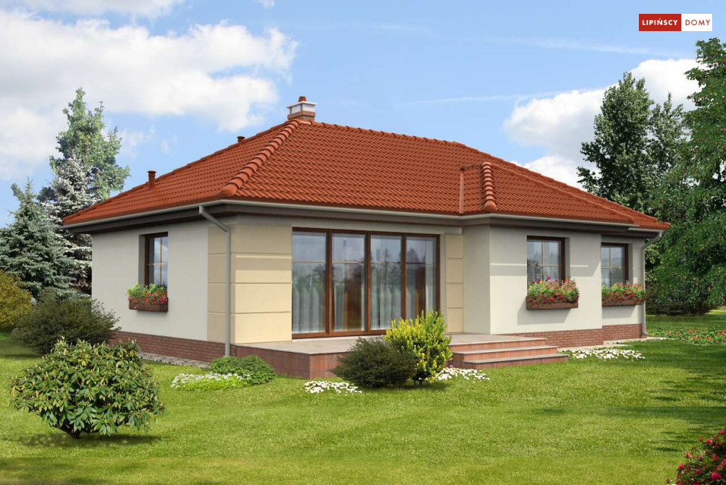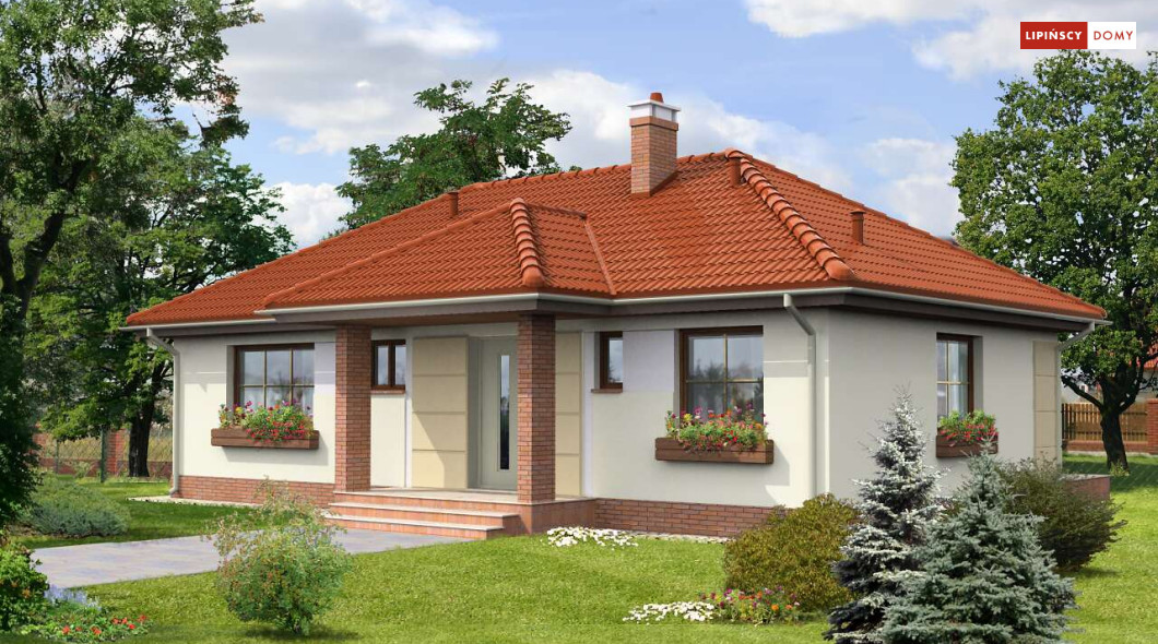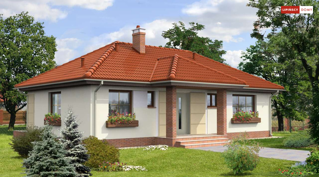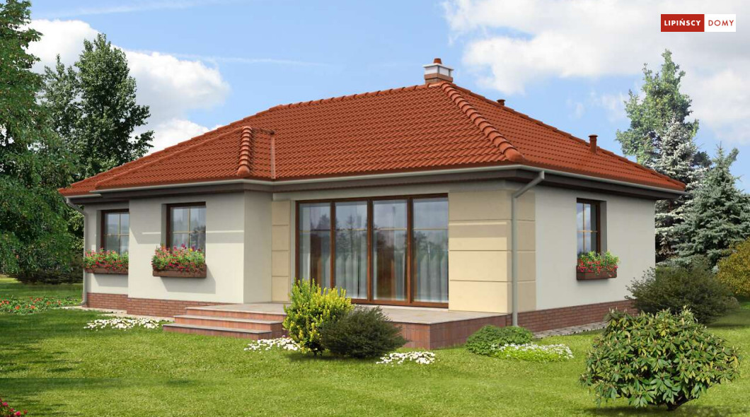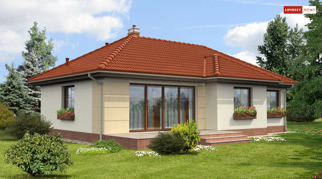 Ciekawa propozycja funkcjonalnego, niewielkiego domu parterowego. Zwarta, prosta bryła przekryta została czterospadowym dachem. Jasna elewacja, z delikatnymi akcentami piaskowego brązu nadaje bryle lekkości. Sercem domu jest salon z dużymi, przeszklonymi drzwiami wyjściowymi na taras i otwarta na niego kuchnia. To głównie w tym obszarze koncentruje się życie rodzinne. Przy kuchni przewidziano pomieszczenie gospodarcze z kotłem grzewczym. Do dyspozycji mieszkańców są także trzy sypialnie i wygodna łazienka. Takie rozplanowanie przestrzeni, z wyraźnym podziałem na strefę dzienną i nocną, czyni ten dom bardzo wygodnym w użytkowaniu.