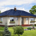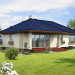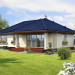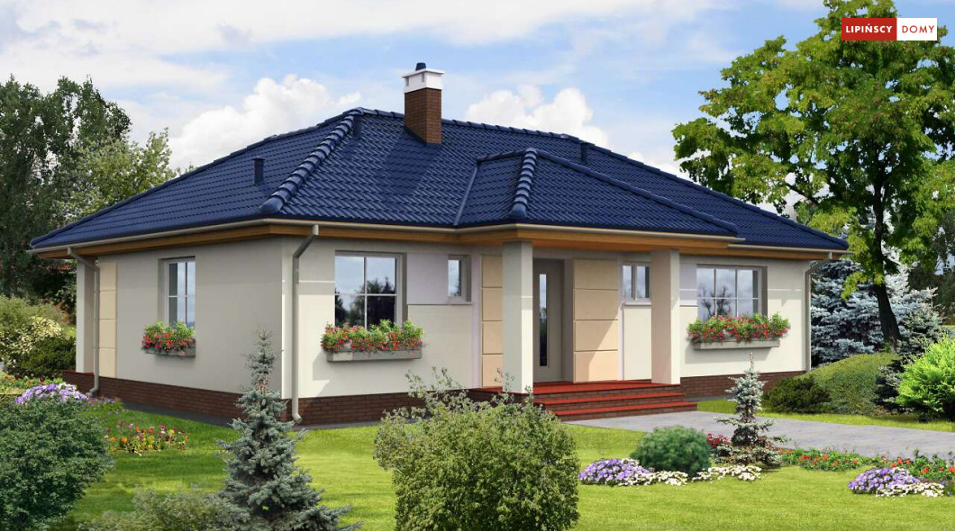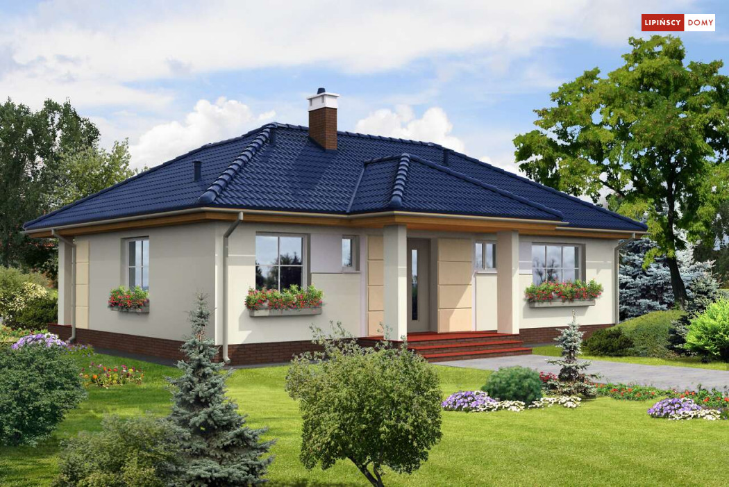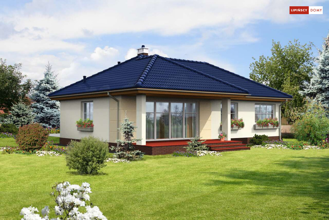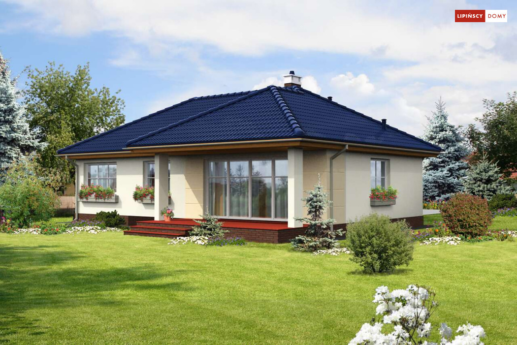 Nieduży dom parterowy, o prostej bryle, którego ozdobą jest duży, zadaszony taras od strony ogrodu. Wnętrze jest rozplanowane bardzo funkcjonalnie, z wyraźnym rozróżnieniem strefy dziennej i prywatnej. Z salonu, połączonego z kuchnią, można wyjść przez piękne, przeszklone drzwi na zewnątrz. Dzięki dużym oknom dom jest dobrze doświetlony. Przy kuchni zaplanowano pomieszczenie gospodarcze z kotłem grzewczym. Trzy sypialnie i łazienka z wanną i prysznicem zapewniają mieszkańcom wygodę.