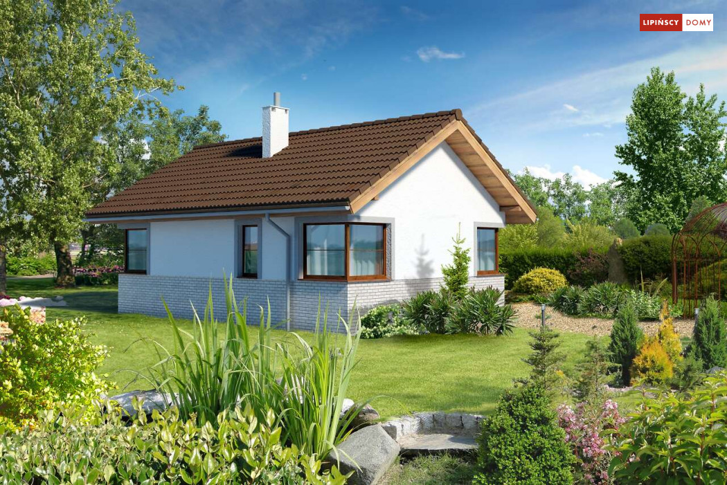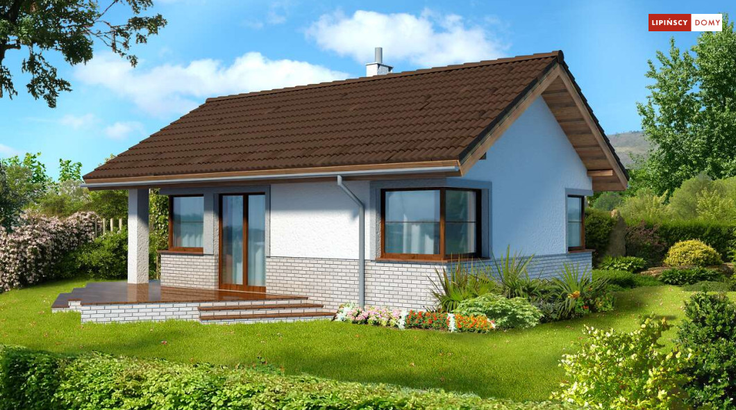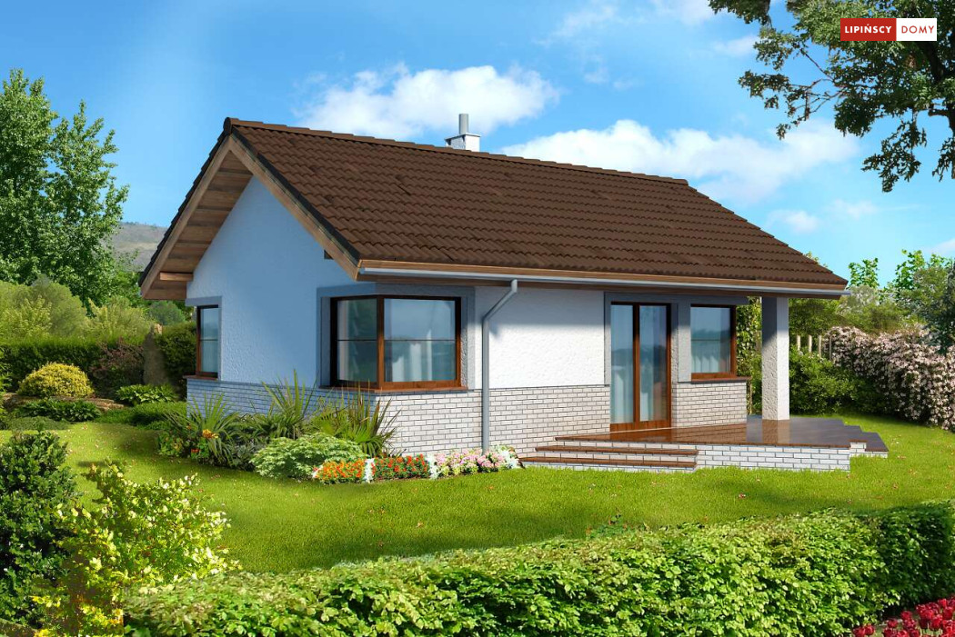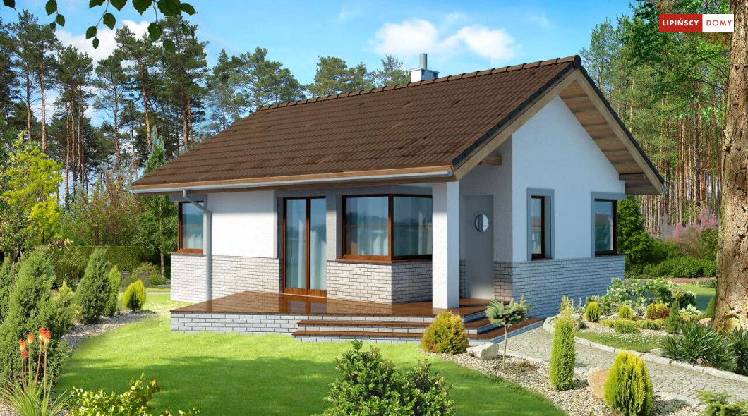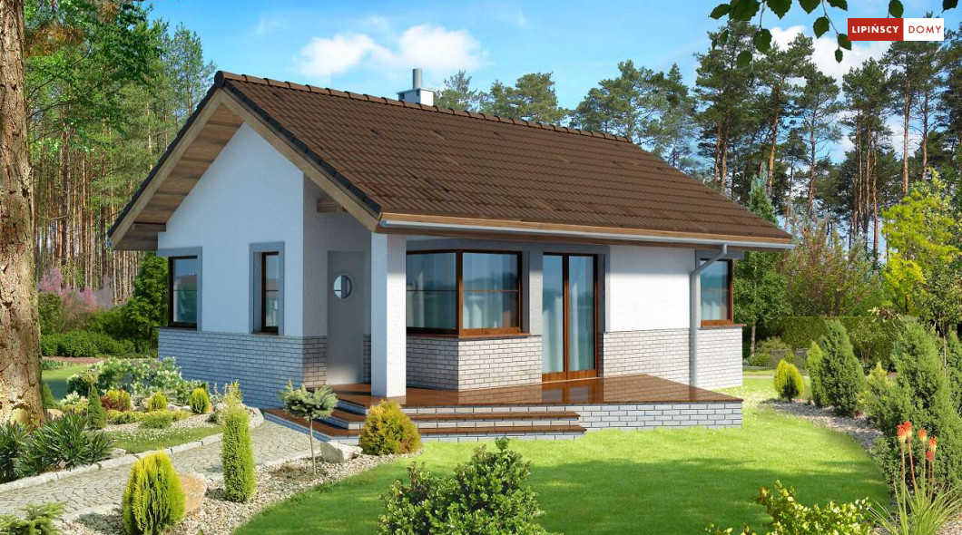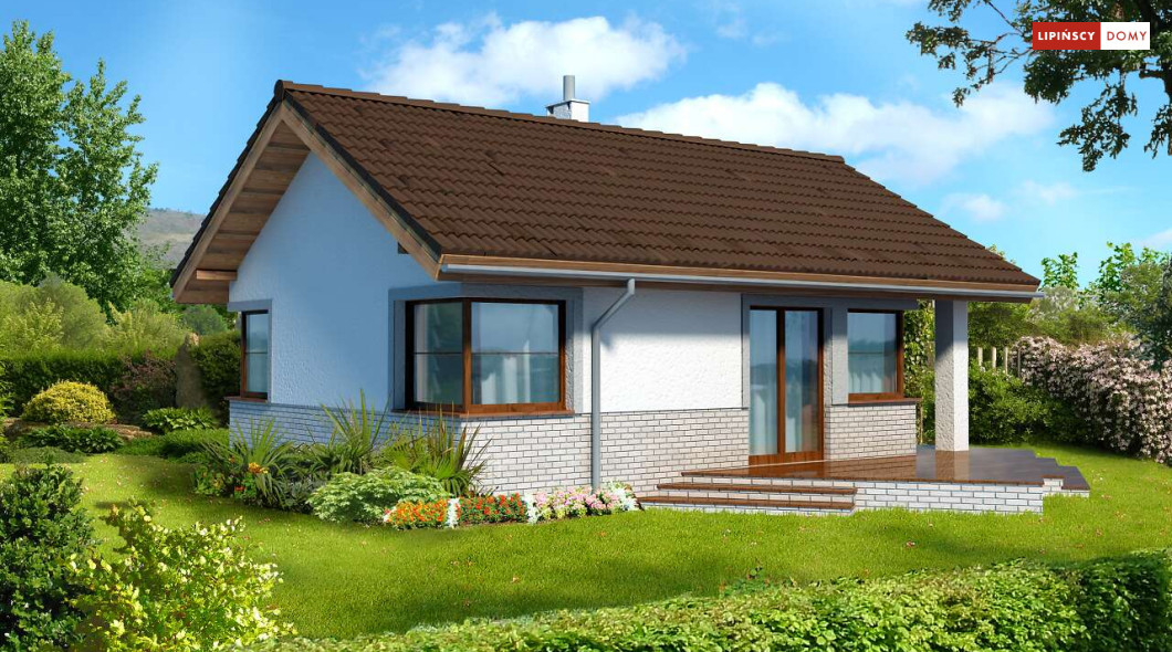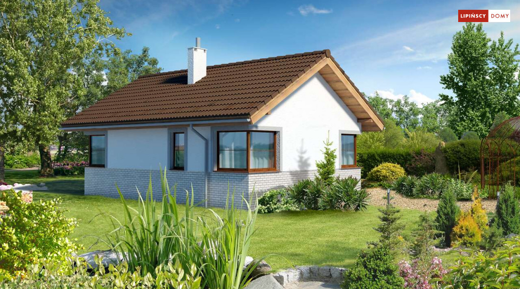 Malutki, uroczy domek parterowy, doskonały dla seniorów. Na niewielkiej, lecz doskonale rozplanowanej przestrzeni znajduje się salon z wyjściem na taras, kuchnia ze spiżarką, dwie sypialnie i łazienka z wc. Uwagę zwraca lekka bryła budynku, z ciekawie zaprojektowanym wejściem i narożnymi oknami, którą przekrywa prosty, dwuspadowy dach. Dzięki prostej konstrukcji dom jest niedrogi w wykonaniu.