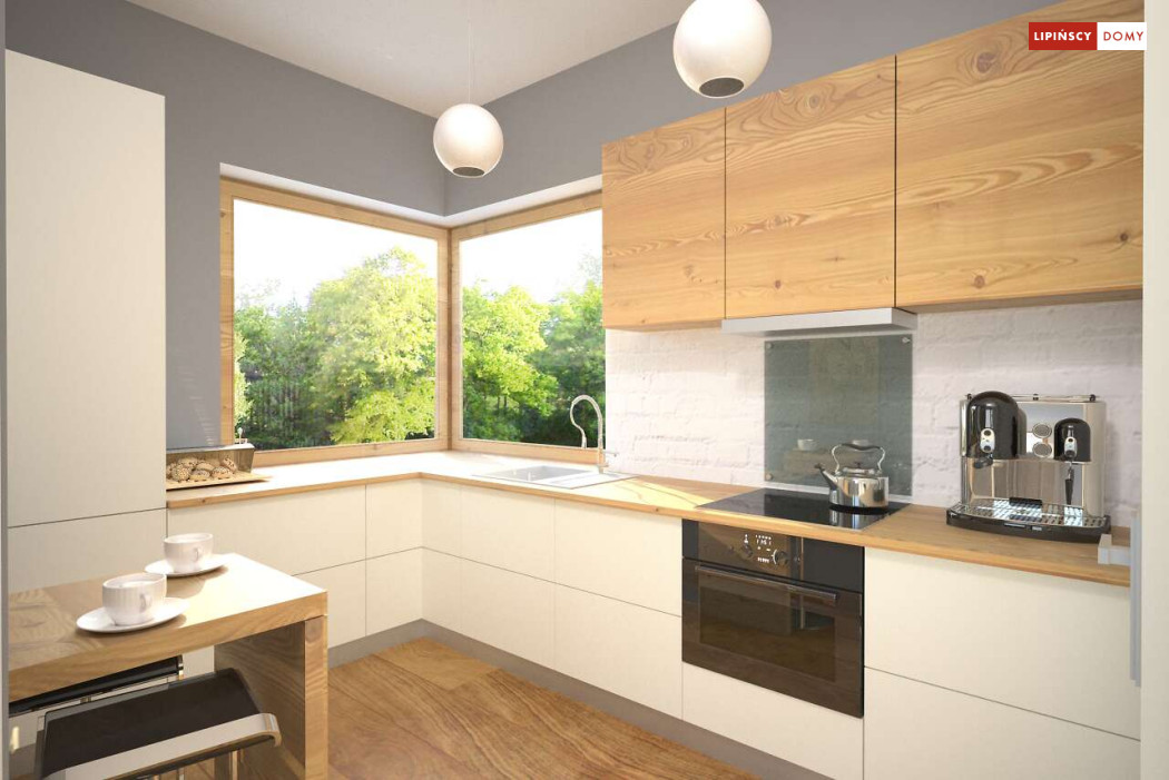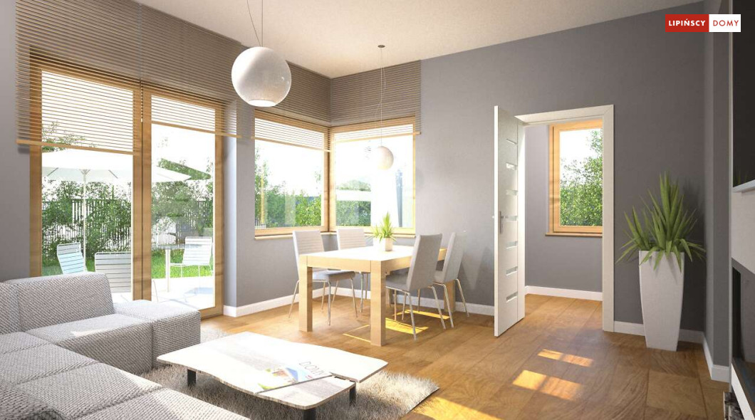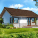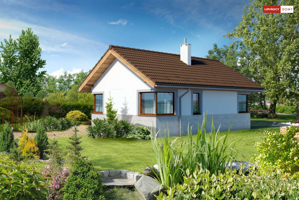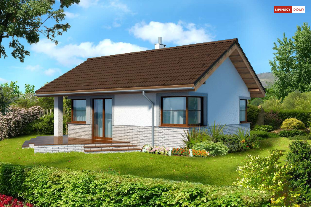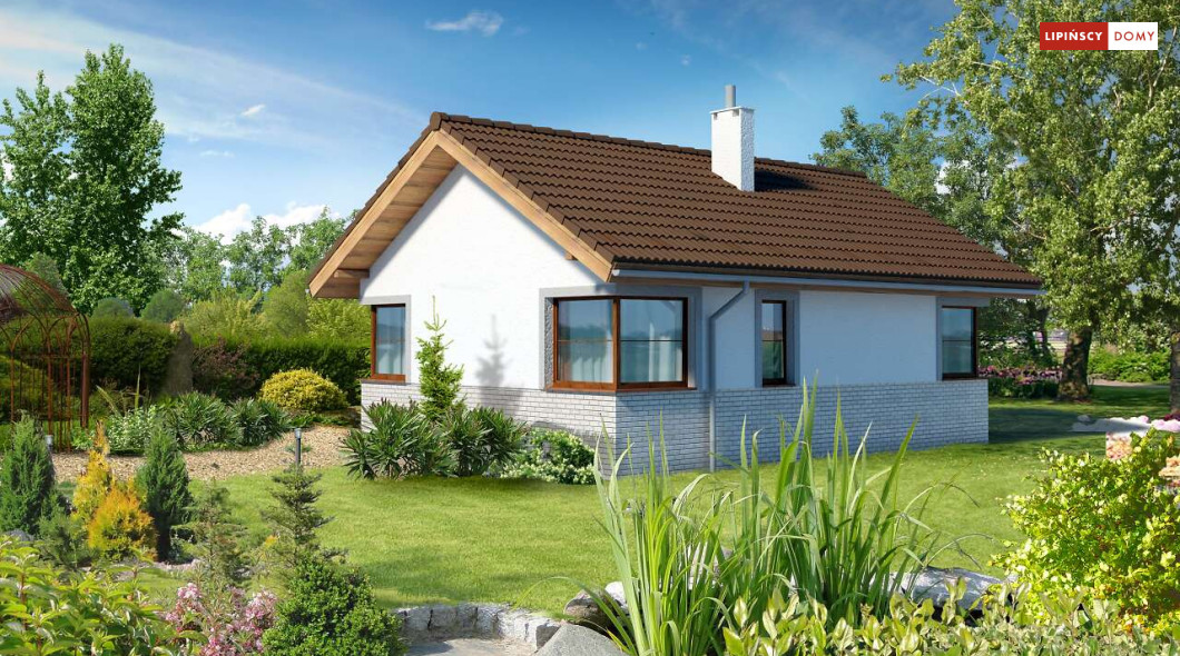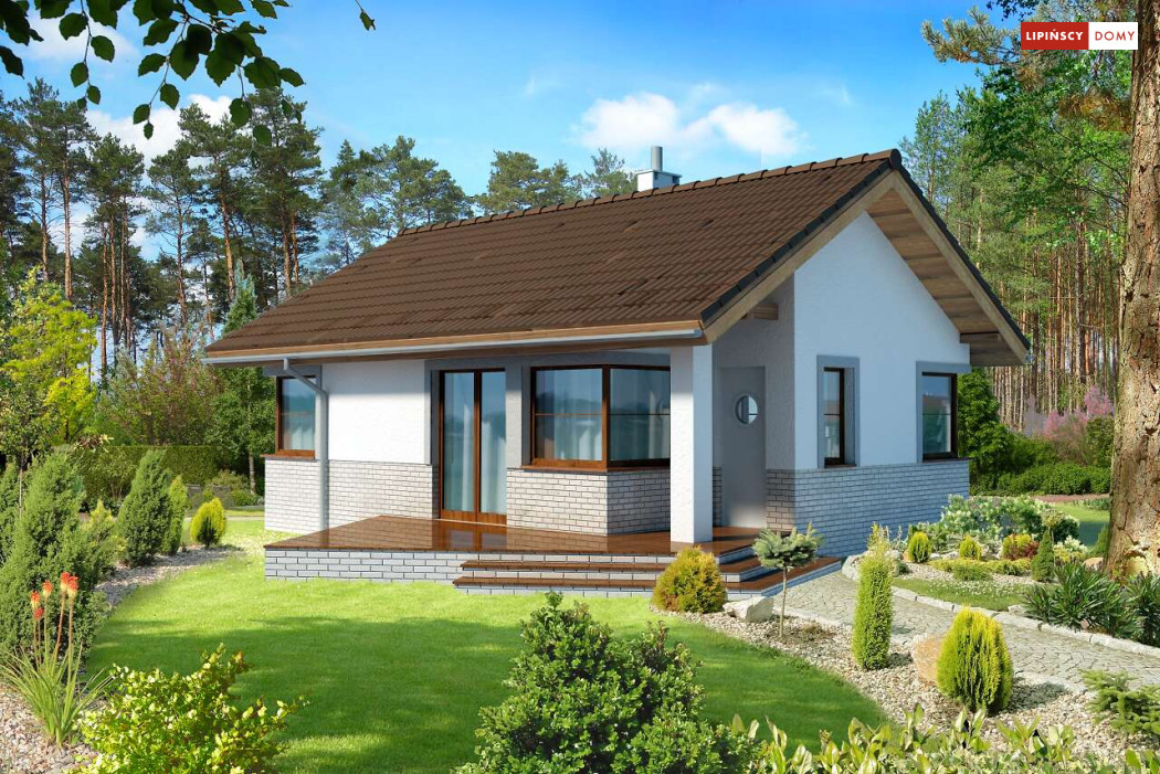 Malutki, uroczy domek parterowy, doskonały dla seniorów. Na niewielkiej, lecz doskonale rozplanowanej przestrzeni znajduje się salon z wyjściem na taras, kuchnia ze spiżarką, dwie sypialnie i łazienka z wc. Uwagę zwraca lekka bryła budynku, z ciekawie zaprojektowanym wejściem i narożnymi oknami, którą przekrywa prosty, dwuspadowy dach. Dzięki prostej konstrukcji dom jest niedrogi w wykonaniu.
