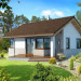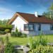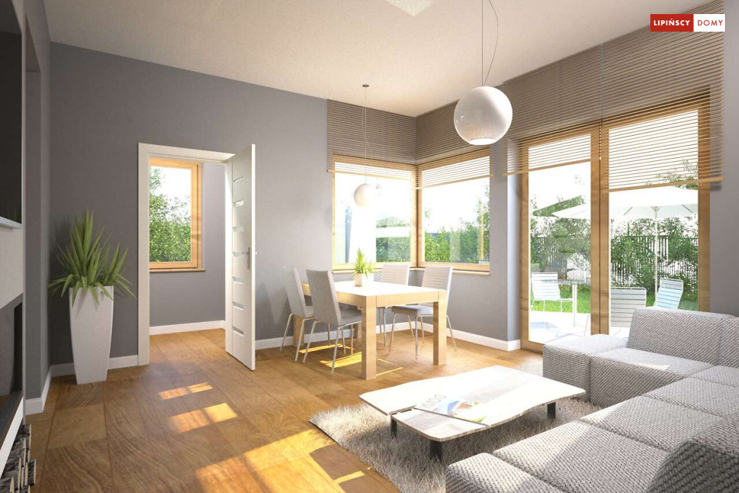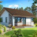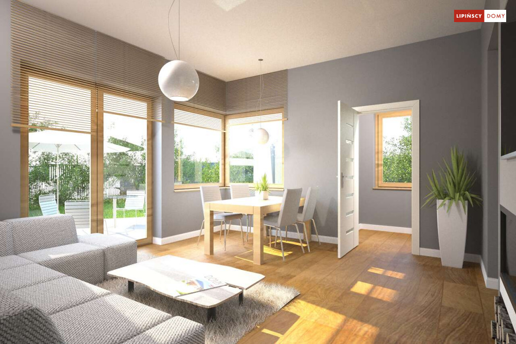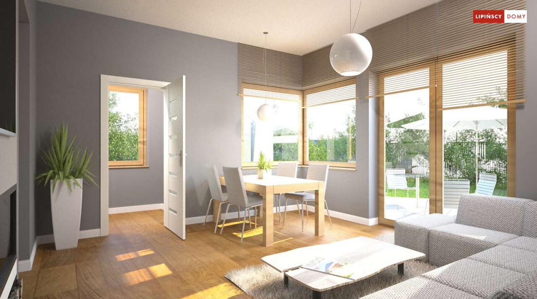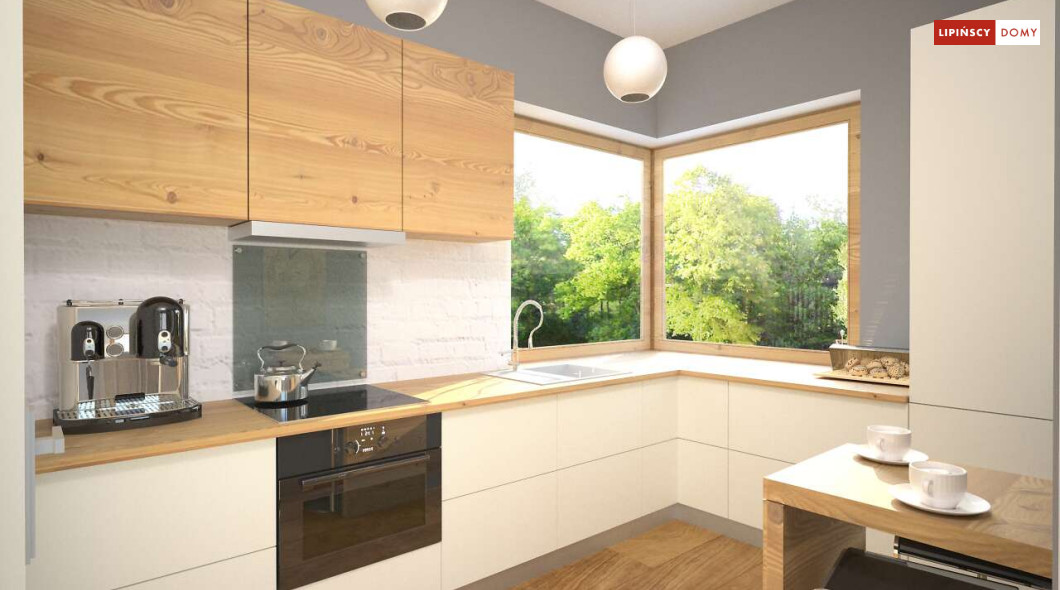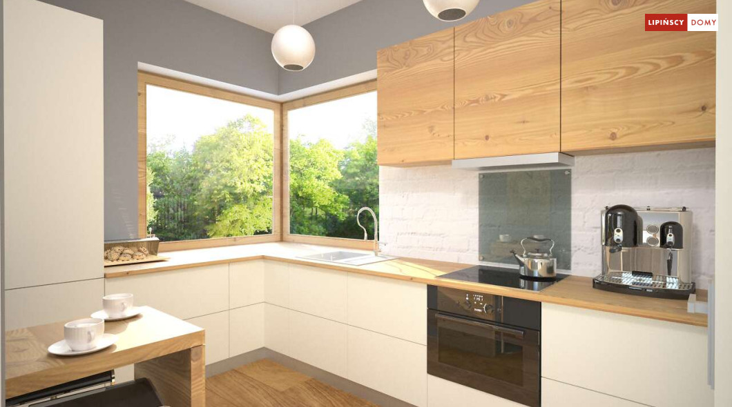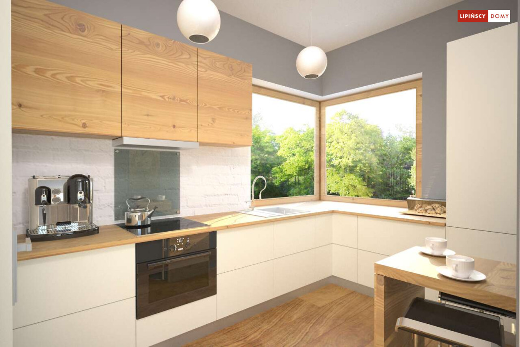 Malutki, uroczy domek parterowy, doskonały dla seniorów. Na niewielkiej, lecz doskonale rozplanowanej przestrzeni znajduje się salon z wyjściem na taras, kuchnia ze spiżarką, dwie sypialnie i łazienka z wc. Uwagę zwraca lekka bryła budynku, z ciekawie zaprojektowanym wejściem i narożnymi oknami, którą przekrywa prosty, dwuspadowy dach. Dzięki prostej konstrukcji dom jest niedrogi w wykonaniu.