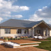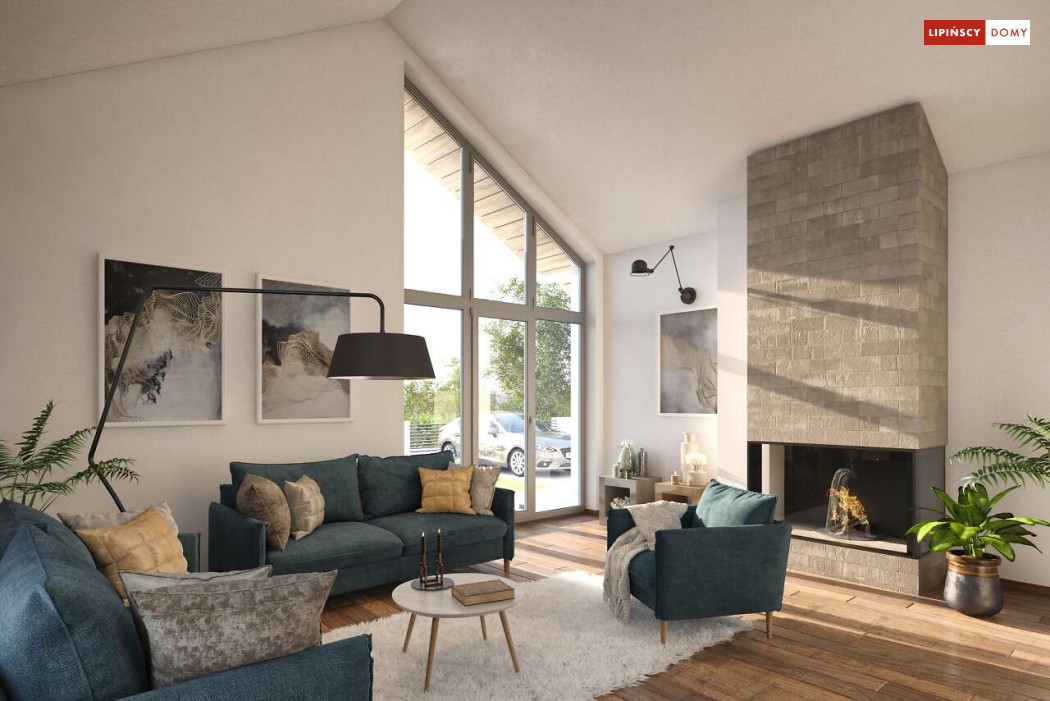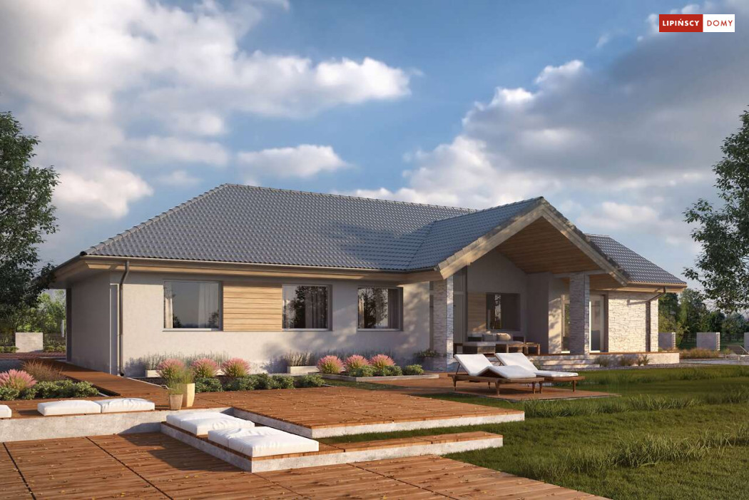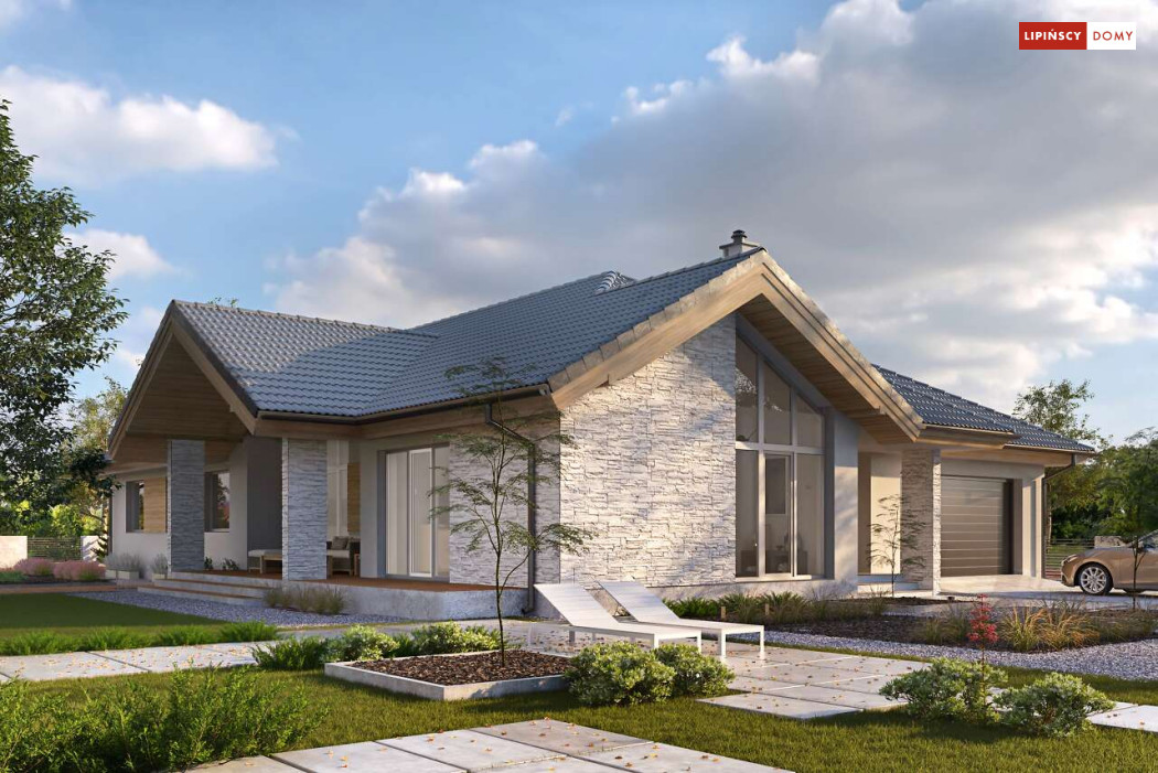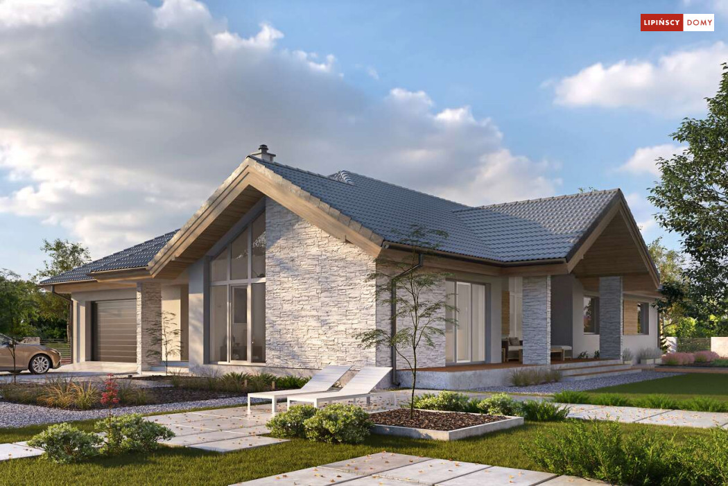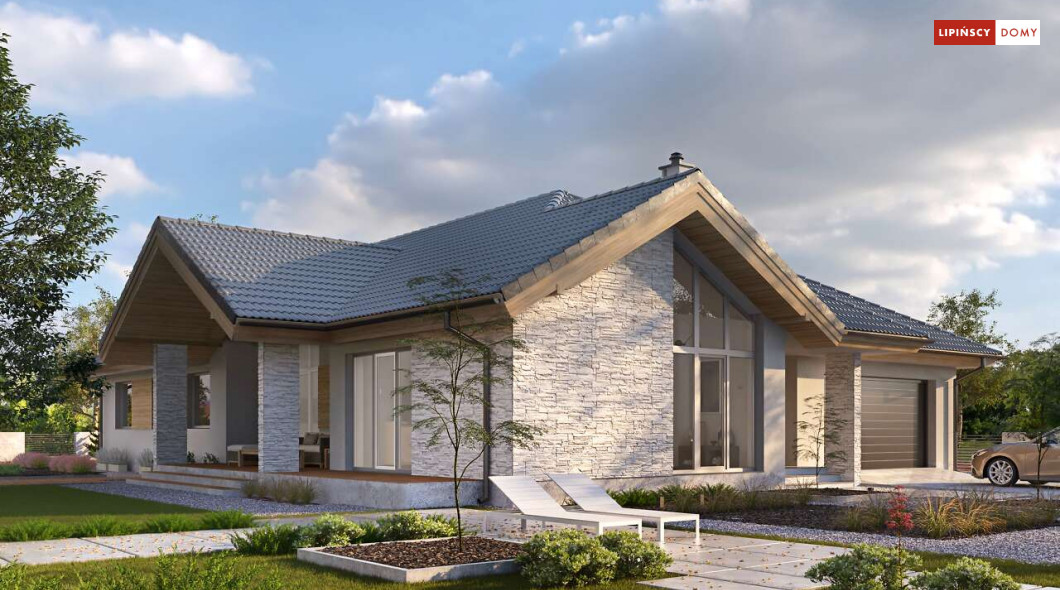 Wygodny, przestronny dom parterowy, zwracający uwagę głównie ciekawą bryłą i dużymi przeszkleniami, dzięki którym wnętrze jest pełne światła. Mieszkańcy mają do dyspozycji obszerny salon, ciekawie zaaranżowaną kuchnię z jadalnią, gabinet, trzy sypialnie, w tym jedną z łazienką, spiżarnię, wc i wspólną łazienkę. Za dwustanowiskowym garażem, wkomponowanym w bryłę domu, znajduje się pomieszczenie z kotłownią, która ma niezależne wyjście na zewnątrz. Dom, dzięki usytuowaniu salonu od strony wejściowej, doskonale nadaje się na działki z wejściem od południa.