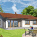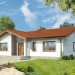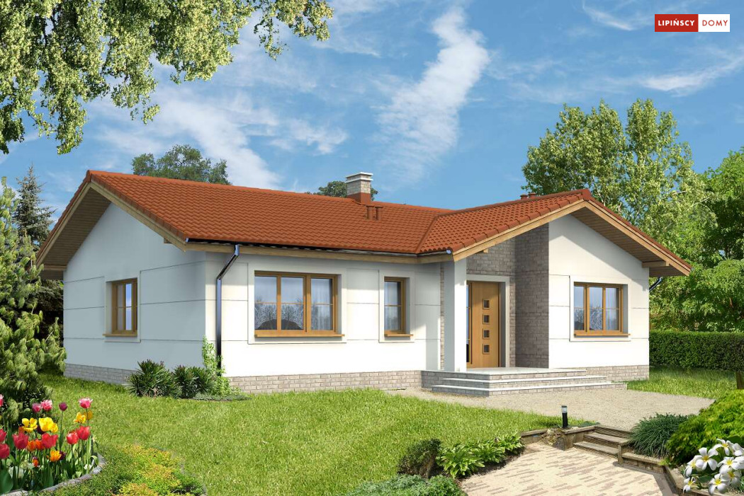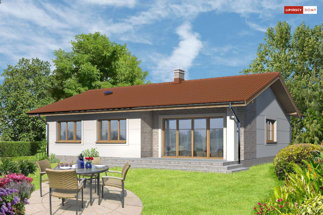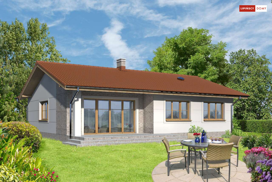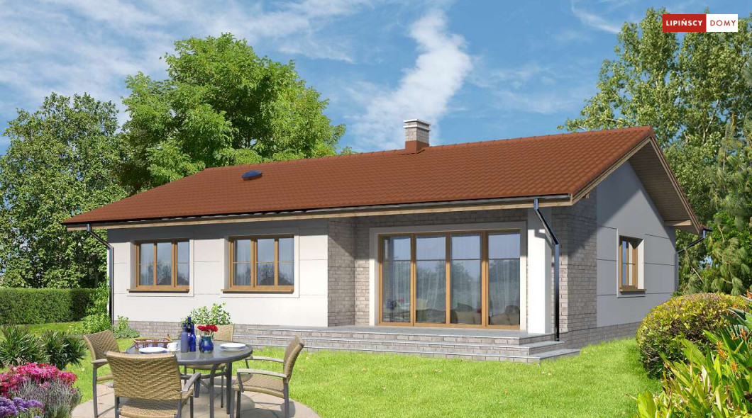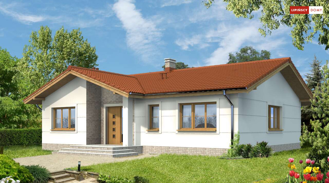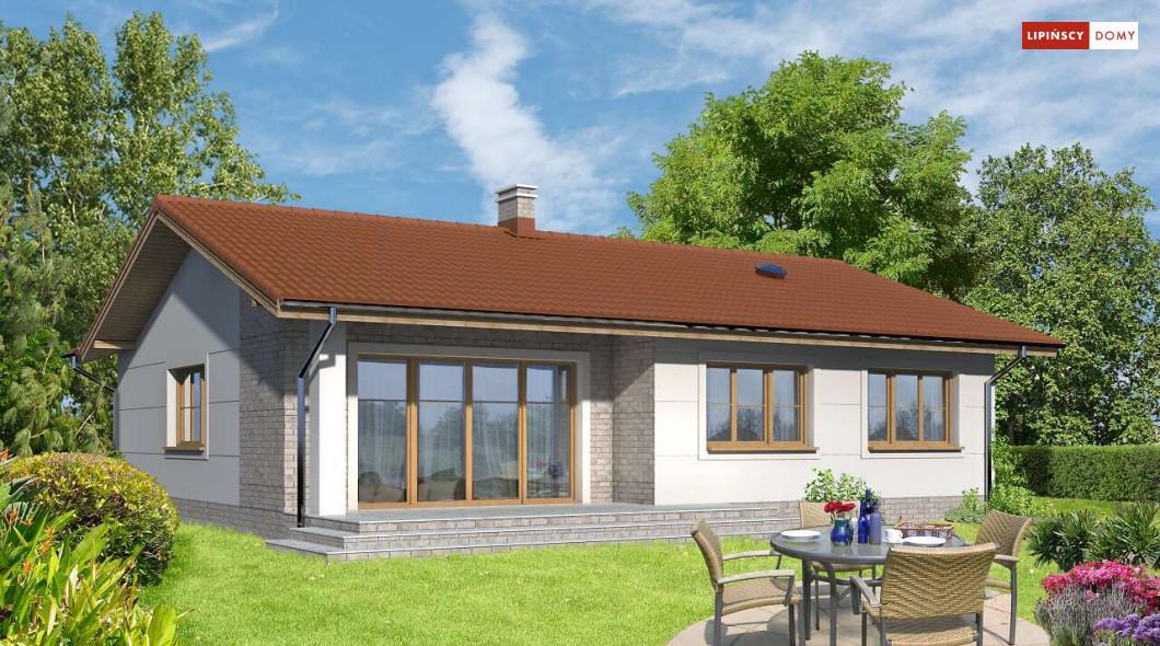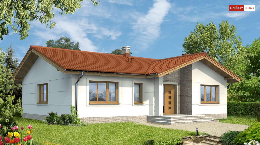 Niewielki dom parterowy, w którym z powodzeniem zmieścił się duży salon z kominkiem i miejscem na rodzinny stół, z którego jest wyjście na częściowo zadaszony taras, otwarta na salon kuchnia, cztery sypialnie, łazienka, wc i pomieszczenie gospodarcze. Takie rozplanowanie pomieszczeń wyraźnie dzieli dom na dwie strefy – ogólnodostępną - dzienną i prywatną - nocną. Uwagę zwraca prosta bryła domu, z ciekawie zaplanowanym wejściem i dużymi przeszkleniami od strony ogrodowej. Dzięki prostej konstrukcji dom jest niedrogi w wykonaniu.
