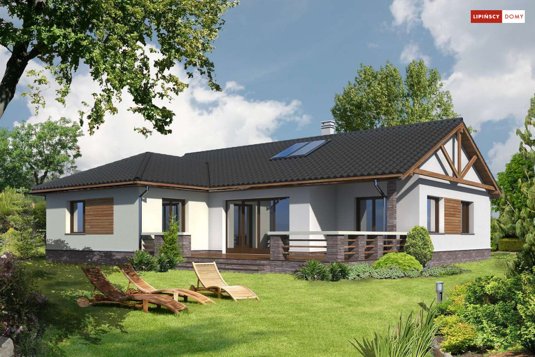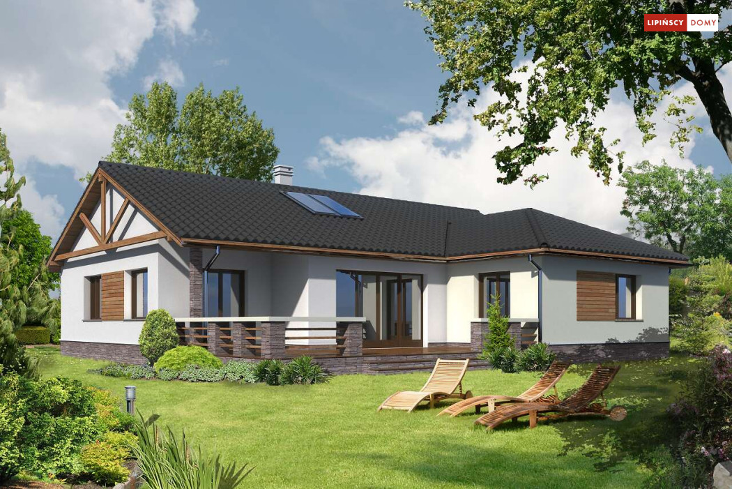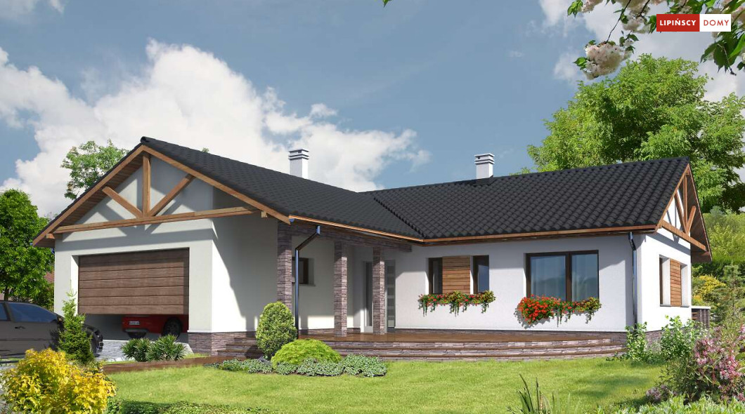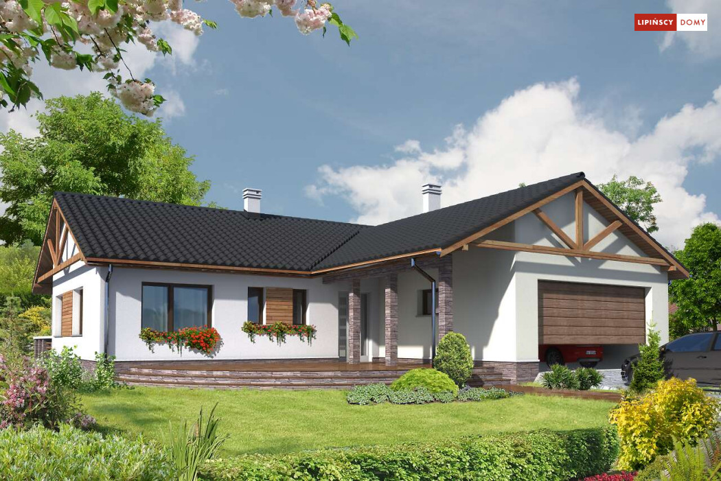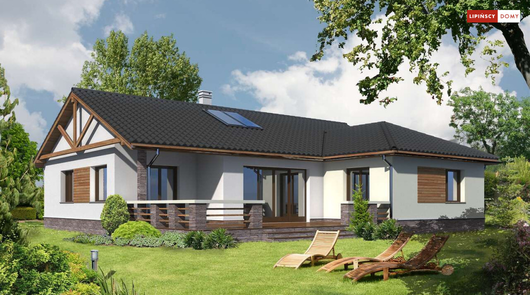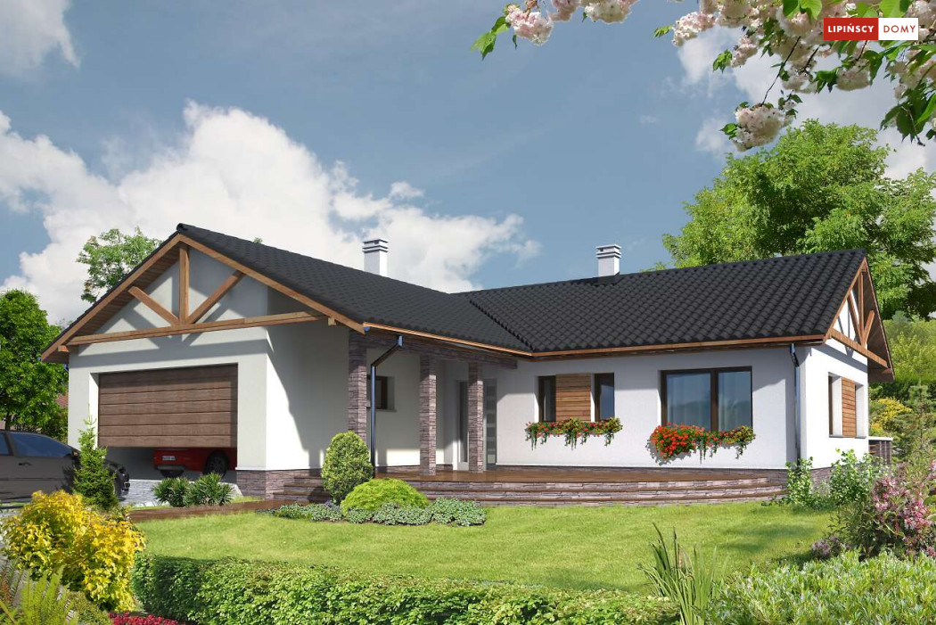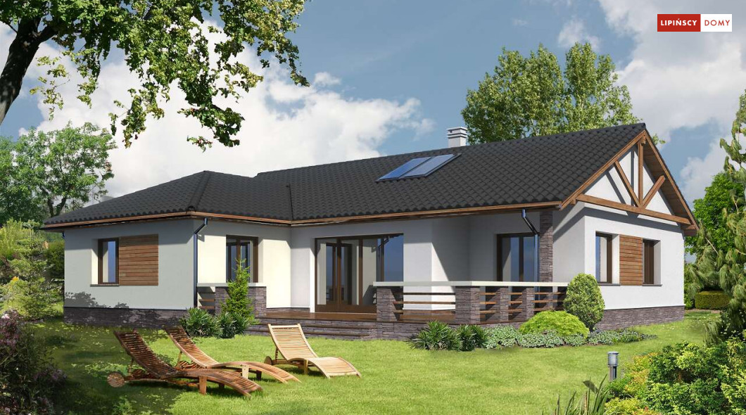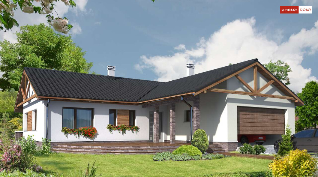 Przestronny dom parterowy, z ciekawie zaaranżowanym, dużym salonem. Bardzo funkcjonalnie rozplanowane wnętrze kryje cztery sypialnie, w tym jedną z własną łazienką, wygodną kuchnię, pomieszczenie gospodarcze, wc i ogólnodostępną łazienkę. Ozdobą domu jest duży, częściowo zadaszony taras, dzięki czemu mieszkańcy mają ogród niemal na wyciągnięcie ręki. W bryłę budynku wkomponowano garaż na dwa stanowiska, z którego jest przejście bezpośrednio do domu, a także kotłownię z wyjściem na zewnątrz.