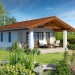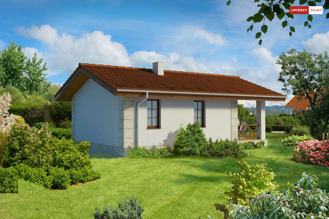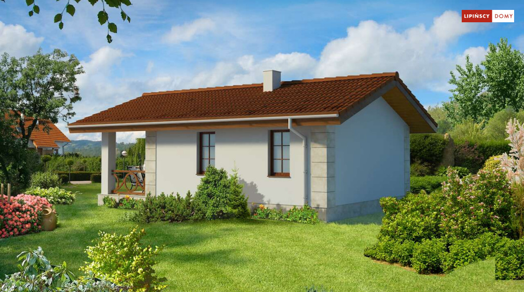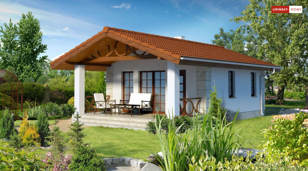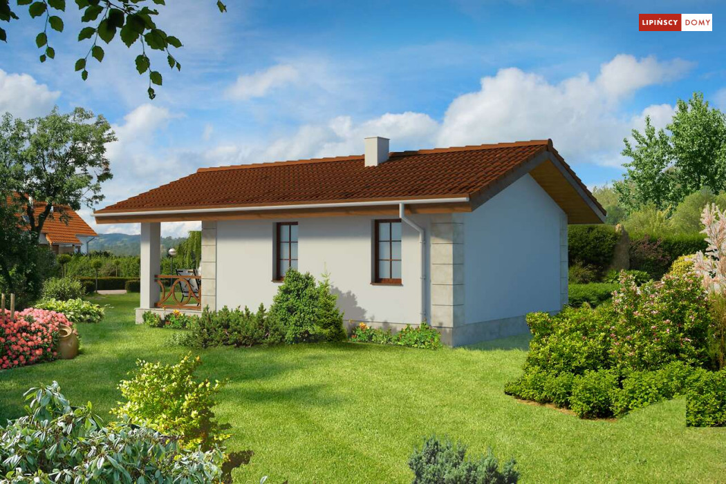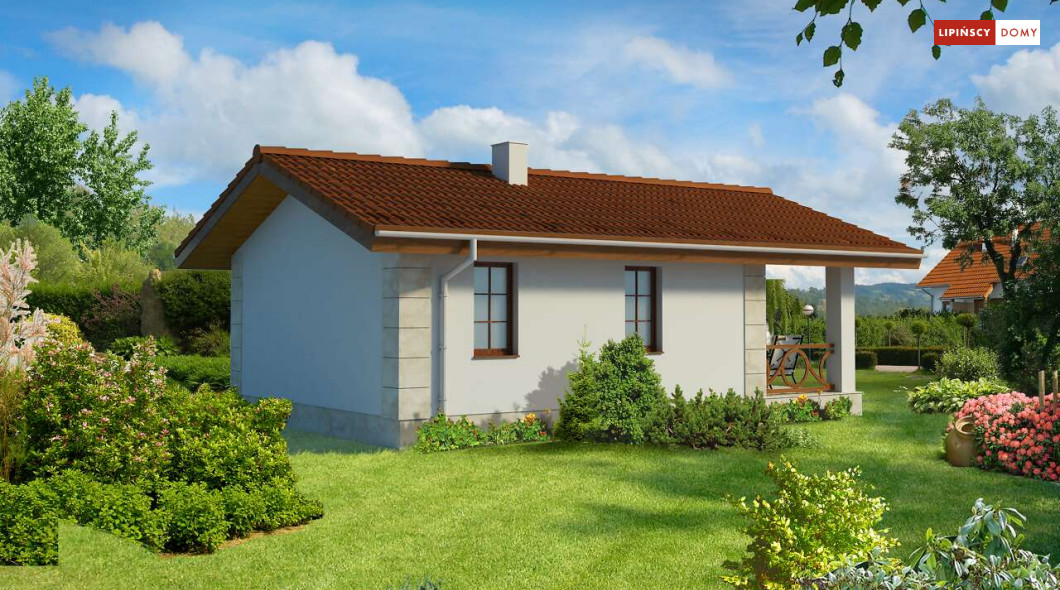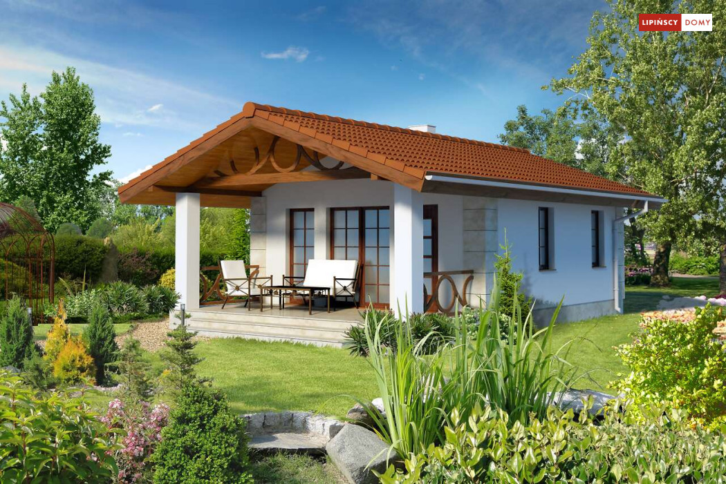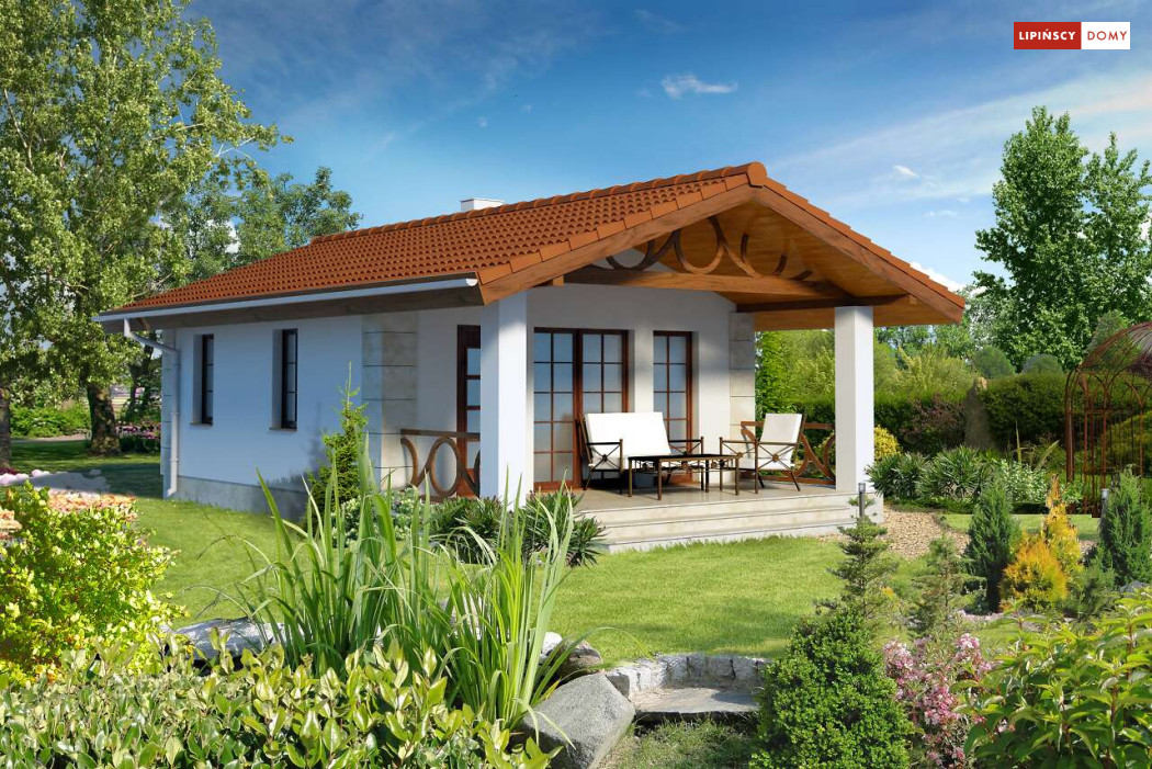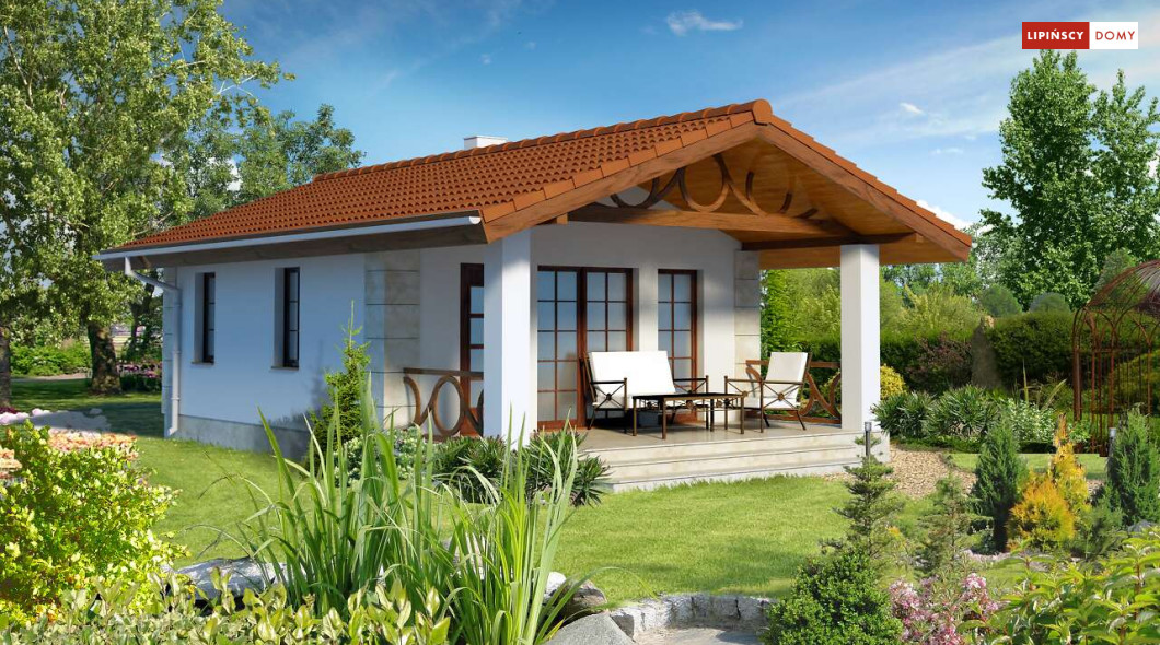Niewielki dom weekendowy, doskonały do rekreacyjnego spędzania czasu. Do dyspozycji użytkowników domku jest salon z kominkiem i aneksem kuchennym, łazienka i sypialnia. Zadaszone wejście, stanowiące także taras to miejsce, gdzie zmieści się duży stół. Duże przeszklenia od strony frontowej doskonale doświetlają wnętrze. Prosta architektura i konstrukcja powodują, że jest to dom niedrogi w wykonaniu.