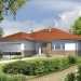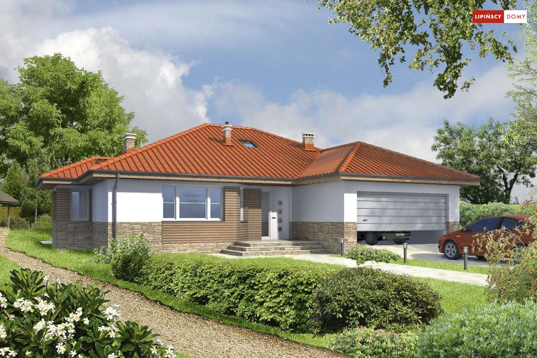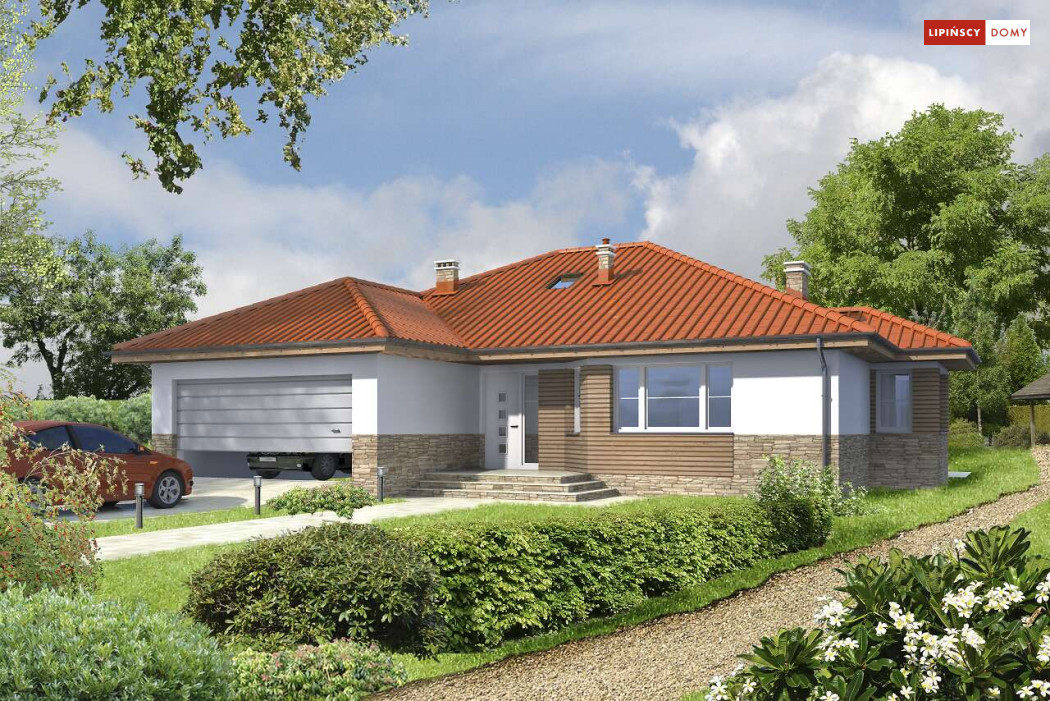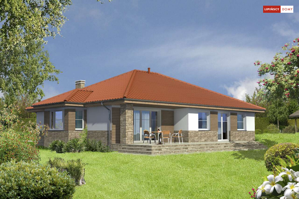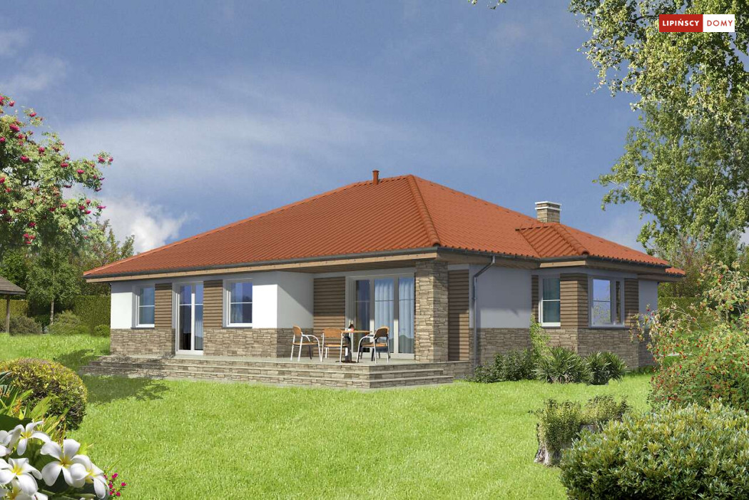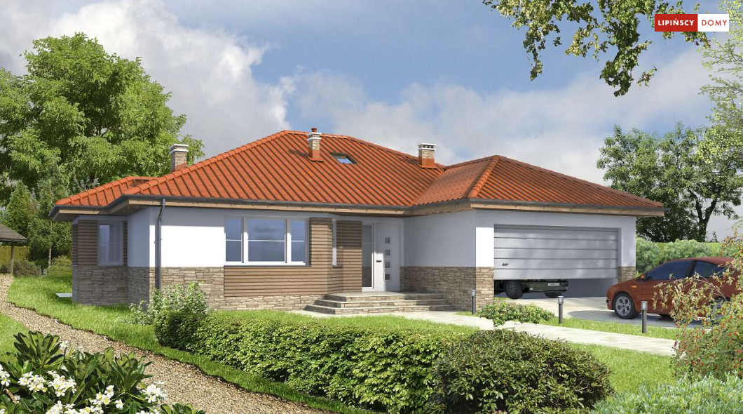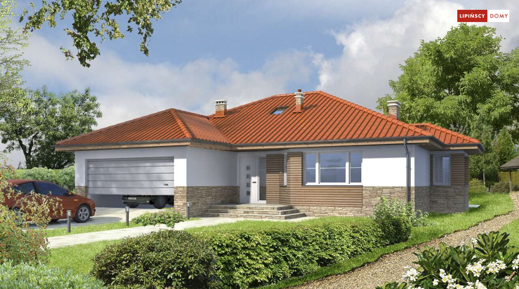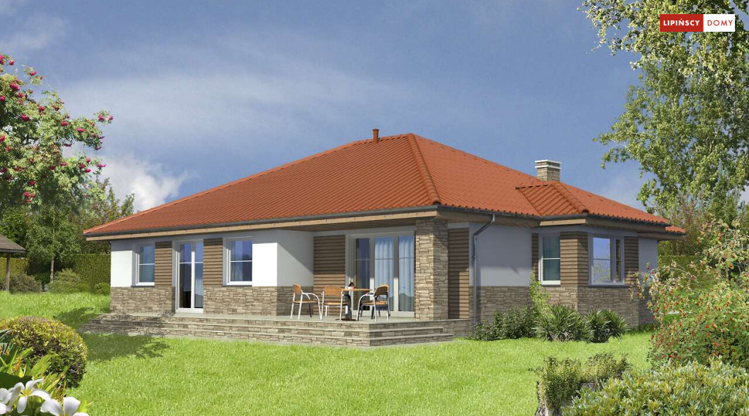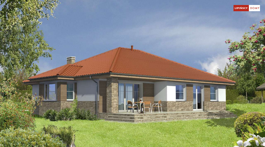 Parterowy dom z wpisanym w bryłę garażem. Funkcjonalny układ wnętrza, z wyraźnie zaznaczonymi strefami dzienną i nocną gwarantuje wygodę mieszkańcom. Do strefy wspólnej należy ustawny salon z kominkiem i wykuszem, duża kuchnia z miejscem na stół, przy której zlokalizowano przydatną spiżarnię, i wc. Strefa nocna to trzy wygodne sypialnie i łazienka z wanną i prysznicem. Ozdobą domu jest duży, częściowo zadaszony taras, doskonały do odpoczynku na świeżym powietrzu i duże przeszklenia, dzięki którym do środka wpada dużo dziennego światła.