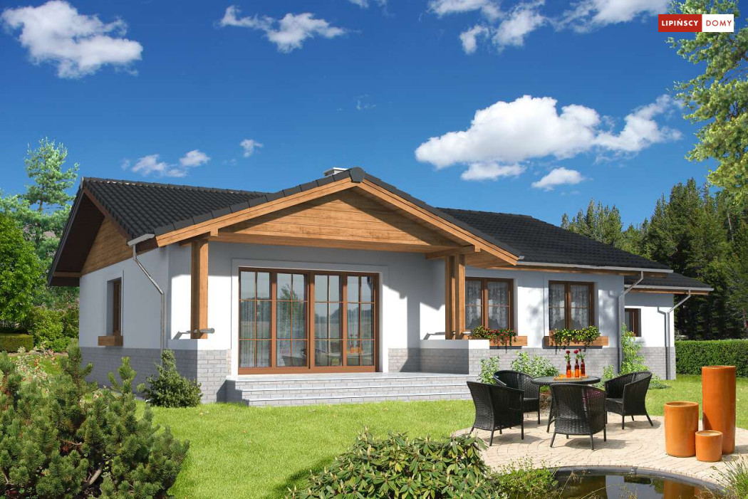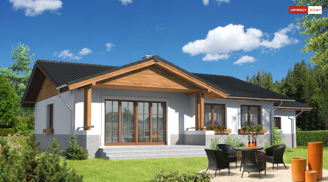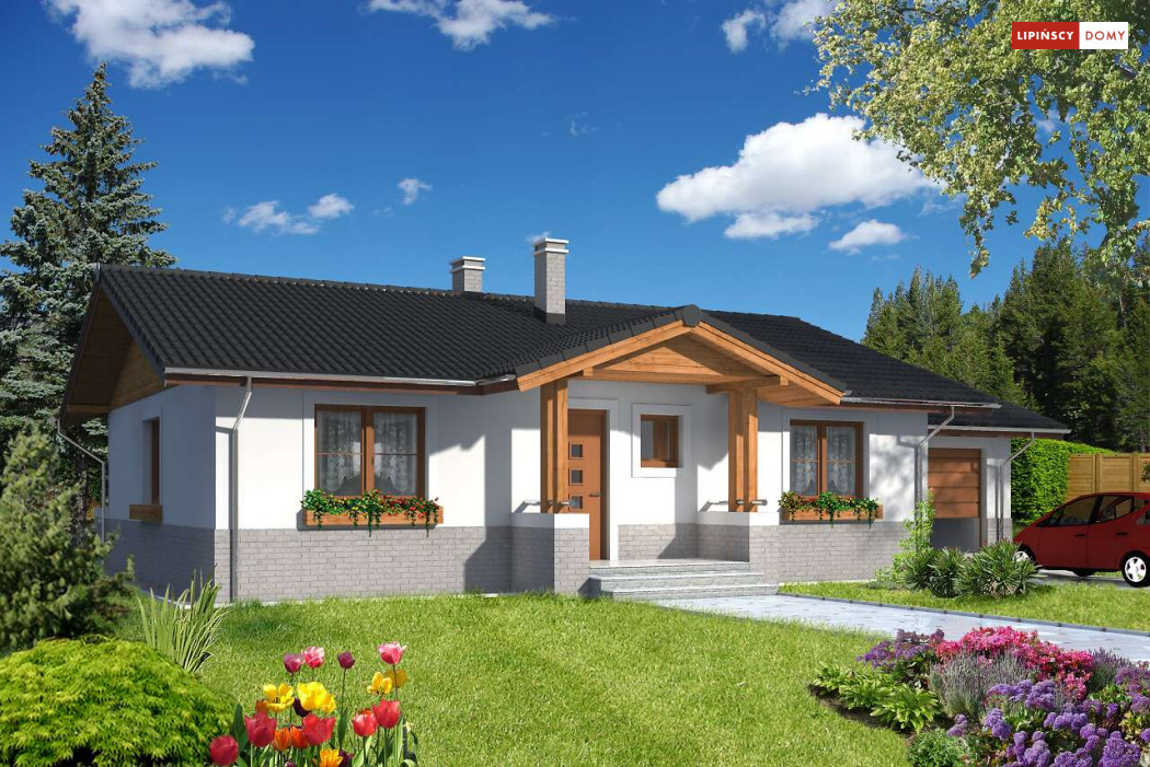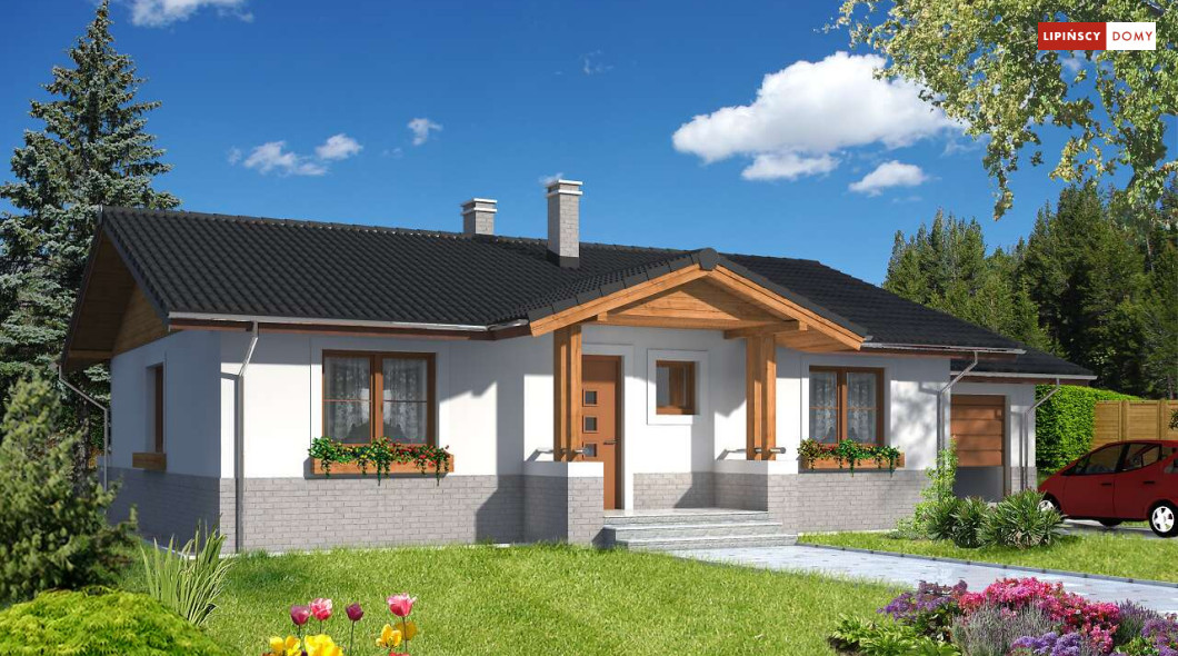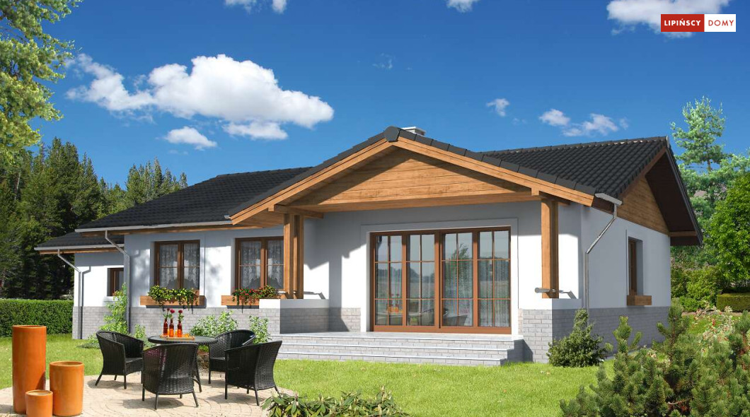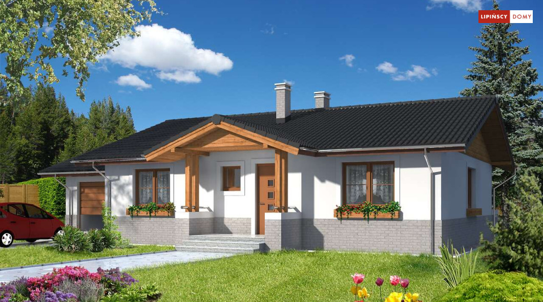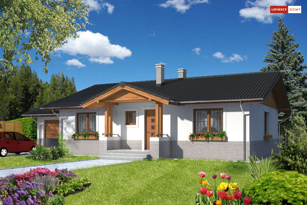 Prosty w budowie, wygodny dom parterowy z garażem. Mieszkańcy mają do dyspozycji funkcjonalną kuchnię, obszerny salon z miejscem na stół – pomieszczenia te stanowią część dzienną, wspólną. W części prywatnej wydzielono trzy sypialnię oraz wygodną łazienkę z wanną i prysznicem. Do dyspozycji domowników jest także dodatkowa toaleta. Dom ogrzewany jest gazem, kocił znajduje się w pomieszczeniu gospodarczym, przewidzianym także jako pralnia.