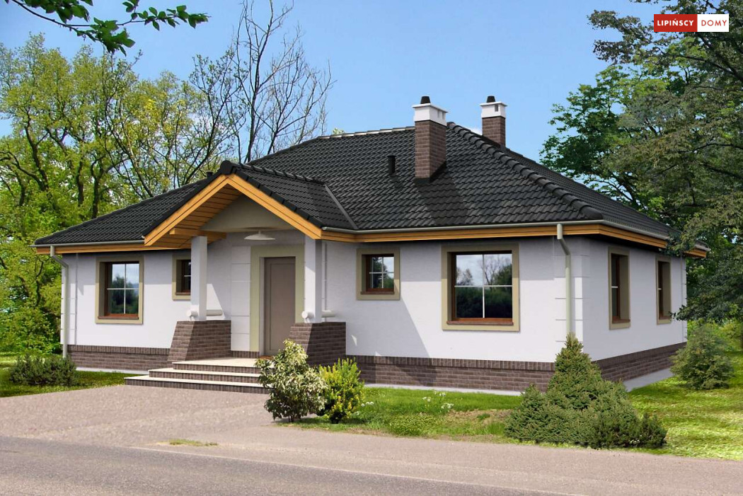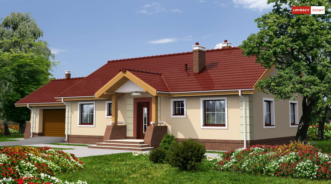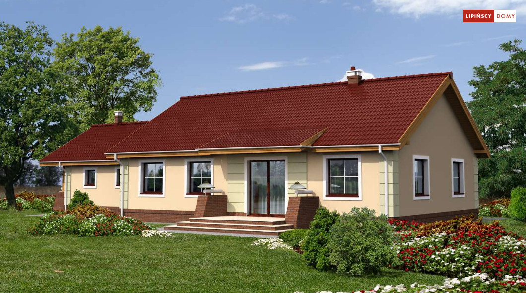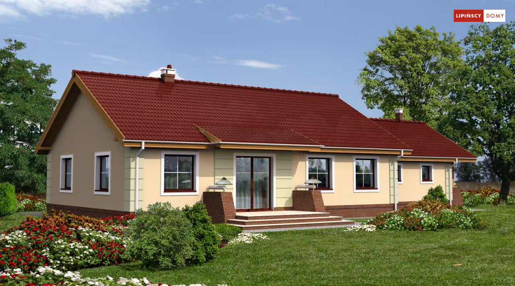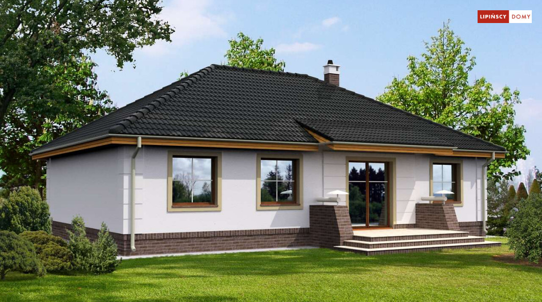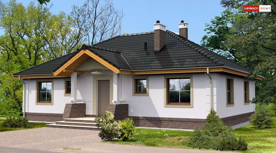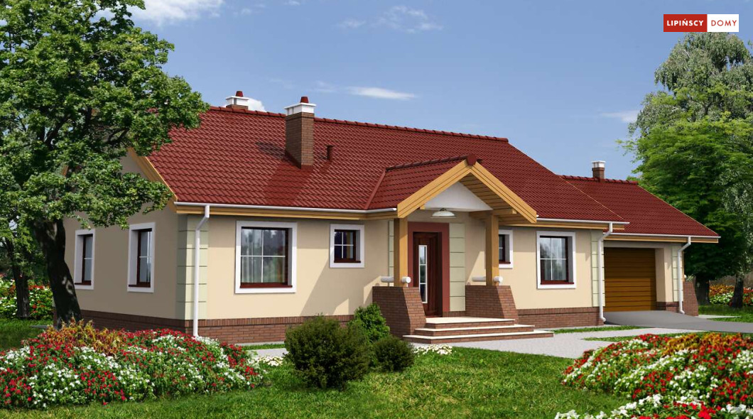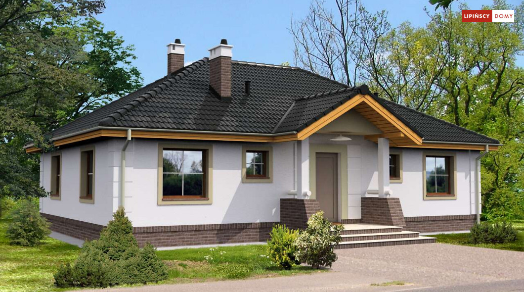 Wygodny dom parterowy, o prostej bryle i funkcjonalnym wnętrzu. Duża kuchnia, w której zmieści się rodzinny stół to spełnienie marzeń niejednej pani domu, a wygodnym salonem z kominkiem i wyjściem na taras zachwyceni będą wszyscy domownicy. Obok kuchni przewidziano podręczną spiżarnię, pomieszczenie gospodarcze z kotłem gazowym, i wc. W części nocnej domu są trzy sypialnie i wygodna, doświetlona łazienka. Do domu przynależy garaż na dwa auta, obok którego wygospodarowano zadaszone miejsce na np. drewno kominkowe. Prosta bryła domu została przekryta dwuspadowym dachem.