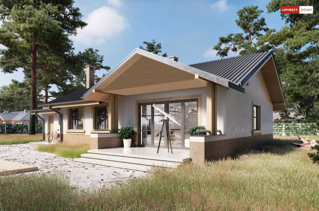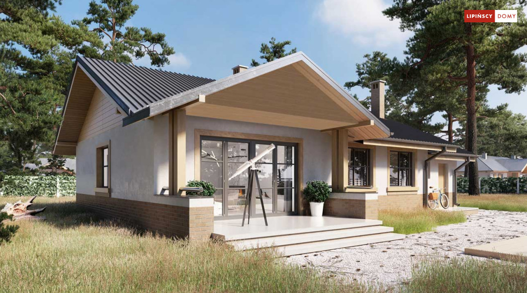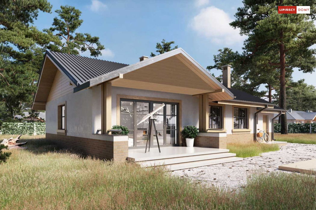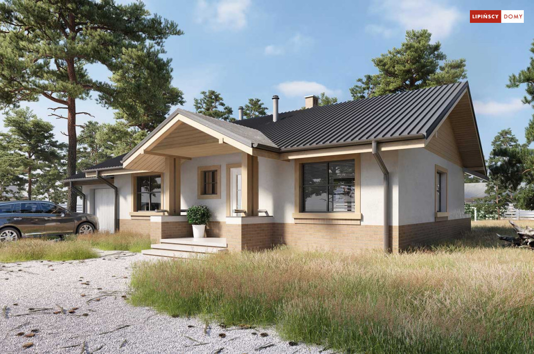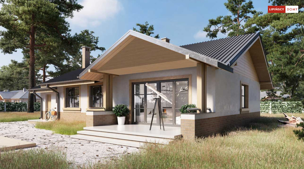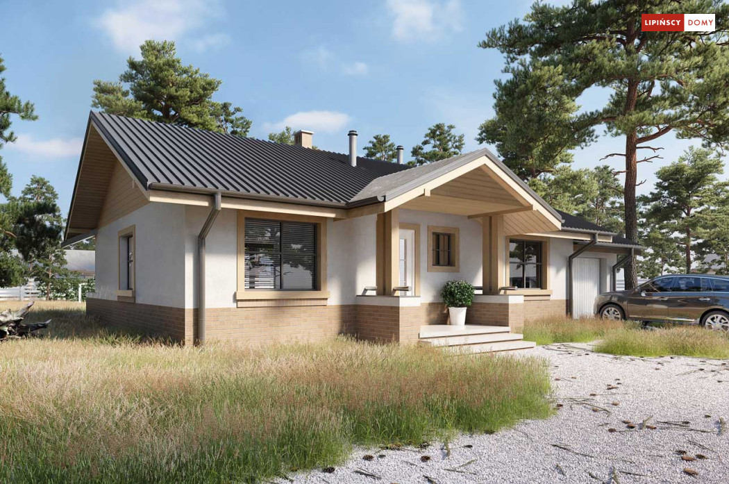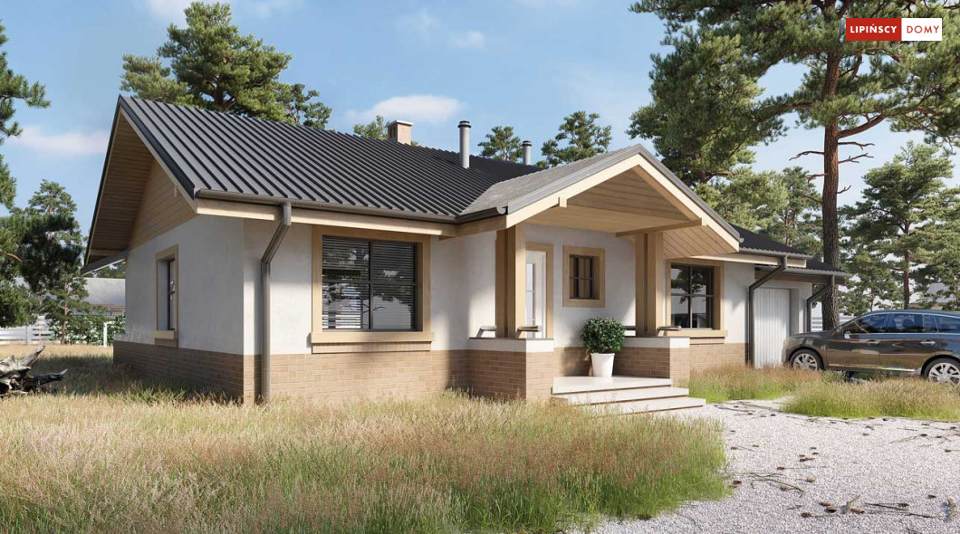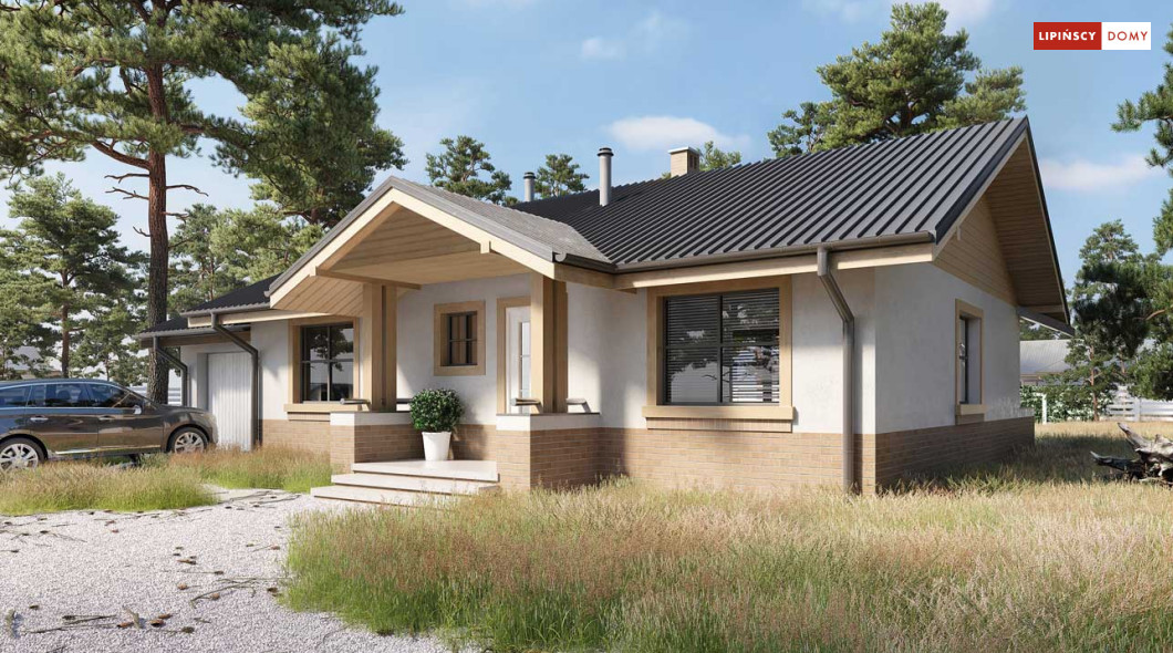 Niewielki, ale bardzo funkcjonalny dom parterowy, z wyraźnie wydzieloną częścią dzienną i nocną. W części dziennej znajduje się salon z kominkiem, kuchnia, którą, w zależności od potrzeb można zostawić otwartą na salon lub ją zamknąć, wc oraz pomieszczenie gospodarcze. Zaciszna część prywatna składa się z trzech sypialni i łazienki. Do domu przynależy jednostanowiskowy garaż, za którym znajduje się kotłownia, której usytuowanie i wymiary umożliwiają wstawienie pieca na paliwo stałe. Prosta bryła czyni dom tanim w budowie. Dostępna wersja projektu z kątem dachu 31°.
