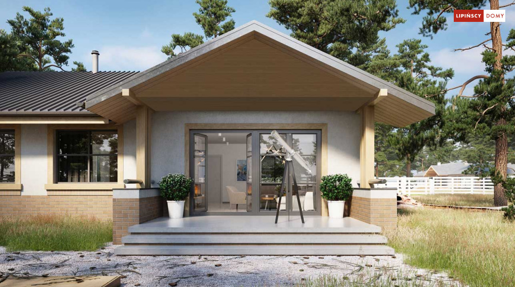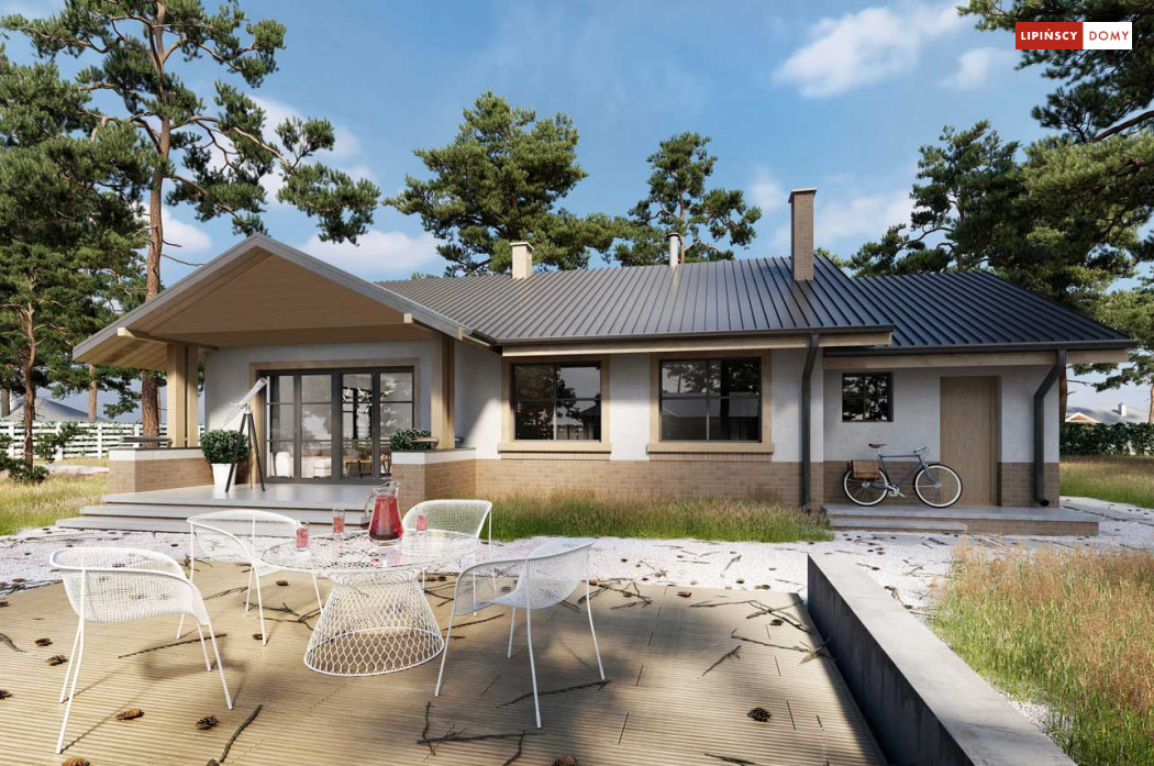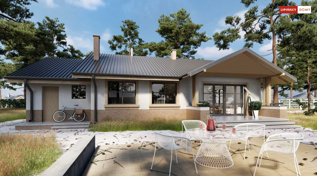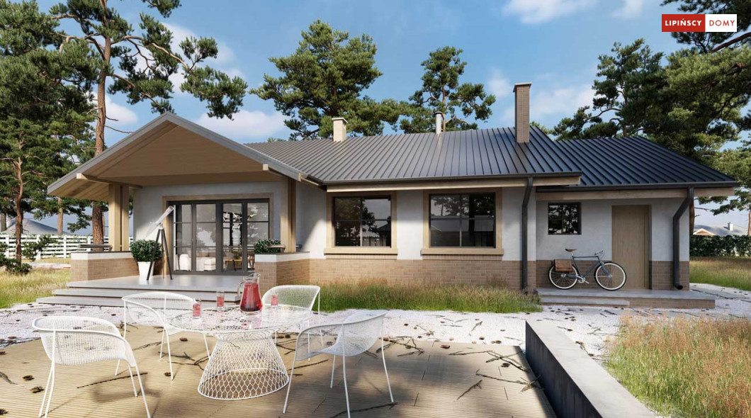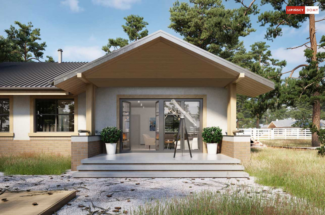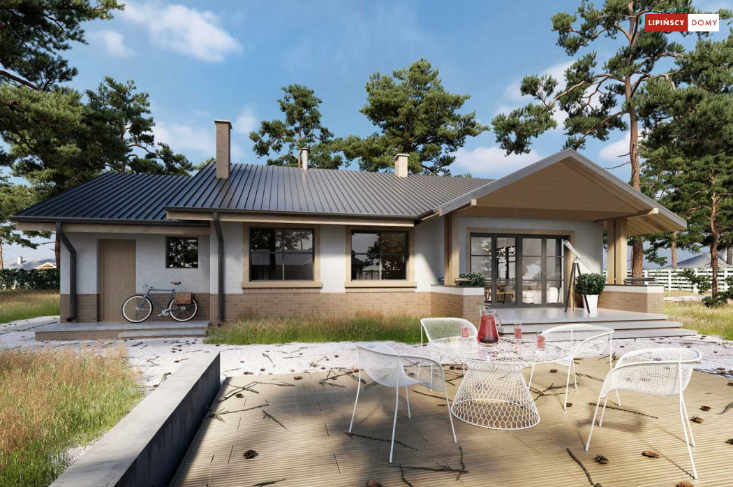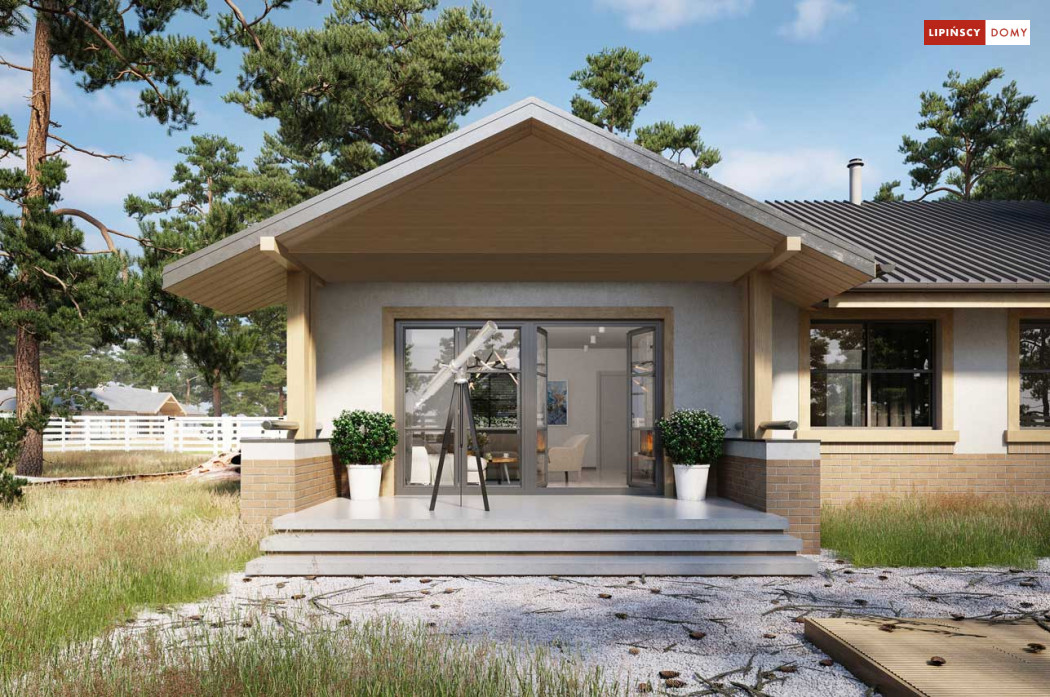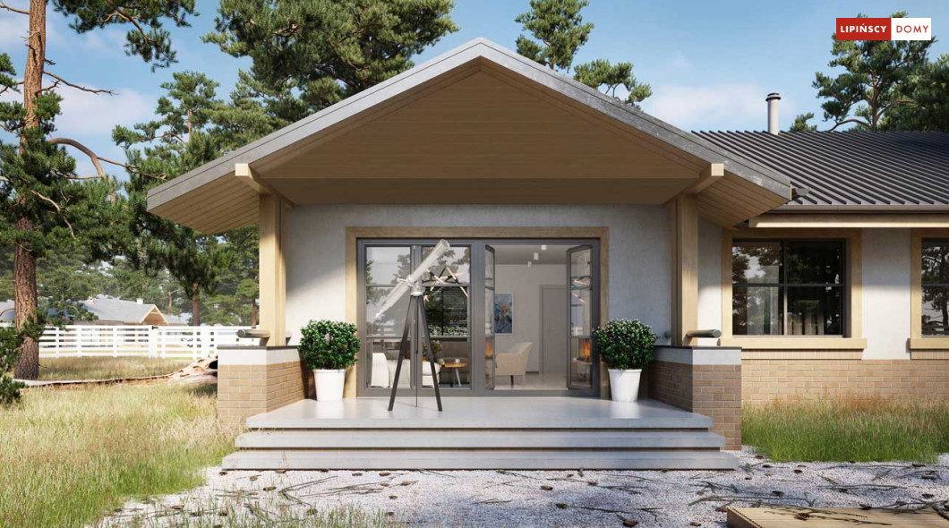 Niewielki, ale bardzo funkcjonalny dom parterowy, z wyraźnie wydzieloną częścią dzienną i nocną. W części dziennej znajduje się salon z kominkiem, kuchnia, którą, w zależności od potrzeb można zostawić otwartą na salon lub ją zamknąć, wc oraz pomieszczenie gospodarcze. Zaciszna część prywatna składa się z trzech sypialni i łazienki. Do domu przynależy jednostanowiskowy garaż, za którym znajduje się kotłownia, której usytuowanie i wymiary umożliwiają wstawienie pieca na paliwo stałe. Prosta bryła czyni dom tanim w budowie. Dostępna wersja projektu z kątem dachu 31°.