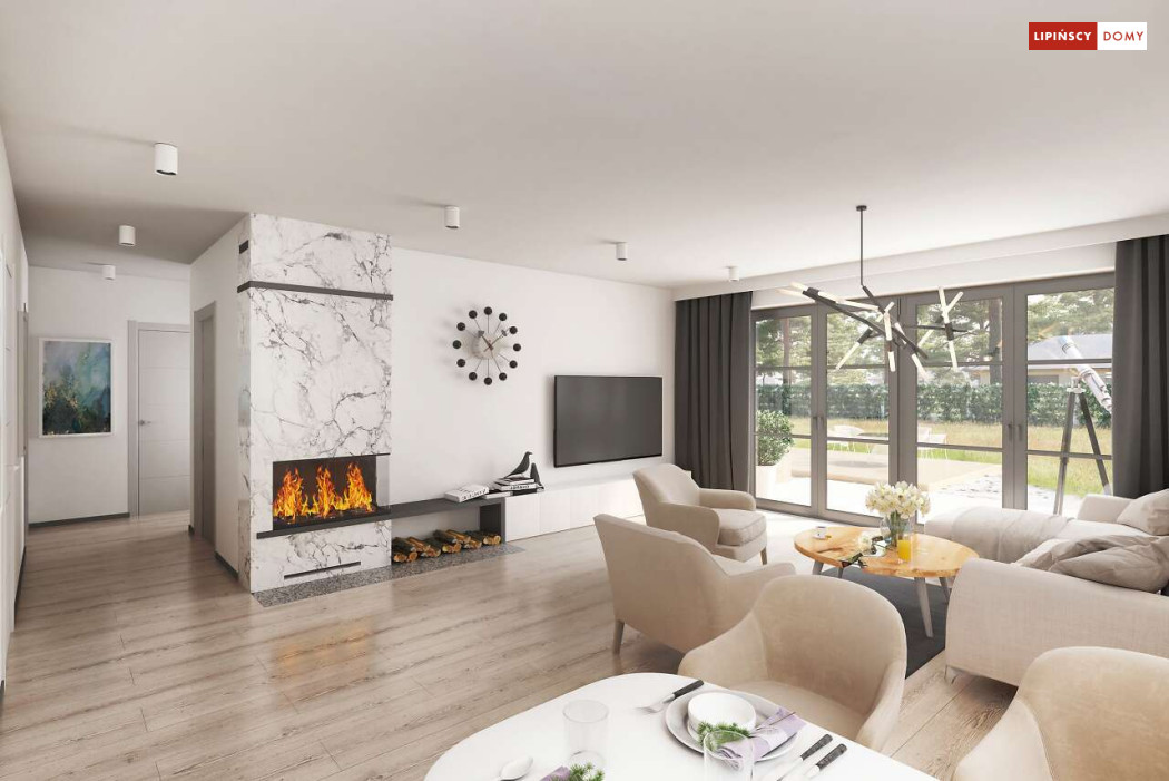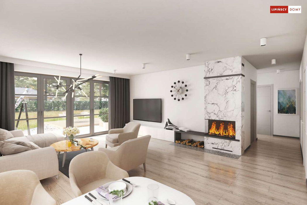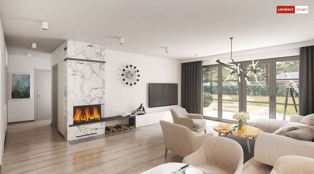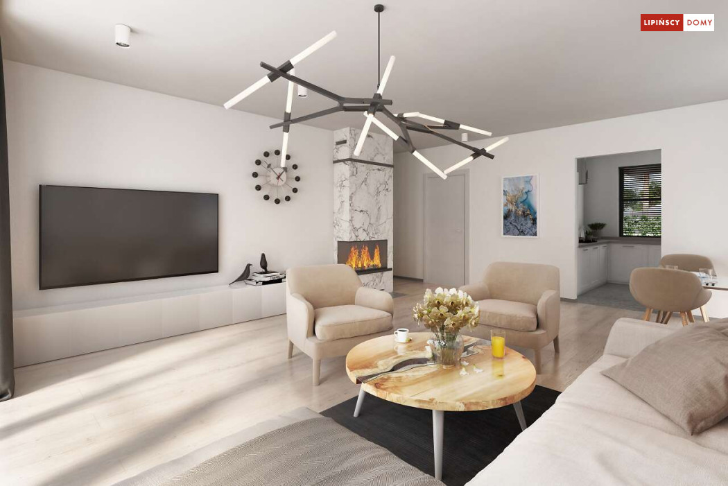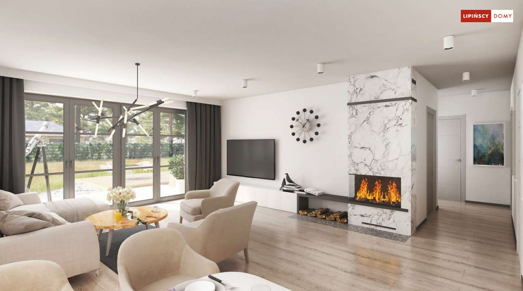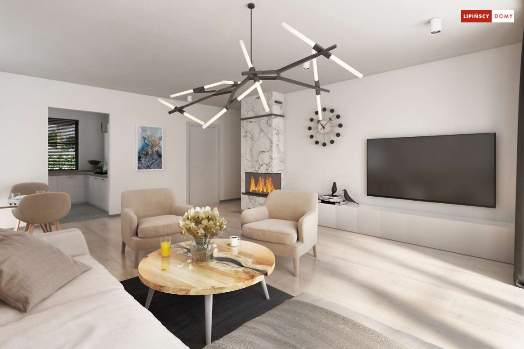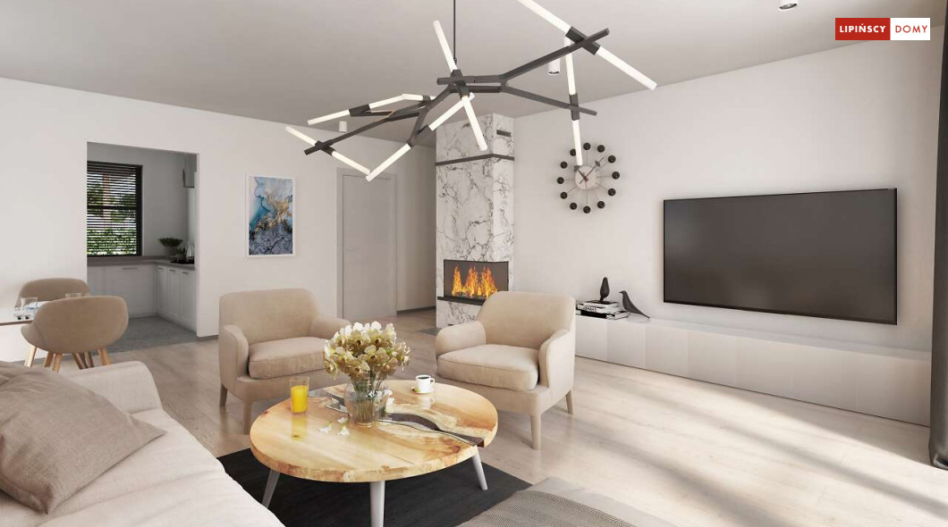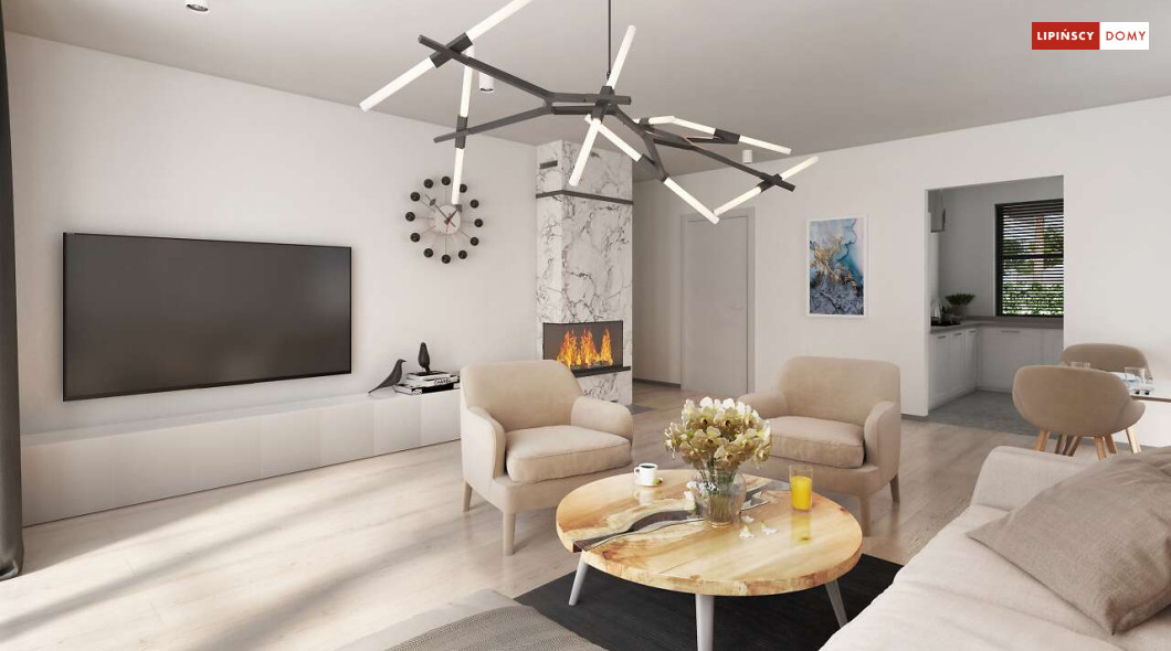Niewielki, ale bardzo funkcjonalny dom parterowy, z wyraźnie wydzieloną częścią dzienną i nocną. W części dziennej znajduje się salon z kominkiem, kuchnia, którą, w zależności od potrzeb można zostawić otwartą na salon lub ją zamknąć, wc oraz pomieszczenie gospodarcze. Zaciszna część prywatna składa się z trzech sypialni i łazienki. Do domu przynależy jednostanowiskowy garaż, za którym znajduje się kotłownia, której usytuowanie i wymiary umożliwiają wstawienie pieca na paliwo stałe. Prosta bryła czyni dom tanim w budowie. Dostępna wersja projektu z kątem dachu 31°.