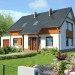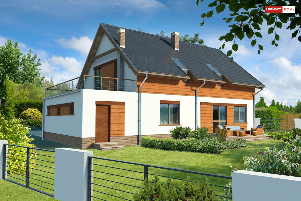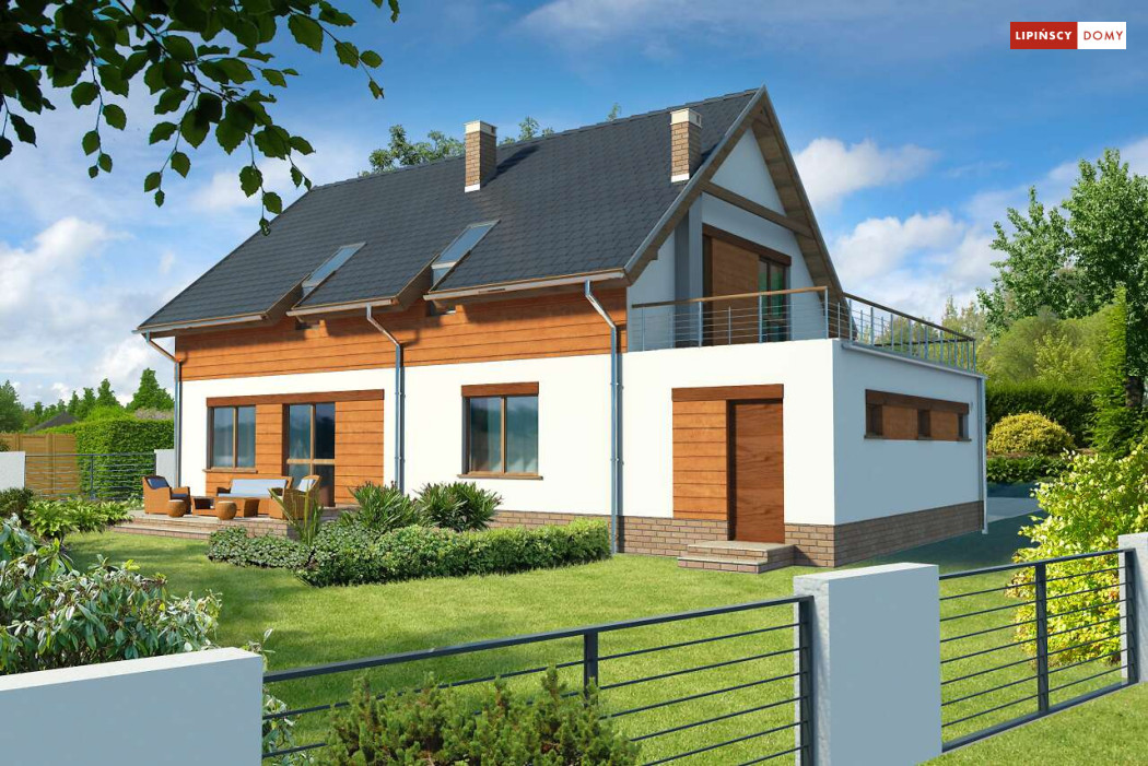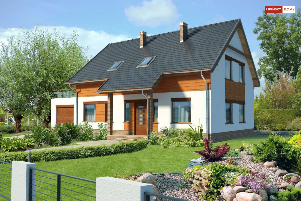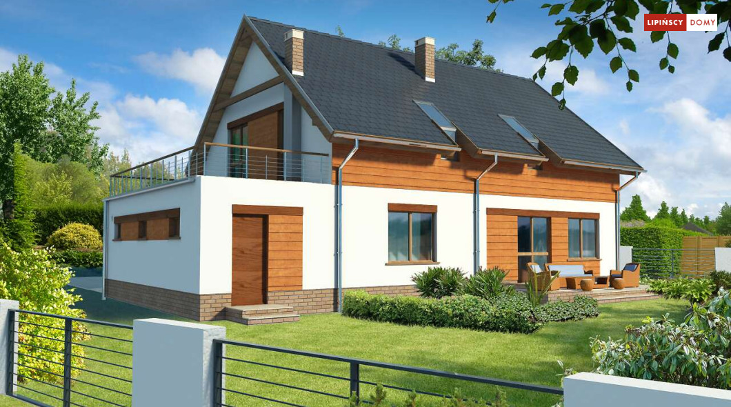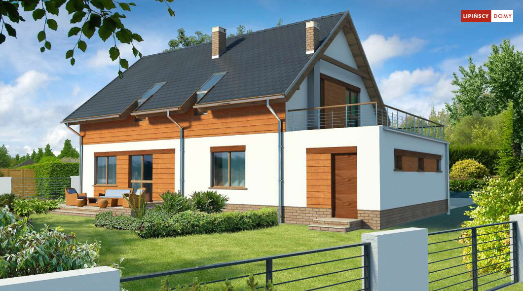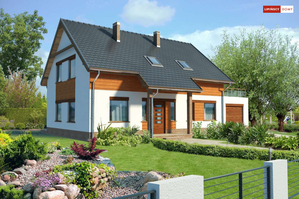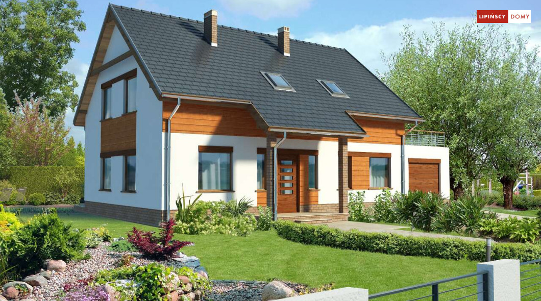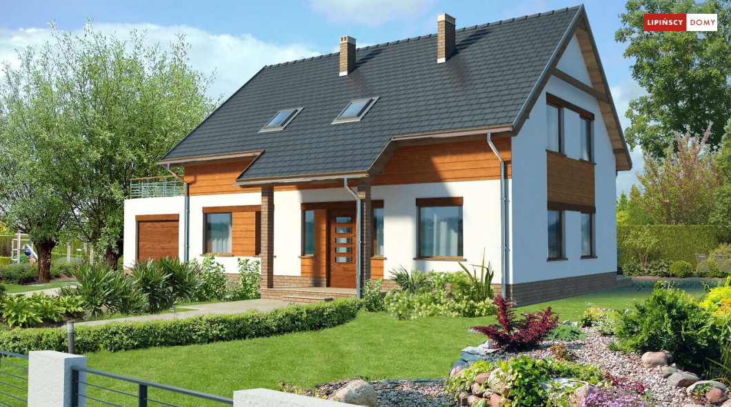 Prosty dom z użytkowym poddaszem, który, dzięki usytuowaniu schodów w wiatrołapie, może być realizowany dwuetapowo lub być domem wielopokoleniowym. Wnętrze bardzo funkcjonalnie rozplanowano i podzielono na parterze na duży salon z kominkiem, wygodną kuchnię z miejscem na stół, dwie sypialnie, łazienkę i pomieszczenie gospodarcze. Na poddaszu znajdują się cztery sypialnie, duża łazienka i salon, w którym, w razie potrzeby, można wydzielić aneks kuchenny. Do domu przynależy garaż, na dachu którego jest duży taras, a za garażem wydzielono kotłownię z niezależnym wyjściem na zewnątrz.