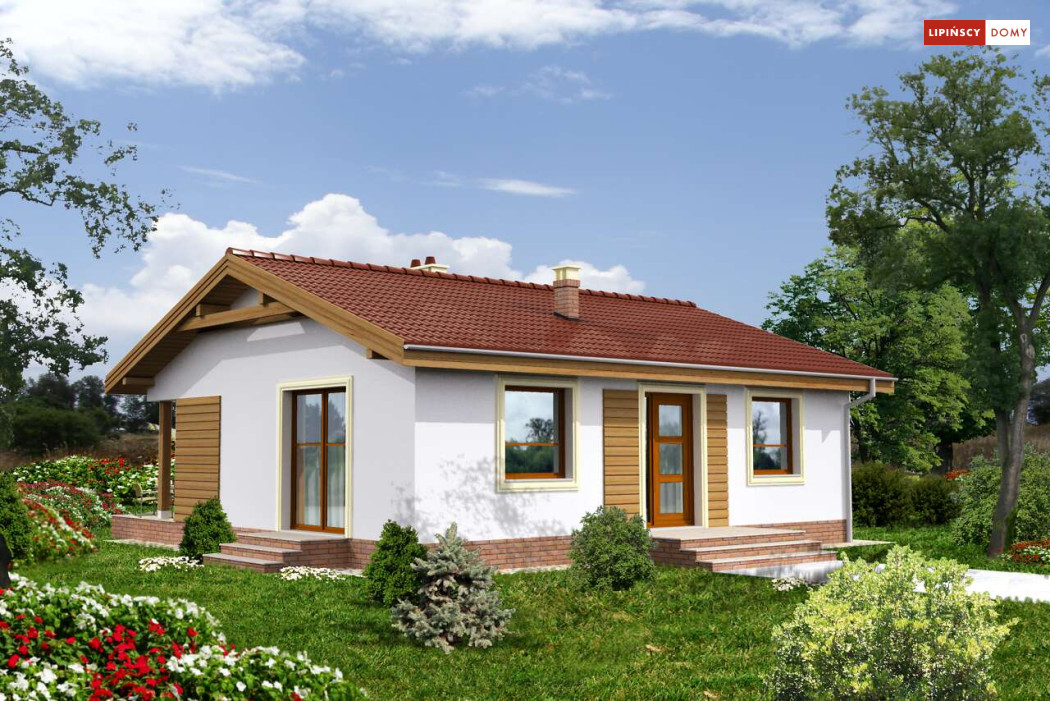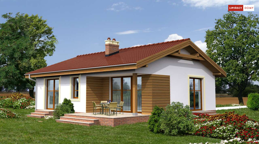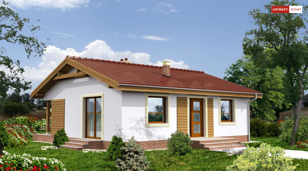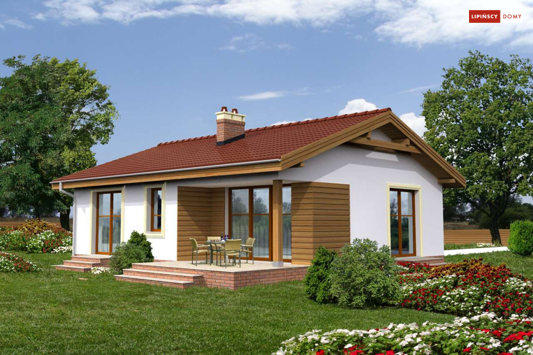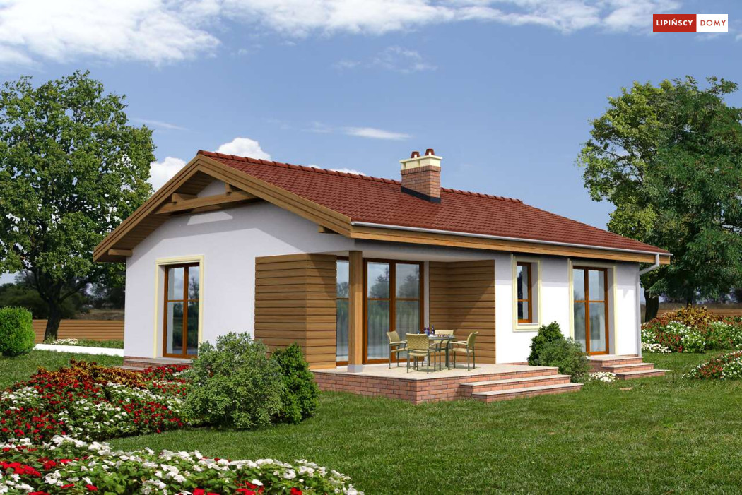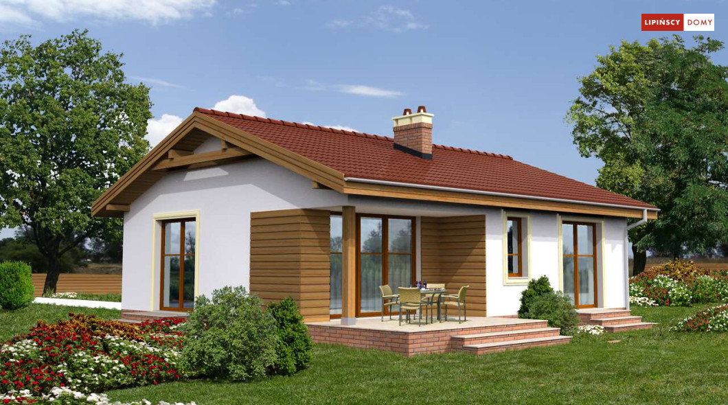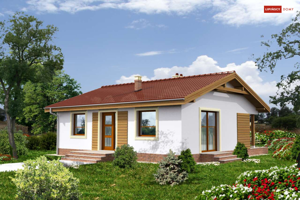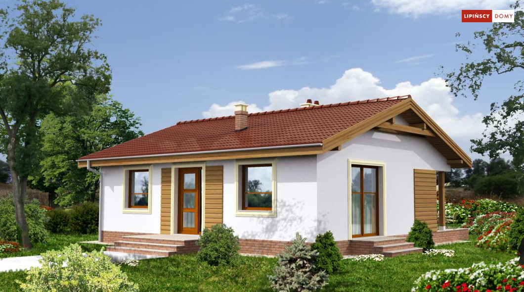 Przytulny dom parterowy, warta rozważenia propozycja dla seniorów lub niewielkiej rodziny. Mieszkańcy mają do dyspozycji funkcjonalny parter, podzielony na doświetlony salon z kominkiem i aneksem kuchennym i miejscem na stół, dwie sypialnie, łazienkę i pomieszczenie gospodarcze z kotłem gazowym. Niewielkie rozmiary domu czynią go zarówno tanim w budowie, jak i ekonomicznym w późniejszej eksploatacji. Ładna, proporcjonalna bryła, przekryta prostym, dwuspadowym dachem, pięknie wpisze się w każdy krajobraz. Ozdobą domu jest zadaszony taras, idealne miejsce do spędzania czasu na świeżym powietrzu.