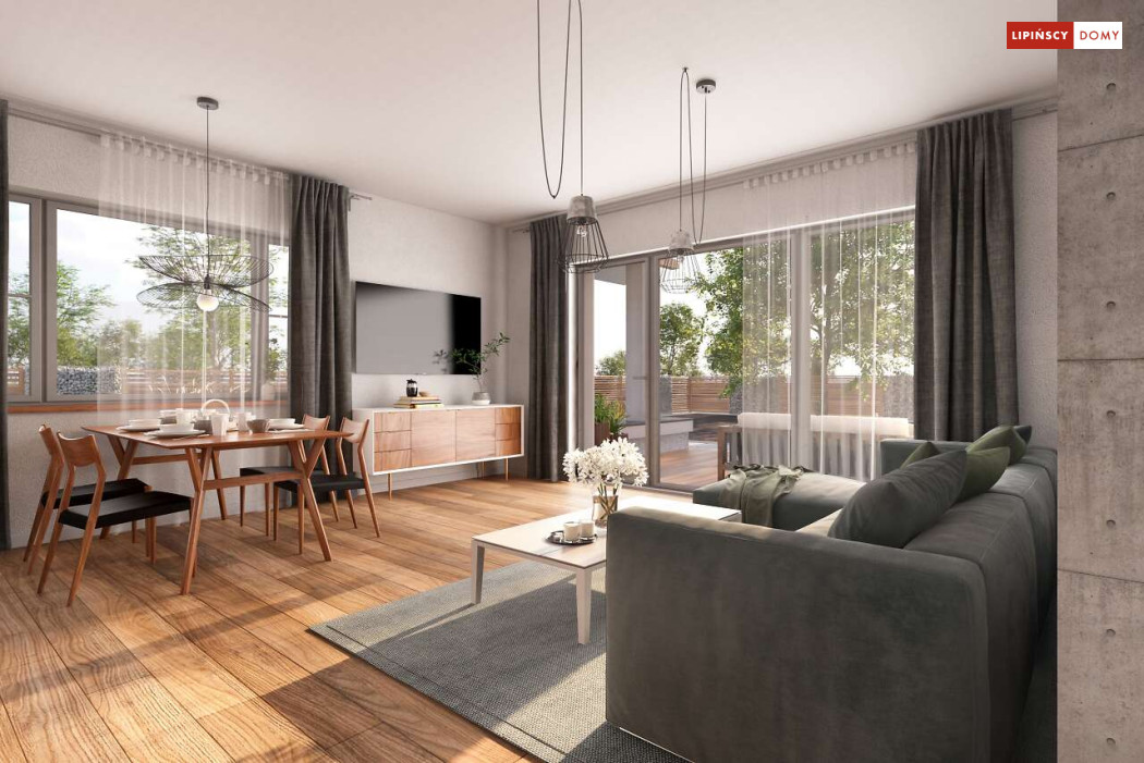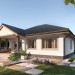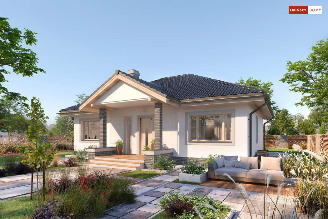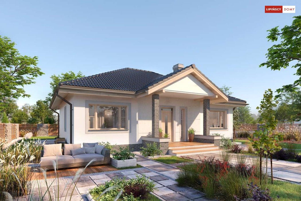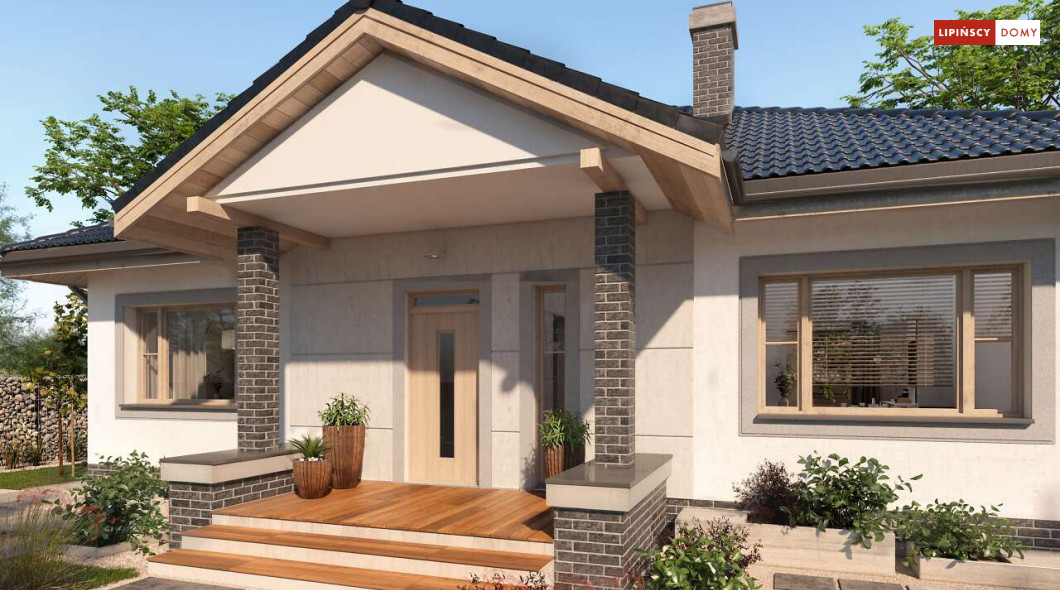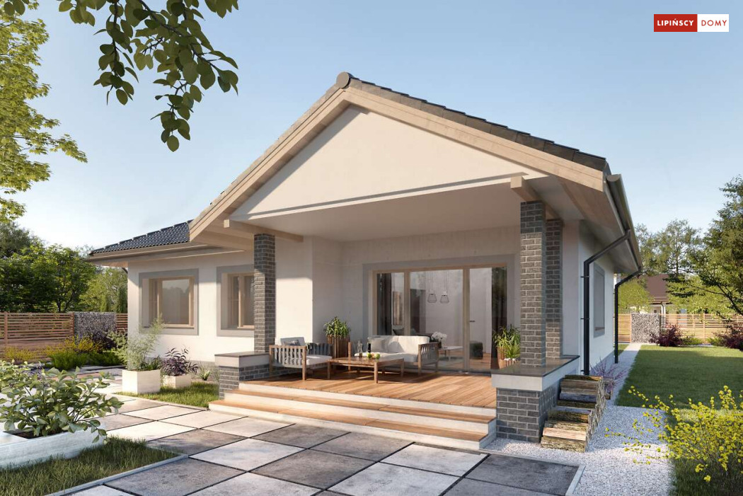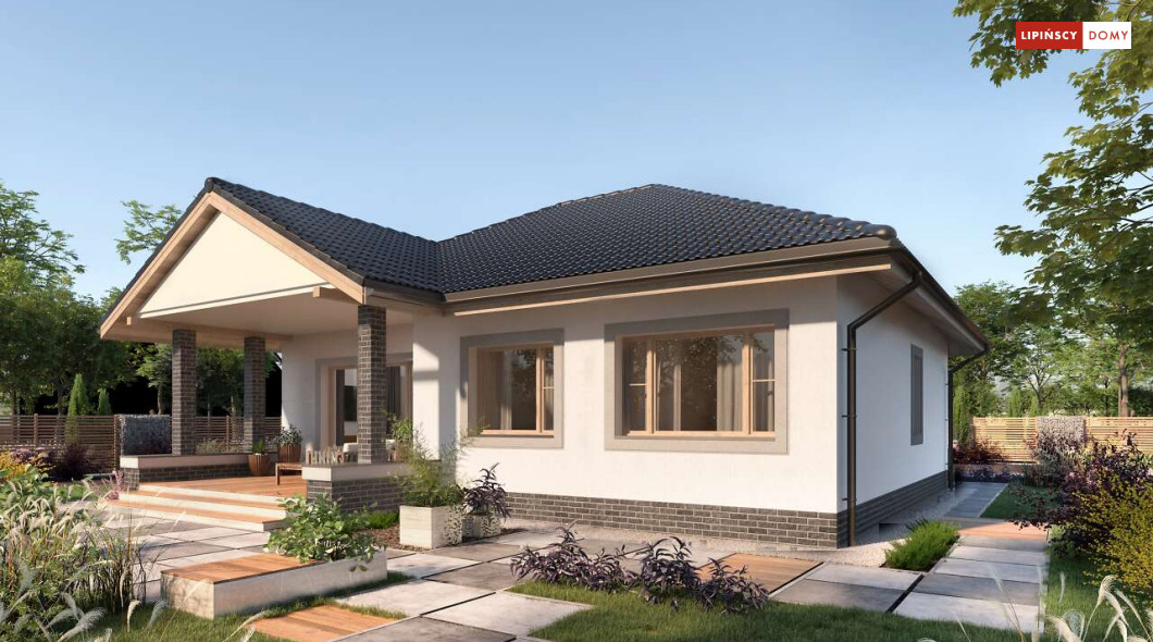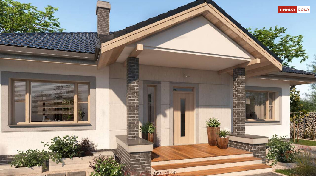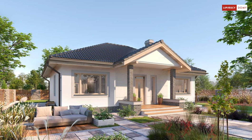 Dom parterowy, w standardzie energooszczędnym, o prostej bryle i funkcjonalnym wnętrzu. Mieszkańcy mogą korzystać z wygodnej, połączonej z salonem kuchni, trzech ustawnych sypialni, łazienki oraz pomieszczenia gospodarczego. Uwagę zwraca zadaszone wejście, a ozdobą domu jest niewątpliwie także zadaszony taras od strony ogrodowej. Prosta bryła i brak skomplikowanych rozwiązań architektonicznych to także duża zaleta domu, gdyż dzięki temu jest on niedrogi w budowie.