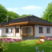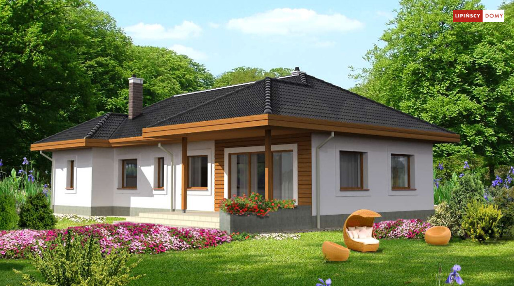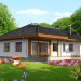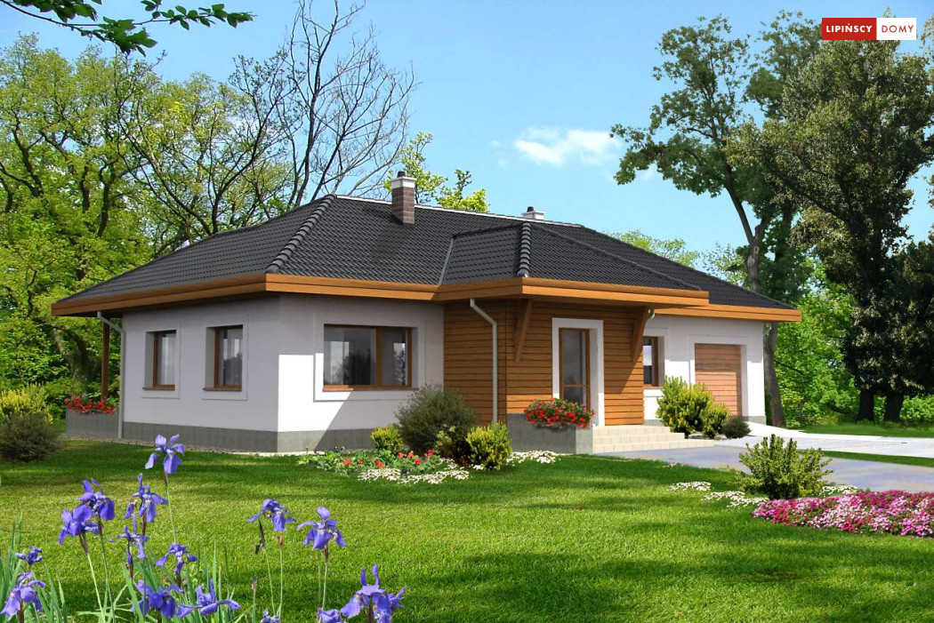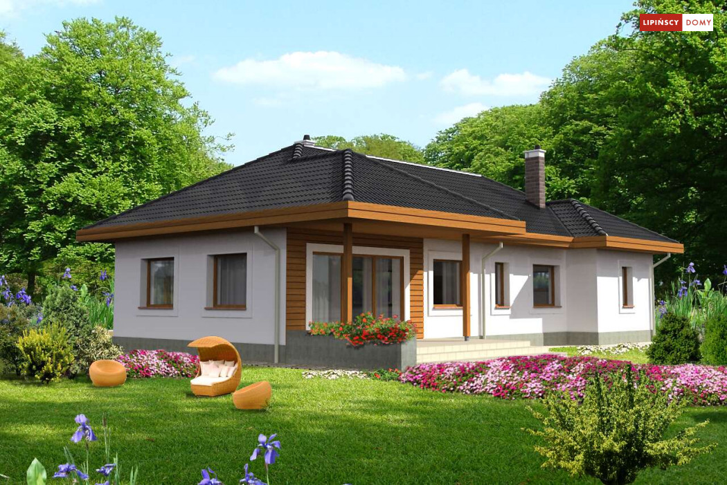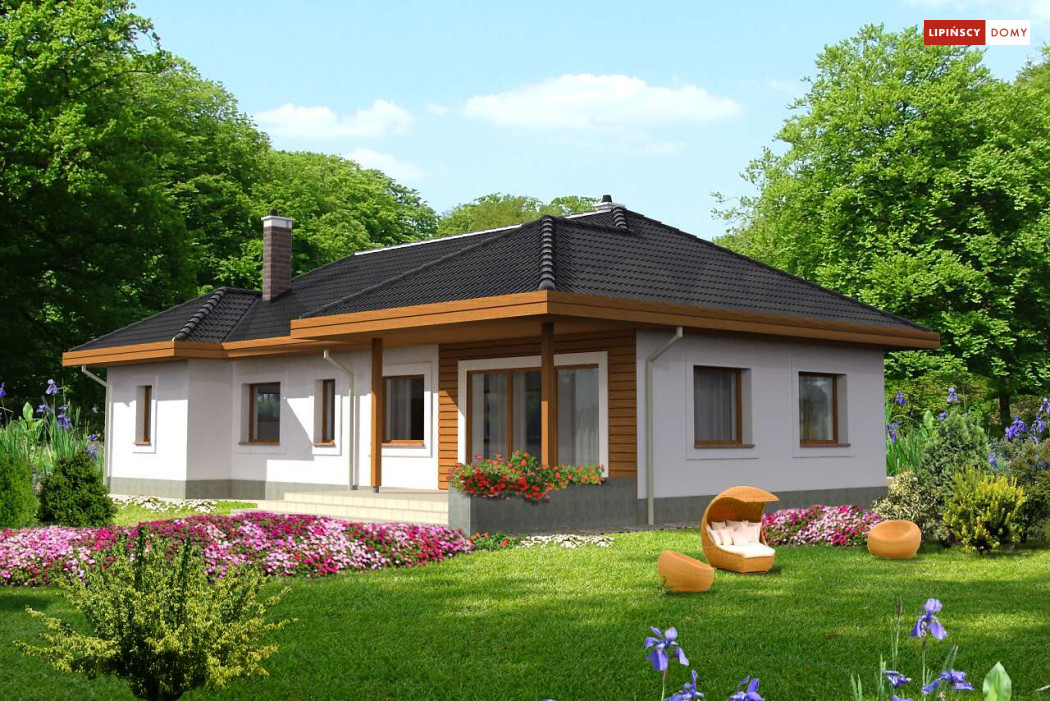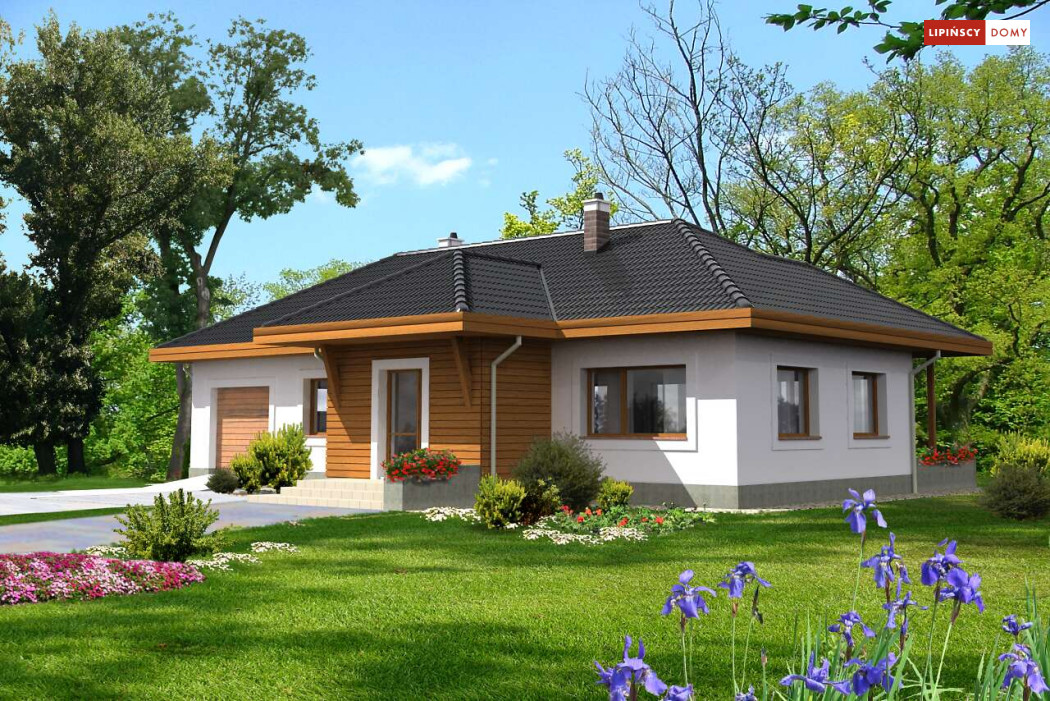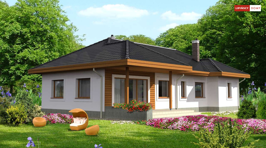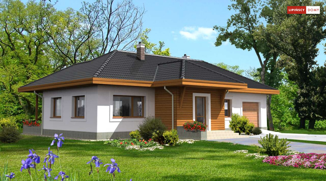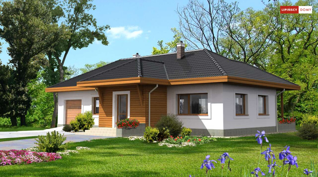 Niewielki dom parterowy, zaprojektowany w standardzie energooszczędnym. Mieszkańcy mają do dyspozycji otwartą kuchnię, połączoną z salonem i trzy sypialnie oraz łazienkę i wc. Za jednostanowiskowym garażem zlokalizowano kotłownię, z niezależnym wyjściem na zewnątrz. Prosta bryła urozmaicona została drewnianymi elementami elewacji. Od strony ogrodu znajduje się zadaszony taras, na który można wyjść z salon przez duże, przeszklone drzwi. Dzięki temu wnętrze jest dobrze doświetlone.