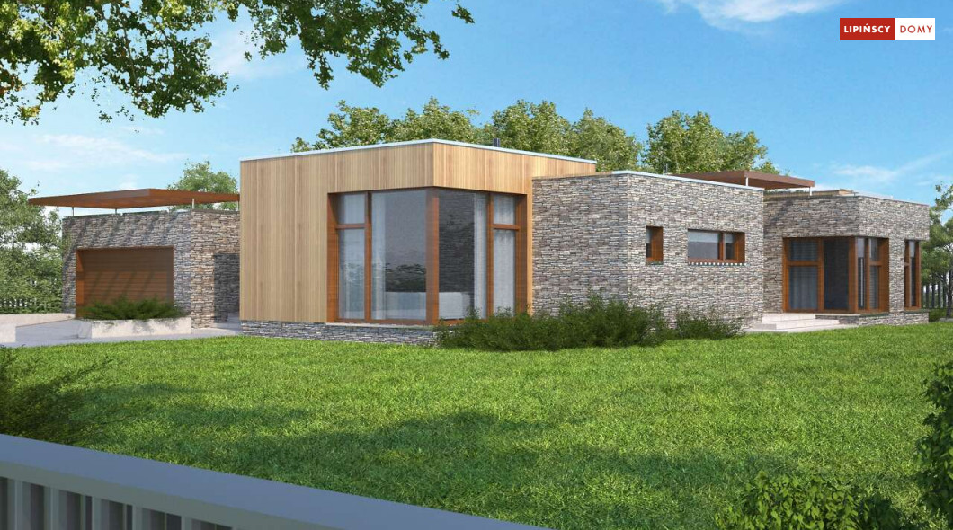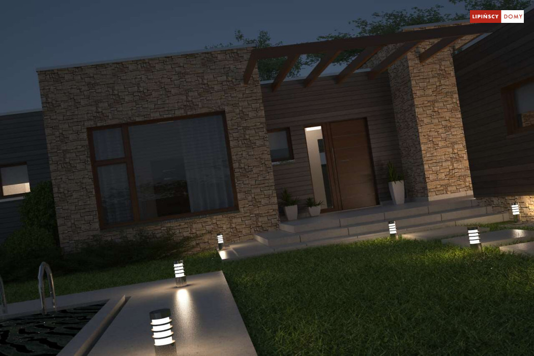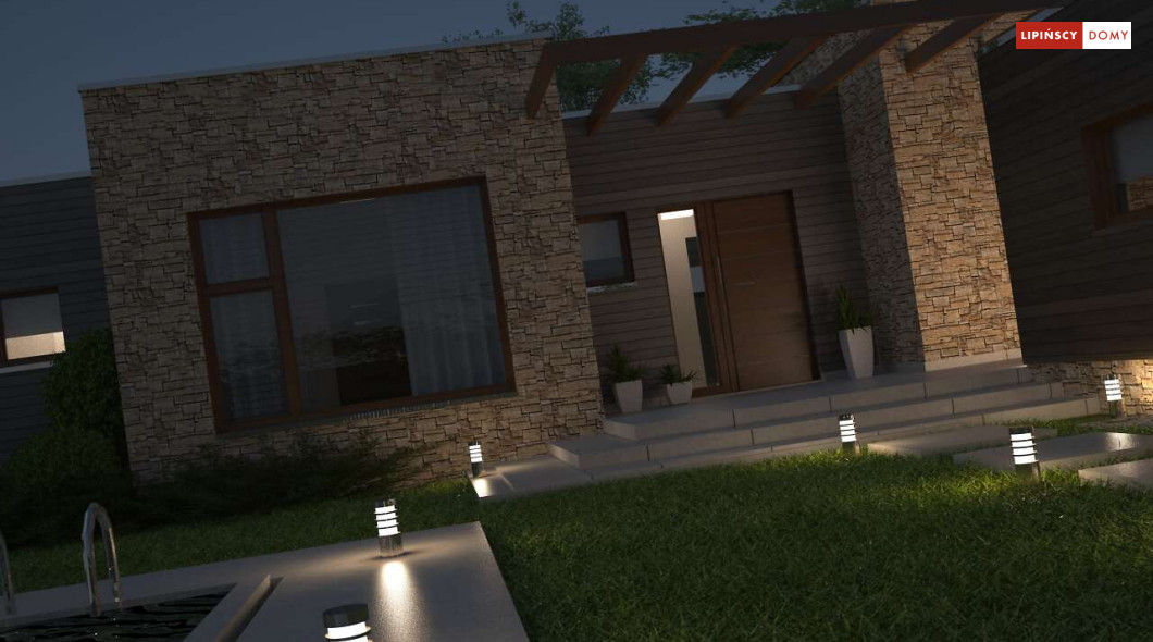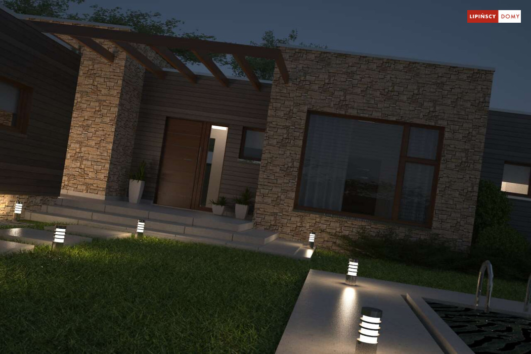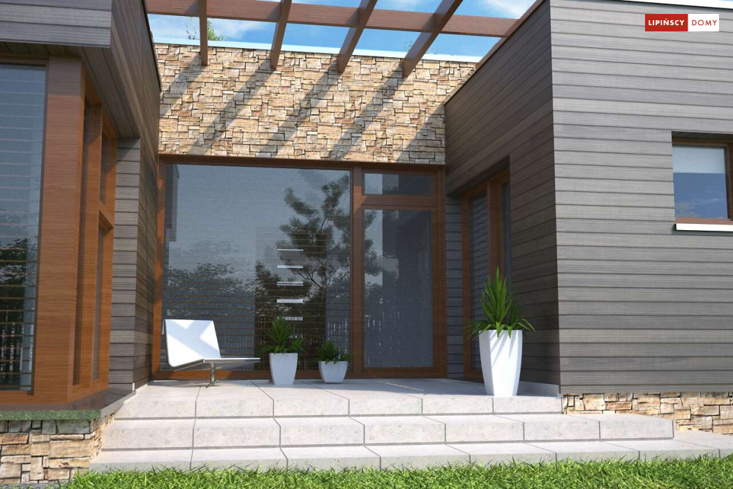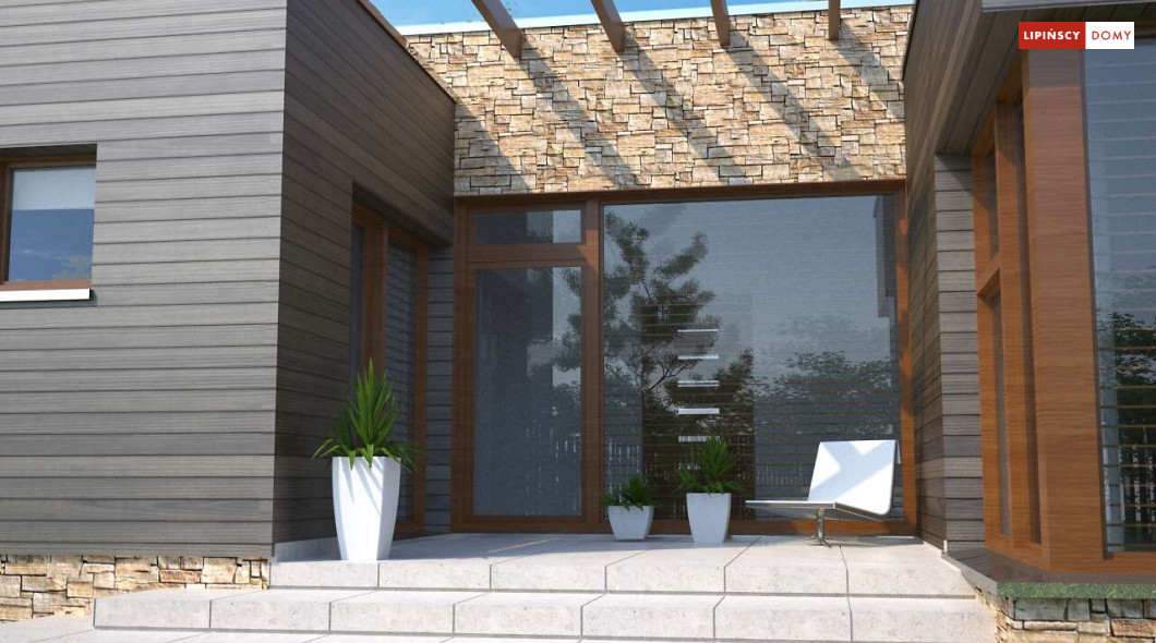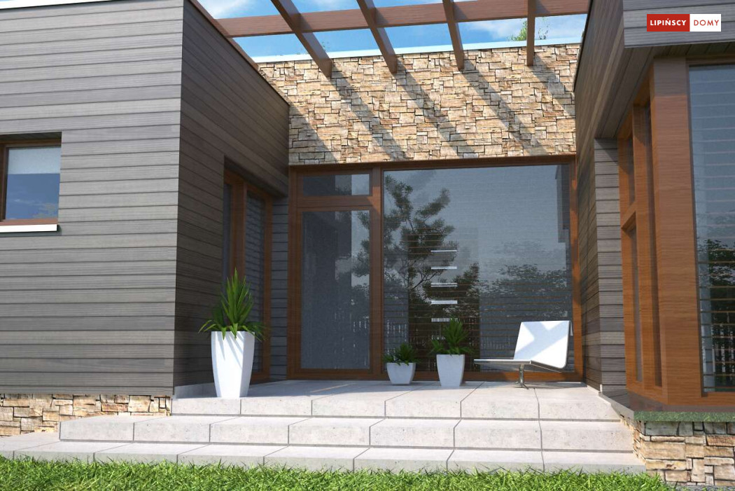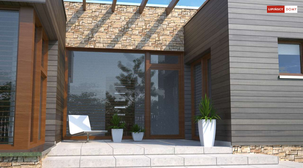 Piękny dom parterowy, który jest tak naprawdę komfortową willą o pięknie skomponowanej bryle, harmonijnych elewacjach i nowocześnie zaprojektowanym wnętrzu. Duże przeszklenia przenikają przestrzeń i sprawiają, że dom będzie wypełniony światłem za dnia, a wieczorem będzie pięknie wyglądał z ogrodu. Dodatkowo sprzyjają przenikaniu ciepła do wnętrza, co w tym energooszczędnym domu ma ogromne znaczenie. Ażurowe zadaszenia nad wejściem i tarasem potęgują efekt trójwymiarowości domu.