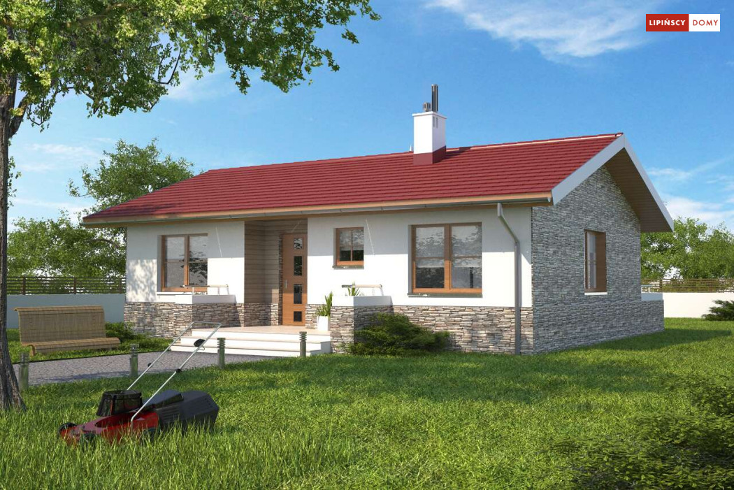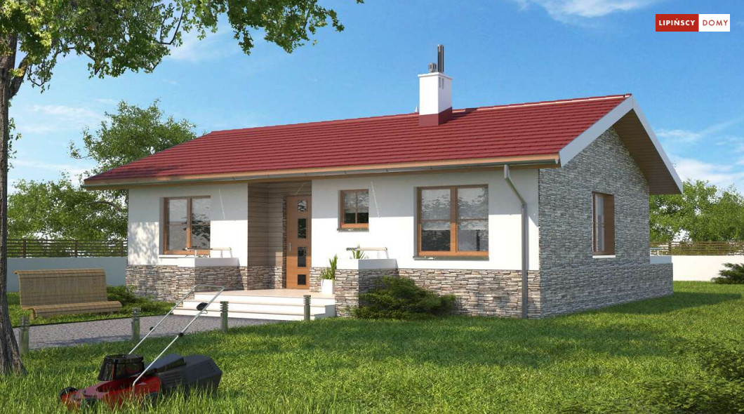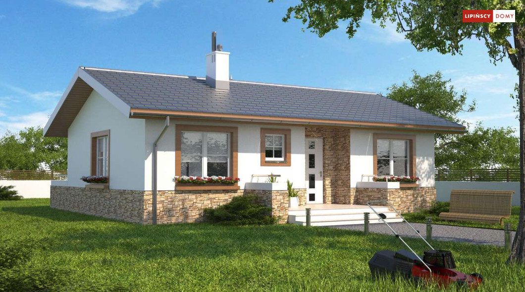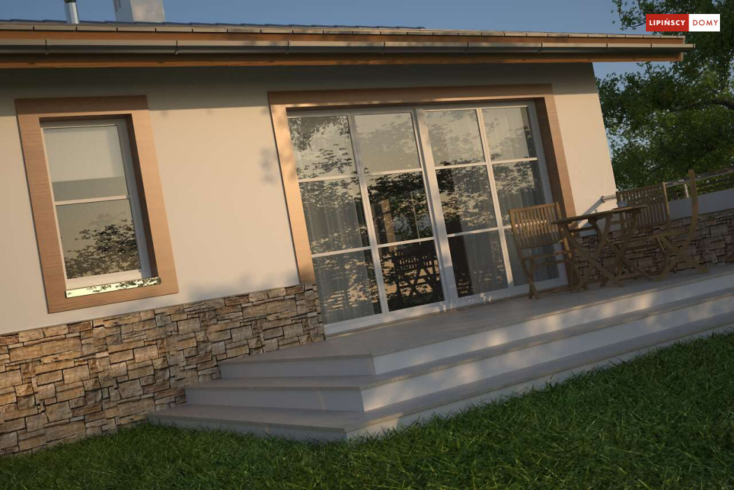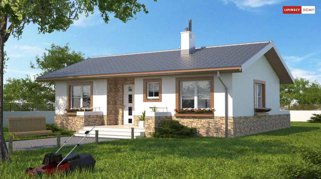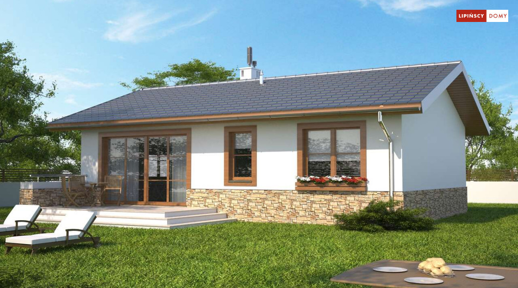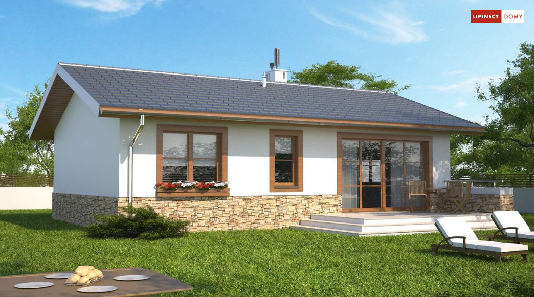 Uroczy dom parterowy z dwiema sypialniami, łazienką i otwartą przestrzenią dzienną pozwoli wygodnie mieszkać niewielkiej rodzinie. Strefa pokoju dziennego i kuchni jest wygodnie rozplanowana i wzbogacona przez centralnie umieszczony kominek i duże przeszklenie tarasu. Dwie wygodne sypialnie i łazienka zapewnią komfort domownikom. Kotłownia przy wejściu może być wykorzystana dodatkowo na schowek. Prosta bryła z dwuspadowym dachem oraz nieskomplikowana konstrukcja przy niewielkiej powierzchni przełożą się na niskie koszty realizacji.