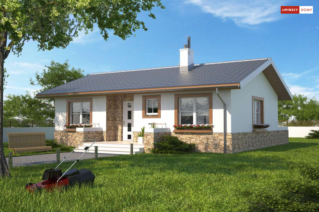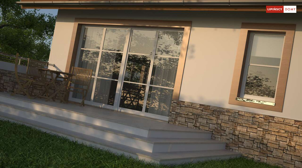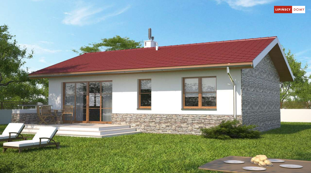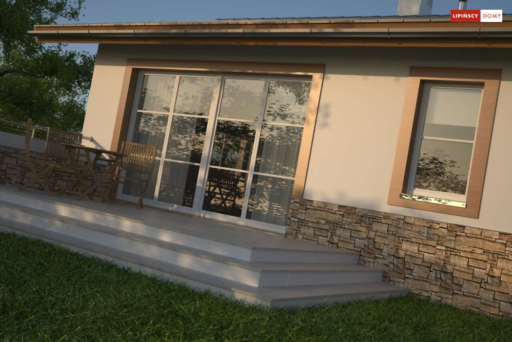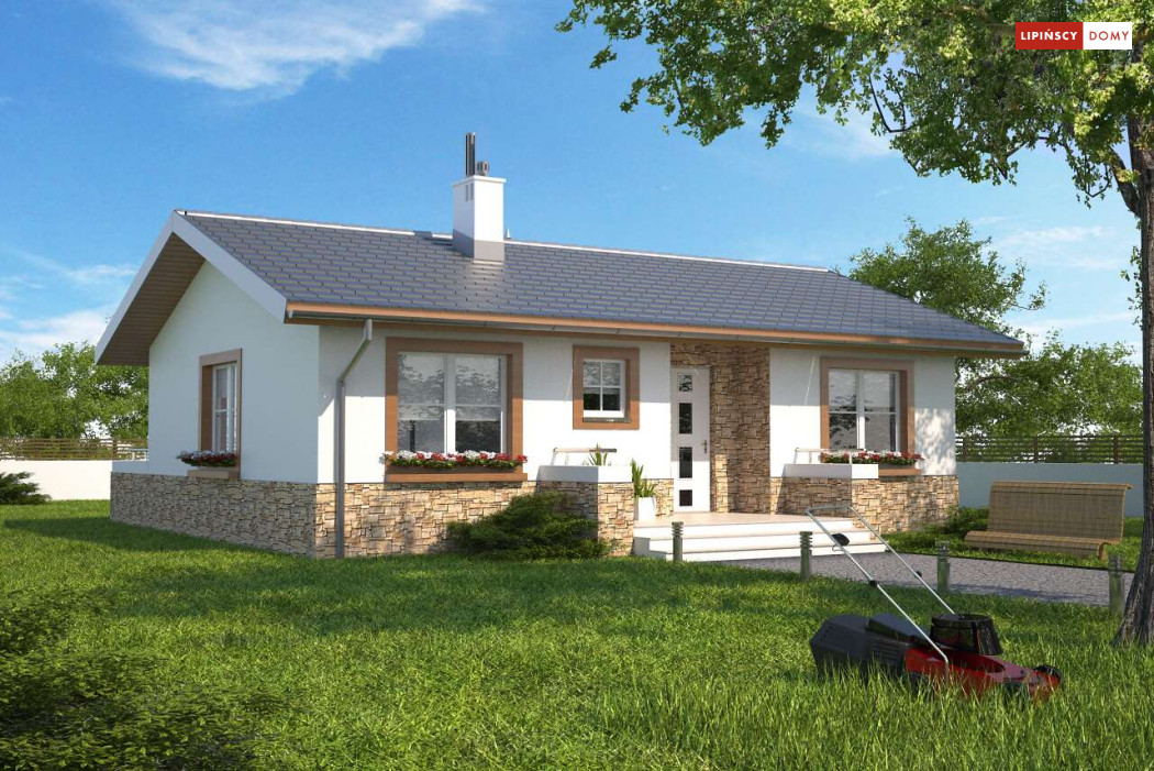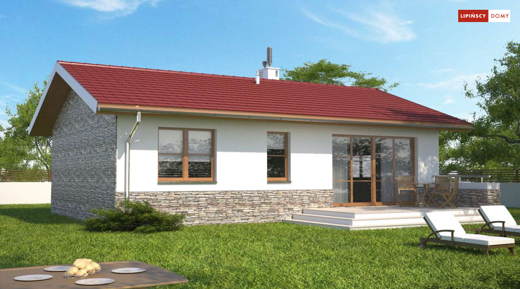 Uroczy dom parterowy z dwiema sypialniami, łazienką i otwartą przestrzenią dzienną pozwoli wygodnie mieszkać niewielkiej rodzinie. Strefa pokoju dziennego i kuchni jest wygodnie rozplanowana i wzbogacona przez centralnie umieszczony kominek i duże przeszklenie tarasu. Dwie wygodne sypialnie i łazienka zapewnią komfort domownikom. Kotłownia przy wejściu może być wykorzystana dodatkowo na schowek. Prosta bryła z dwuspadowym dachem oraz nieskomplikowana konstrukcja przy niewielkiej powierzchni przełożą się na niskie koszty realizacji.