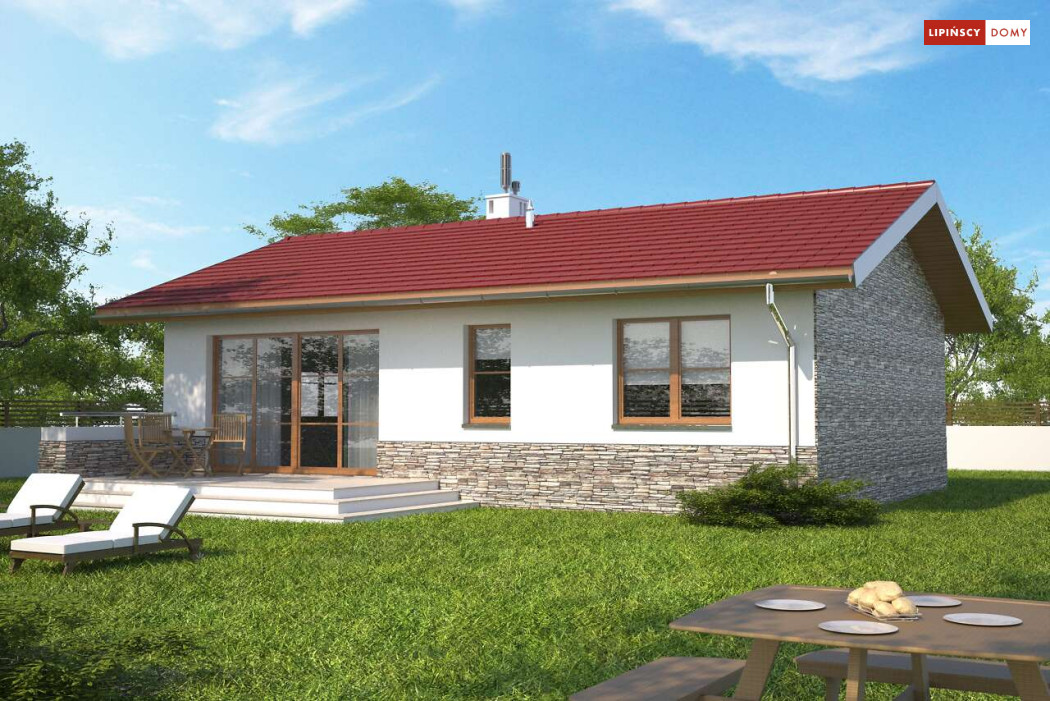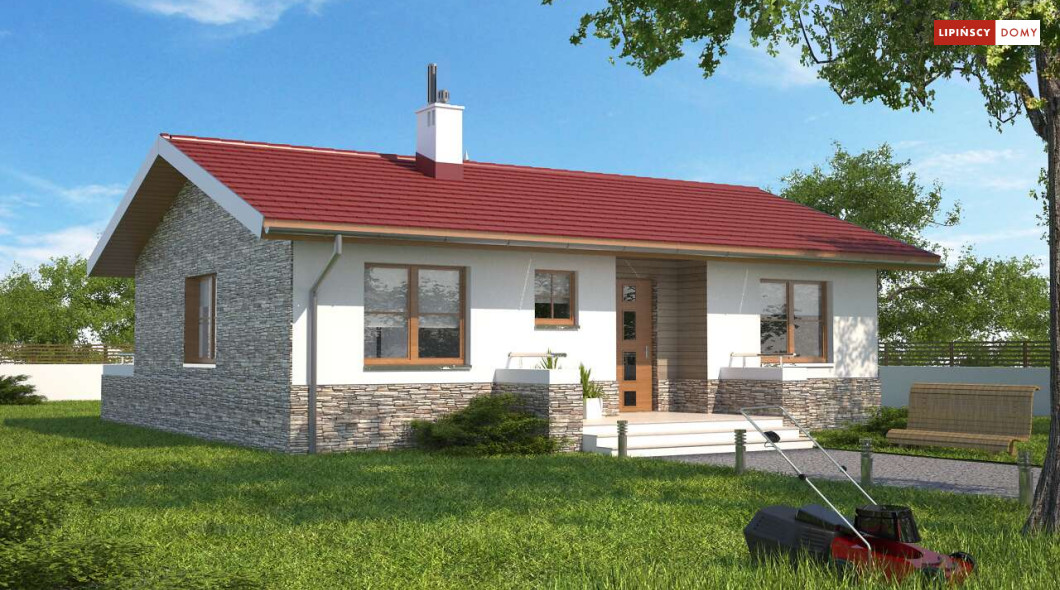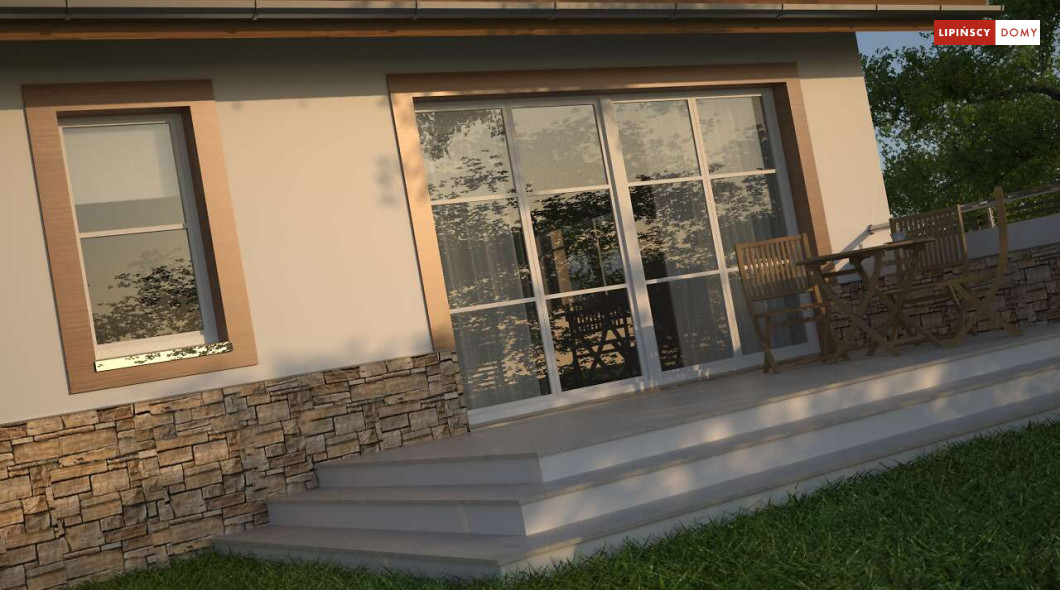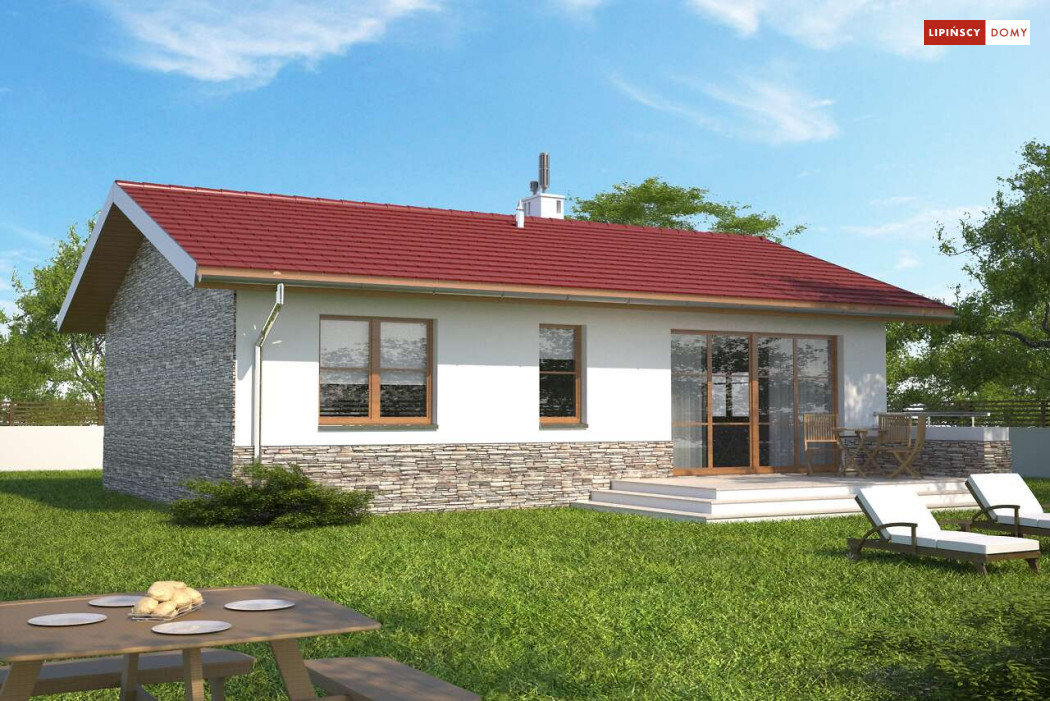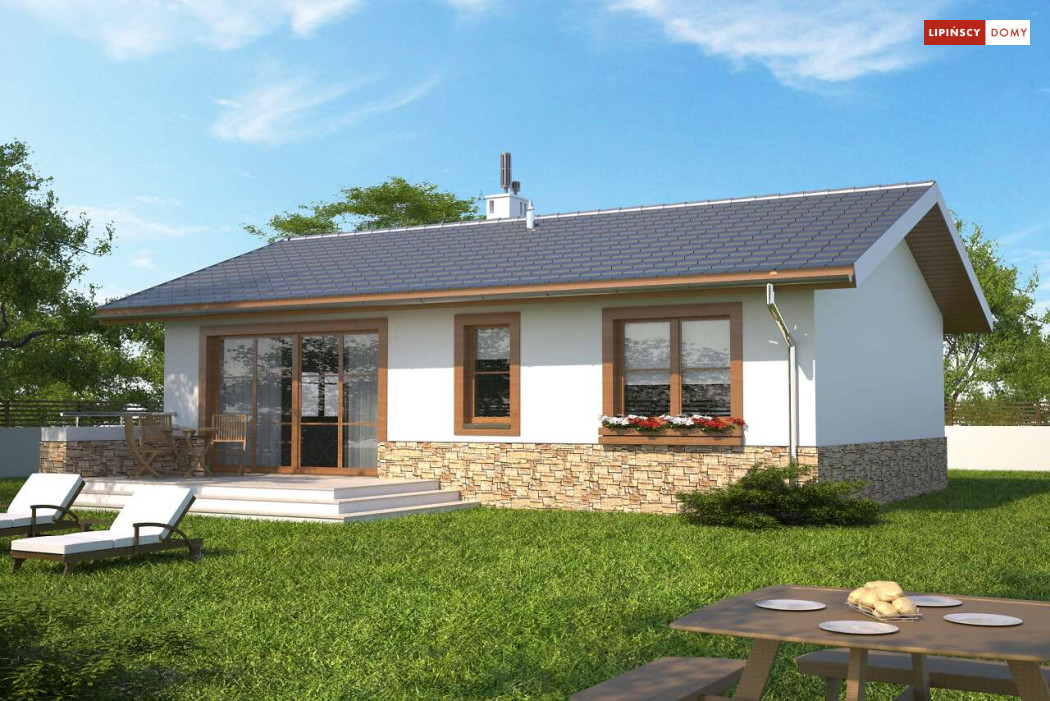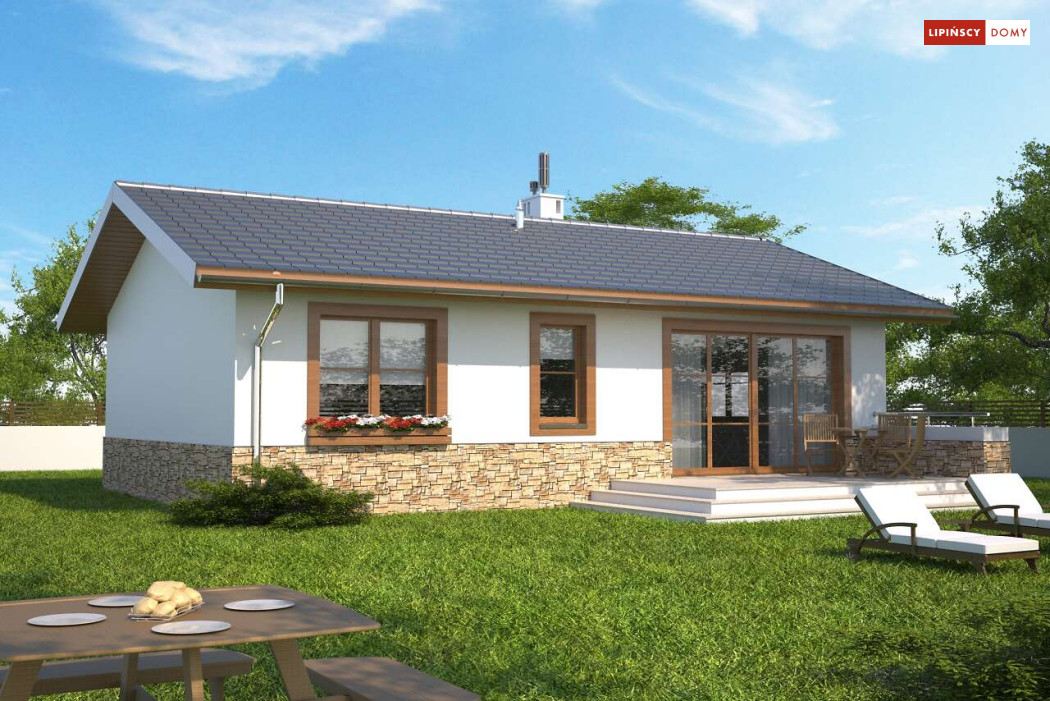 Uroczy dom parterowy z dwiema sypialniami, łazienką i otwartą przestrzenią dzienną pozwoli wygodnie mieszkać niewielkiej rodzinie. Strefa pokoju dziennego i kuchni jest wygodnie rozplanowana i wzbogacona przez centralnie umieszczony kominek i duże przeszklenie tarasu. Dwie wygodne sypialnie i łazienka zapewnią komfort domownikom. Kotłownia przy wejściu może być wykorzystana dodatkowo na schowek. Prosta bryła z dwuspadowym dachem oraz nieskomplikowana konstrukcja przy niewielkiej powierzchni przełożą się na niskie koszty realizacji.