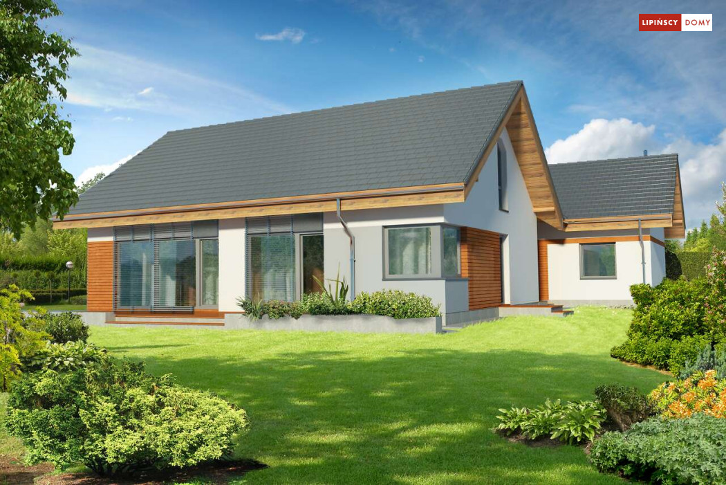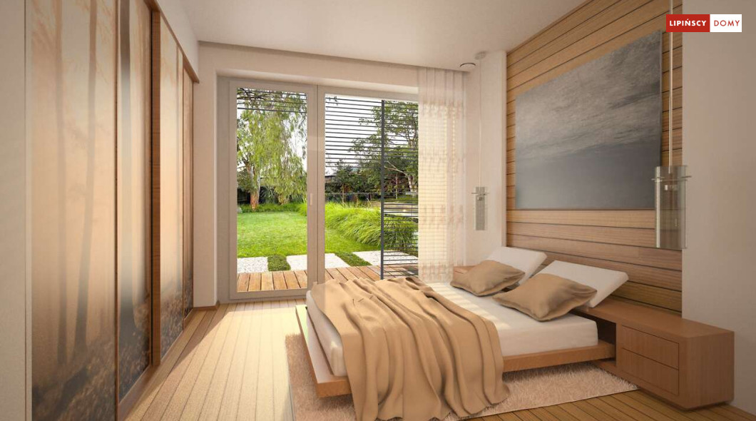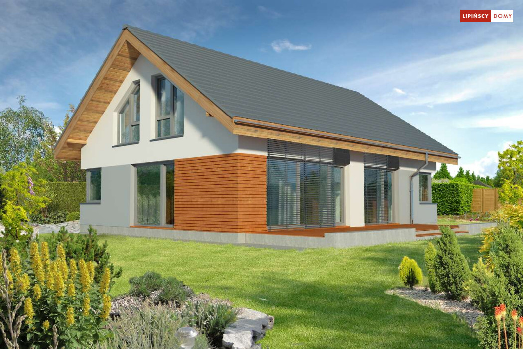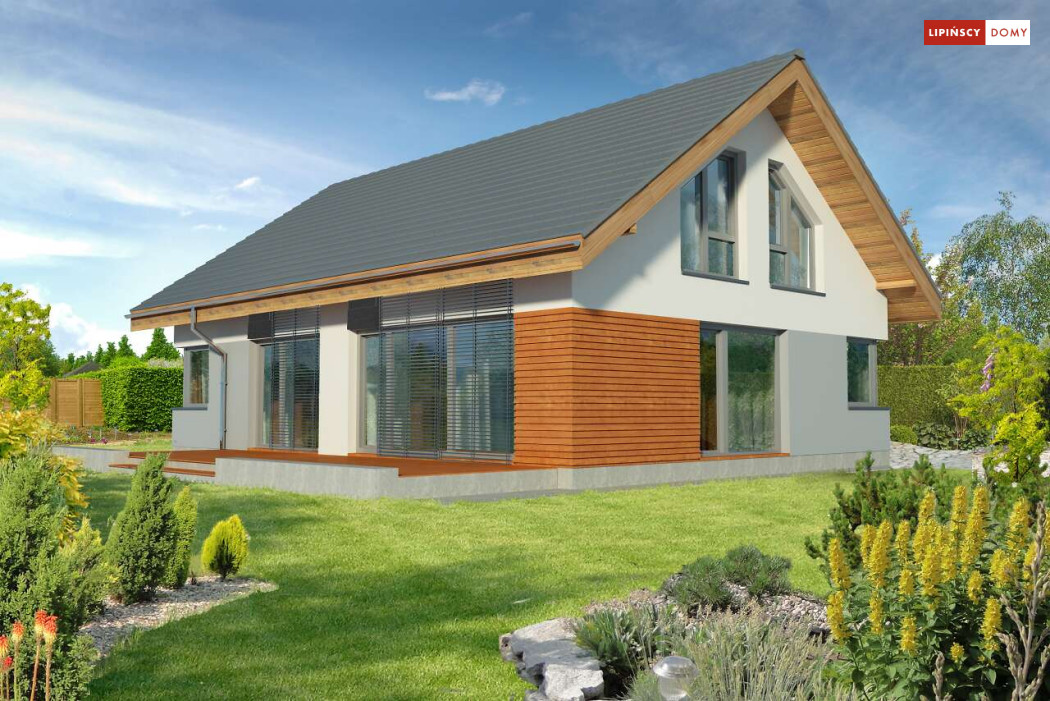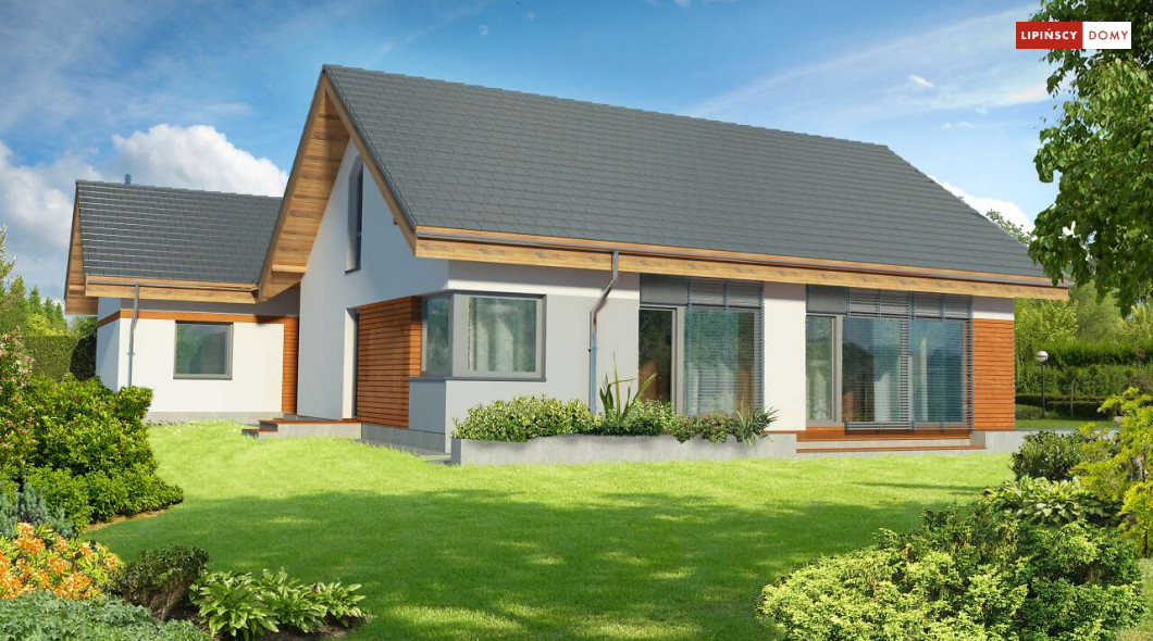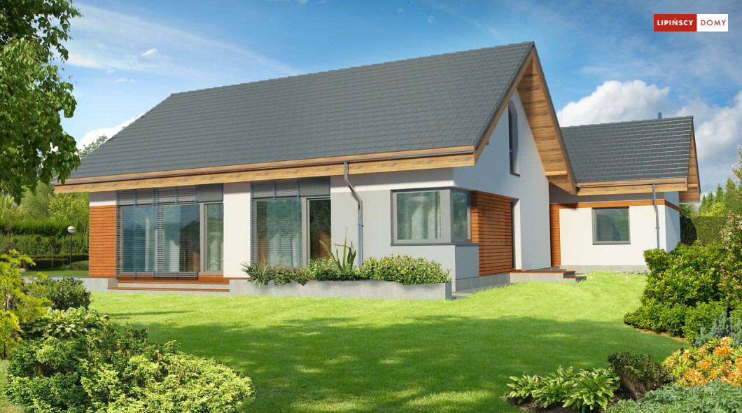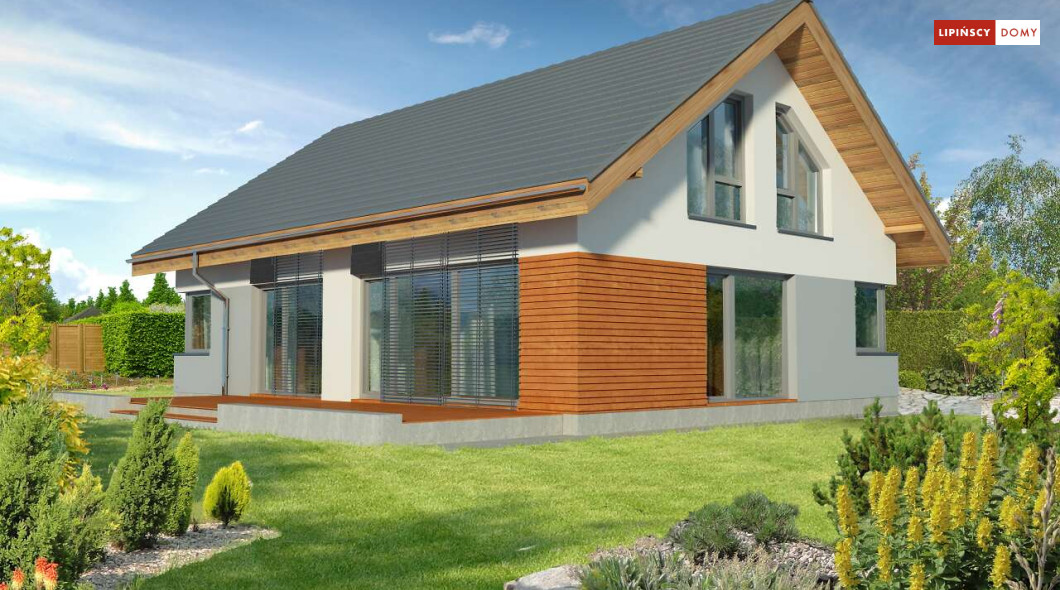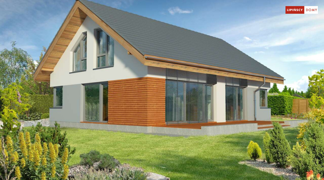 Ten dom ma w sobie lekkość. Nie tylko wiąże się to z miłą dla oka architekturą, ale głównie jest spowodowane tym, że jako dom pasywny, dom ten jest czysty ekologicznie. Oferuje zatem czyste ciepło, przyjazne dla środowiska i wielokrotnie tańsze. Dom jest jasny i przestronny dzięki dużym przeszkleniom, otwierającym dom na otoczenie, a funkcja domu dostosowuje się do zmieniających się potrzeb mieszkańców. Dwie sypialnie na poddaszu to znakomite miejsce dla dzieci, które mają swoją prywatną, odizolowaną akustycznie strefę. Sypialnia dla rodziców znajduje się na parterze, w sąsiedztwie sporej łazienki. Z czasem, gdy dorastające dzieci wyprowadzą się z domu, poddasze może być doskonałą przestrzenią rodziców z garderobą i np.: pokojem do ćwiczeń. Wówczas w pokoju na parterze może zamieszkać osoba starsza. Miejsce pod schodami idealnie nadaje się na kącik komputerowy, wygodnie wydzielony ze strefy dziennej, a z czasem można tam zamontować, w razie potrzeby, podnośnik. Ciekawie także zostało zaprojektowane przejście z domu do garażu – całkowicie zadaszone. Przestrzeń nad garażem może nadawać się na pokój hobby – nawet bardzo głośne. Projekt spełnia określone w programie dopłat NFOŚIGW warunki standardu NF15. Uzyskaliśmy to dzięki zastosowanym izolacjom wszystkich przegród zewnętrznych, wybitnej szczelności i wyeliminowaniu mostków termicznych. W przypadku tego projektu równie ważna była ekonomia takiego rozwiązania, aby koszt realizacji był możliwie mały.